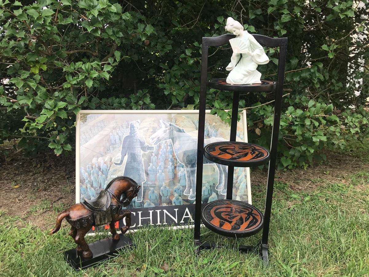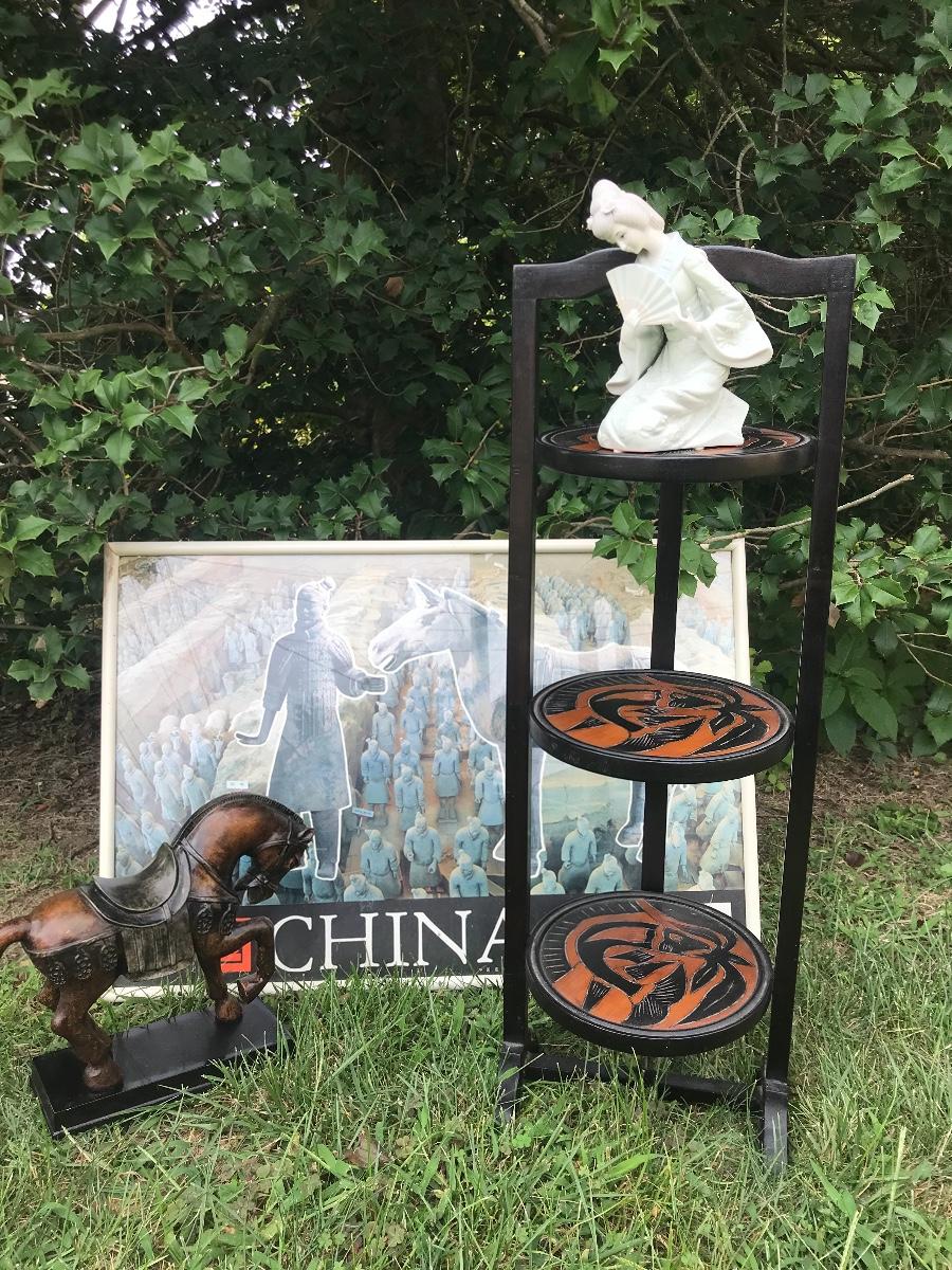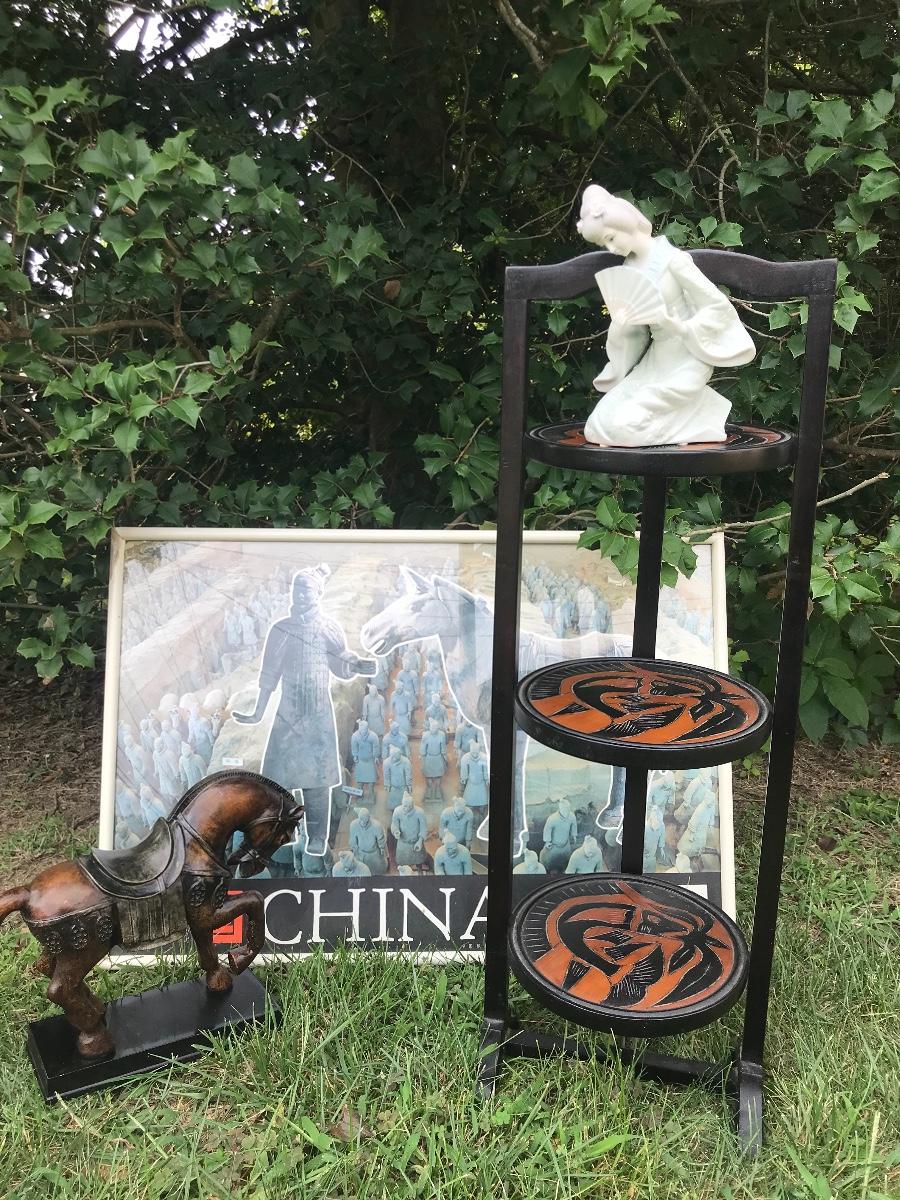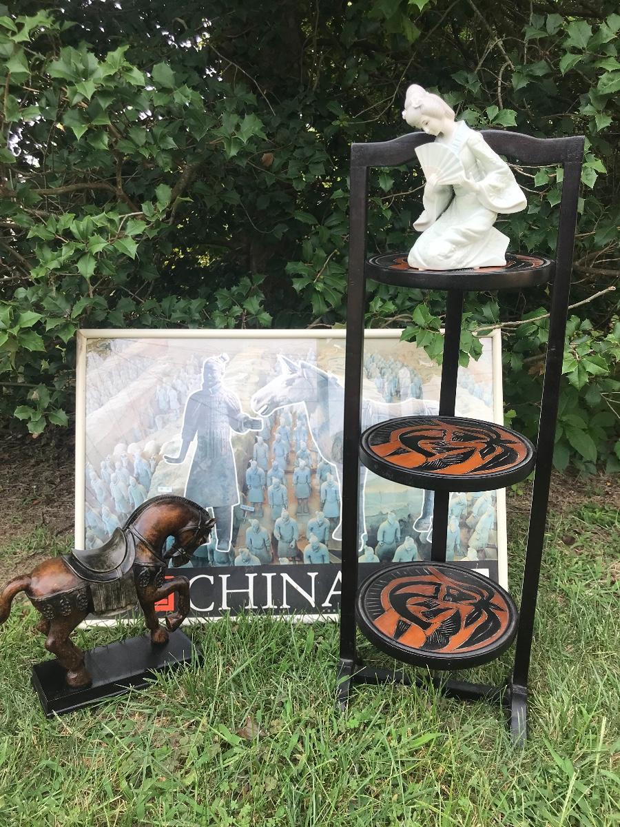 Framed print from China Tourist Department, 30x21, a statue of horse of China, porcelain girl, and a wooden folding shelf, 31 inches tall. The pictures show condition, measurements if taken, and what is included in the lot. Due to the large amount that we photograph and the time frame, we are not always able to take measurements. All items unless noted, are pre-owned and have been used. If you purchased furniture, you must bring help. We do not allow one person to carry large furniture out on their own. Bring help, tools and a truck for the safety of our client’s homes, and your personal safety. Company policy. Thank you.