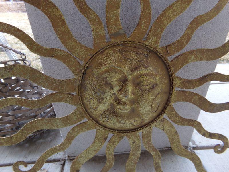 3 OUTDOOR DECORATIONS. A METAL FACE WALL ORNAMENT, METAL MILK CAN, WEAVED BASKET WITH HANDLE. SMALL ALUMINUM STEP LADDER.