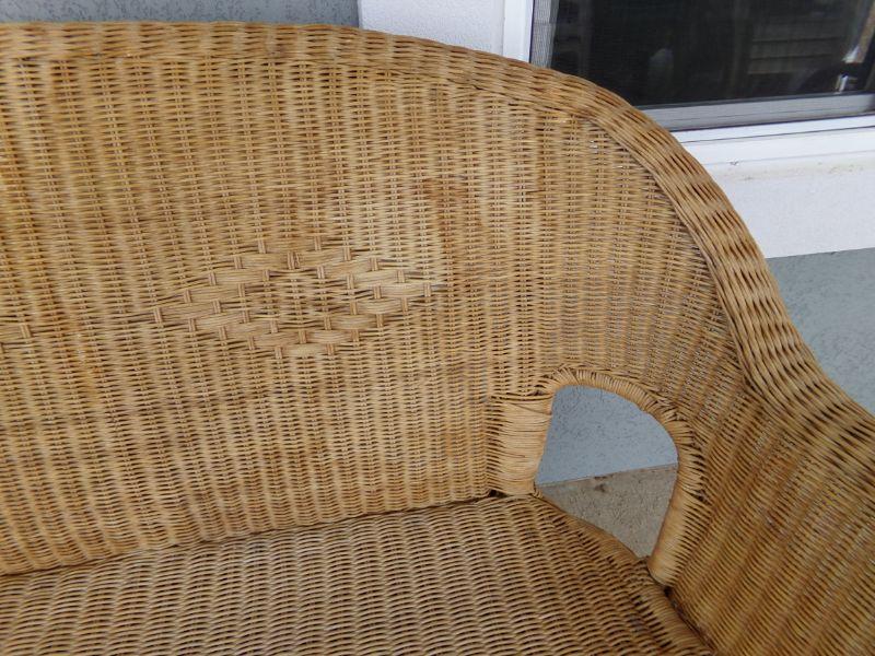 OUTDOOR WICKER LOVESEAT. HAS SOME WEATHERING. HAS A FEW SPOTS WHERE THE WICKER IS STARTING TO CRACK. COMES WITH SEAT CUSHION AND 2 THROW PILLOWS. MEASURES 34"H x 52-1/2"W x 29"D