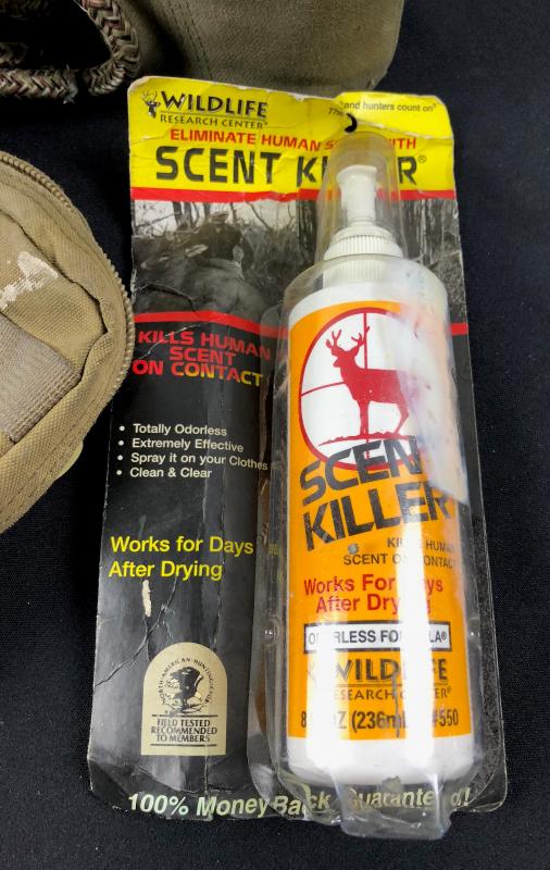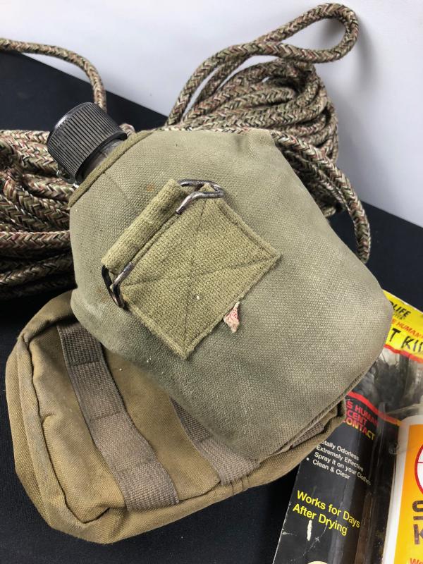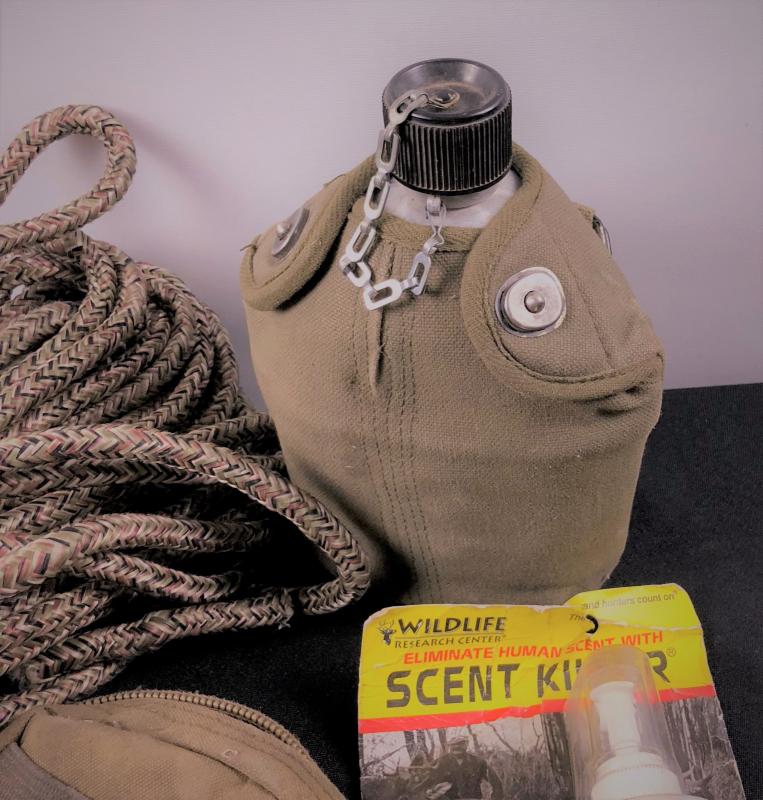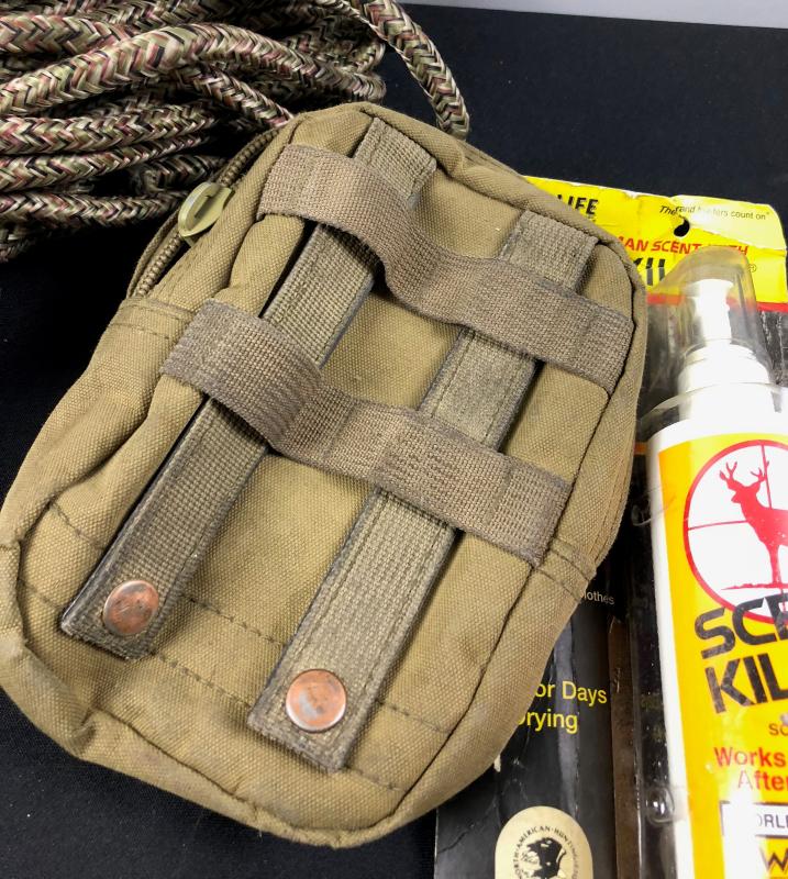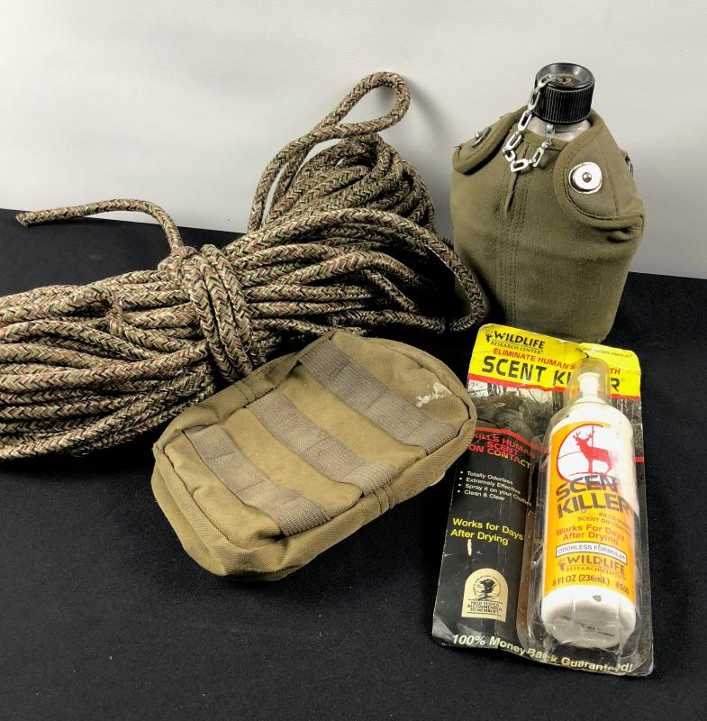 Canteen..Canvas Pouch..Rope and Scent Killer on this hunting/fishing outdoorsman lot...