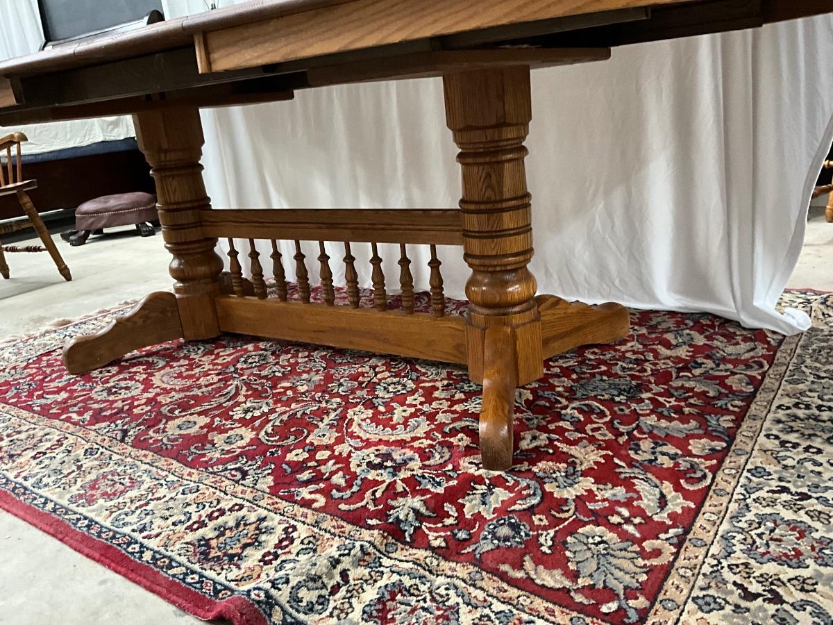 Vintage Richardson Brothers Company Oak Dining Table. Mission style arts and crafts country trestle with 2 leaves. Measuring 41 inches wide, 68 inches long, 30 inches high and each leaf measures 11 inches.