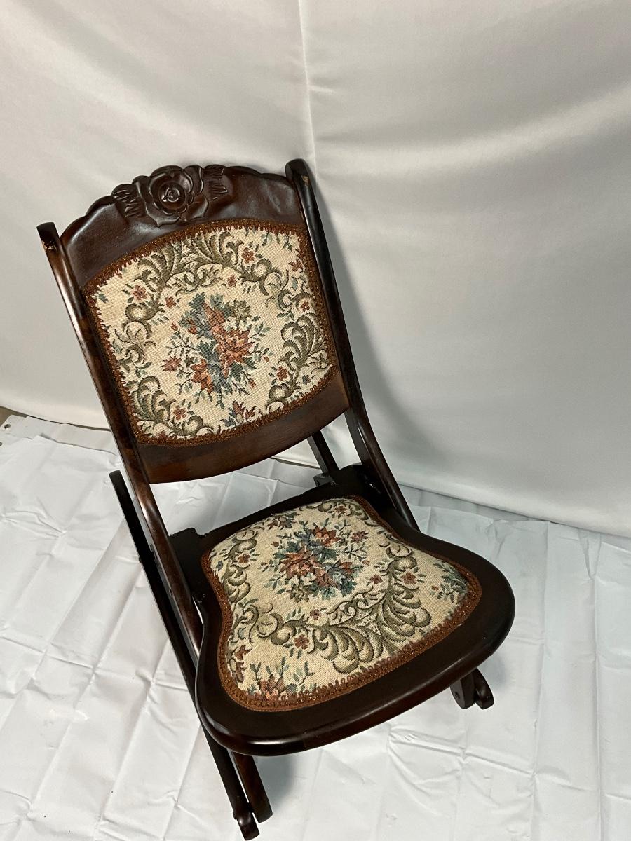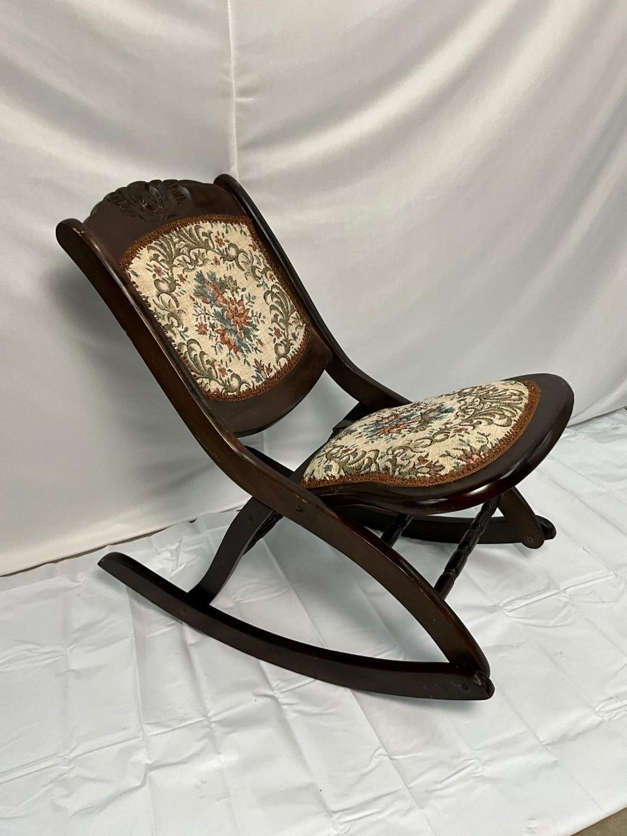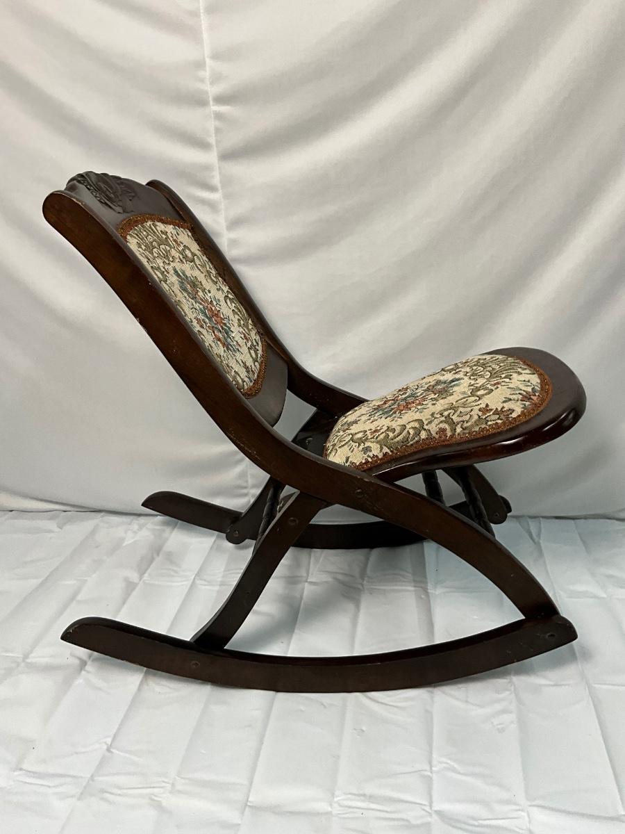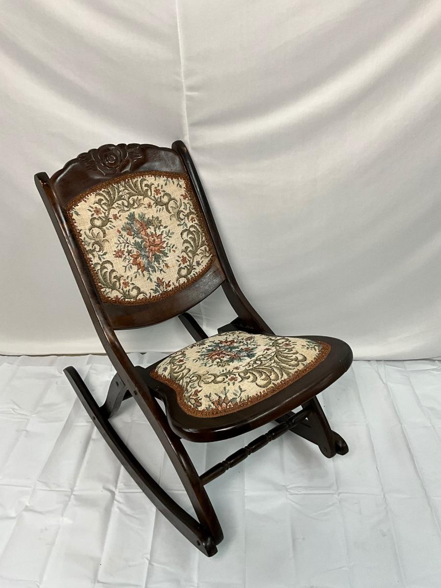 Lot P 660 Vintage Folding Sewing/Nursery Wooden Rocking Chair with Floral Tapestry Upholstery Back/Seat