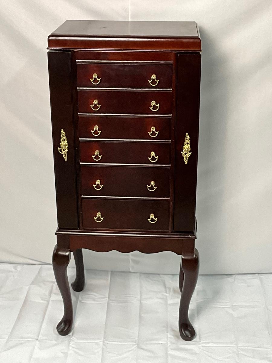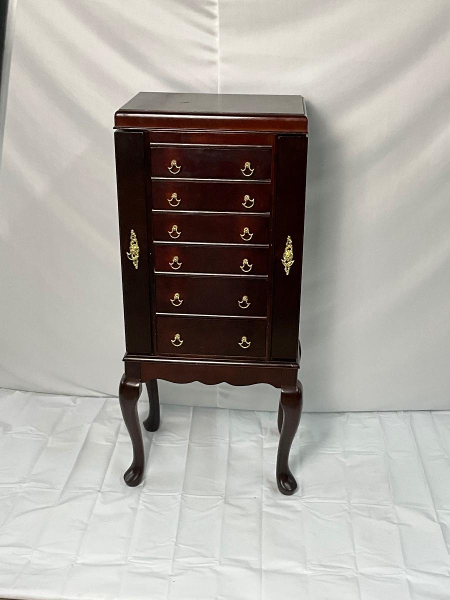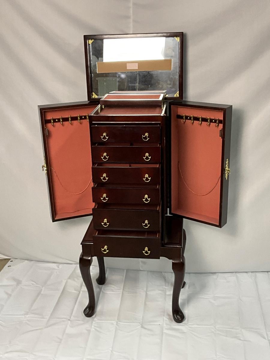 Lot P 669 Six Drawer Wooden Floor Standing Jewelry Armoire with Mirrored Lid and Wing-Open Sides