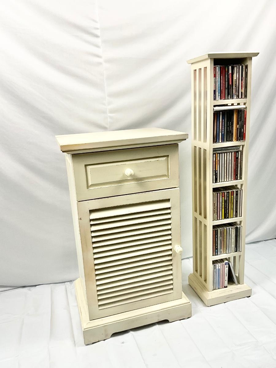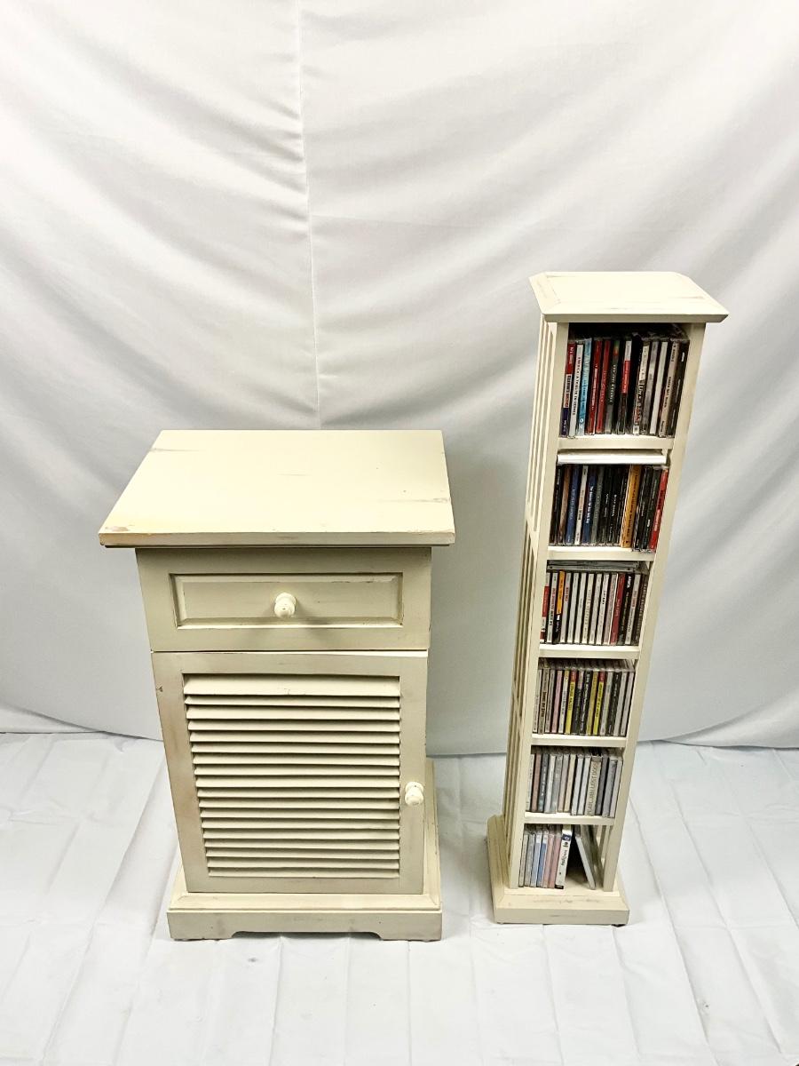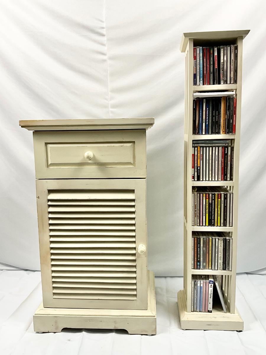 Lot P 674 Vintage Pier 1 Imports Off-White Distressed Nightstand & Pier 1 Imports Off-White Distressed CD Stand with CD’s