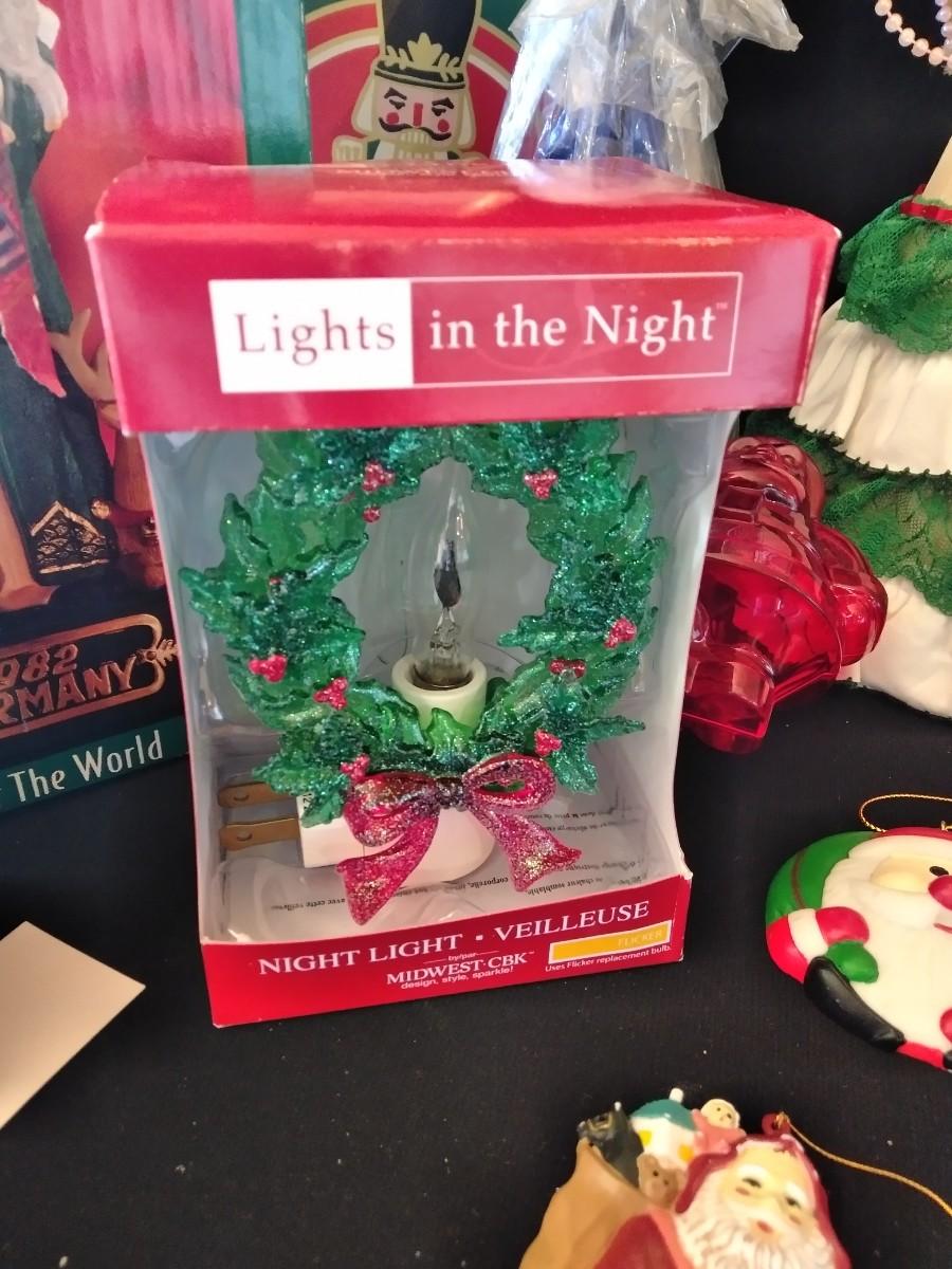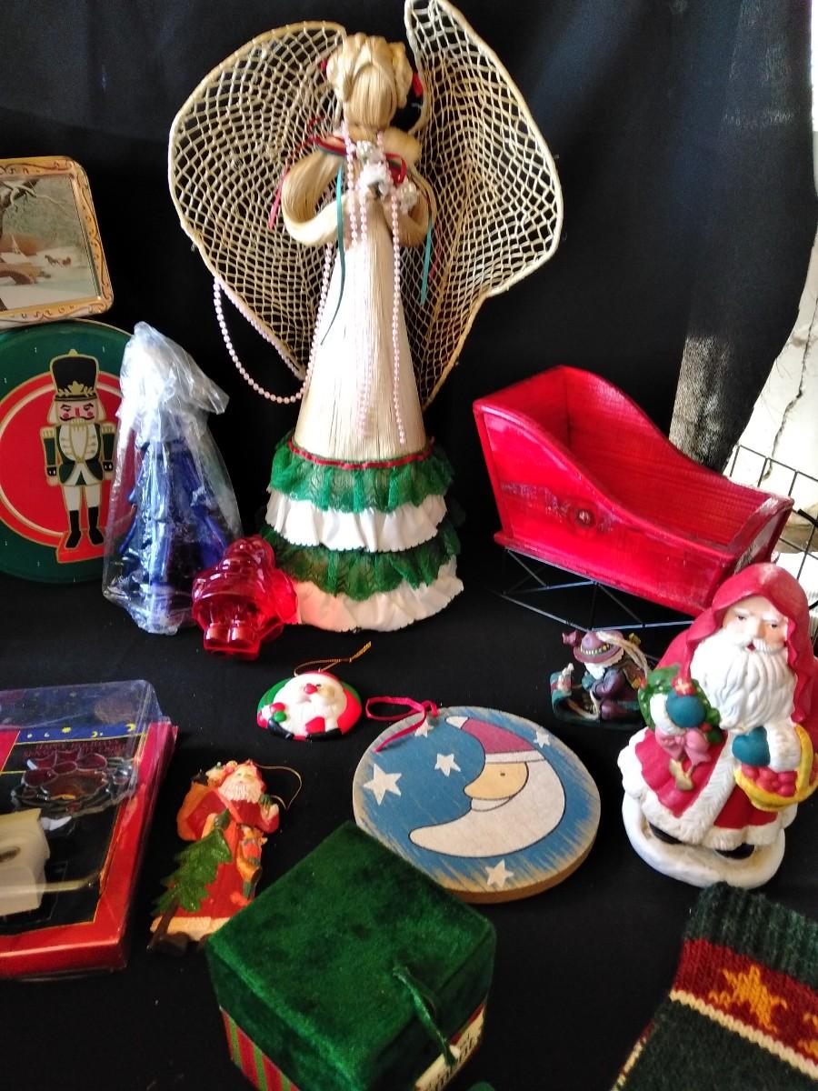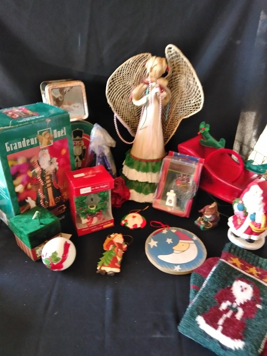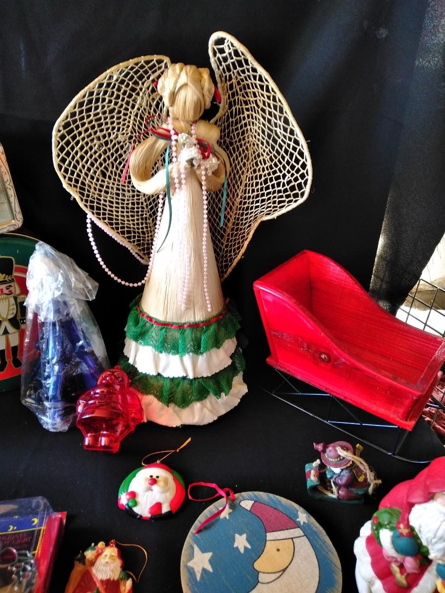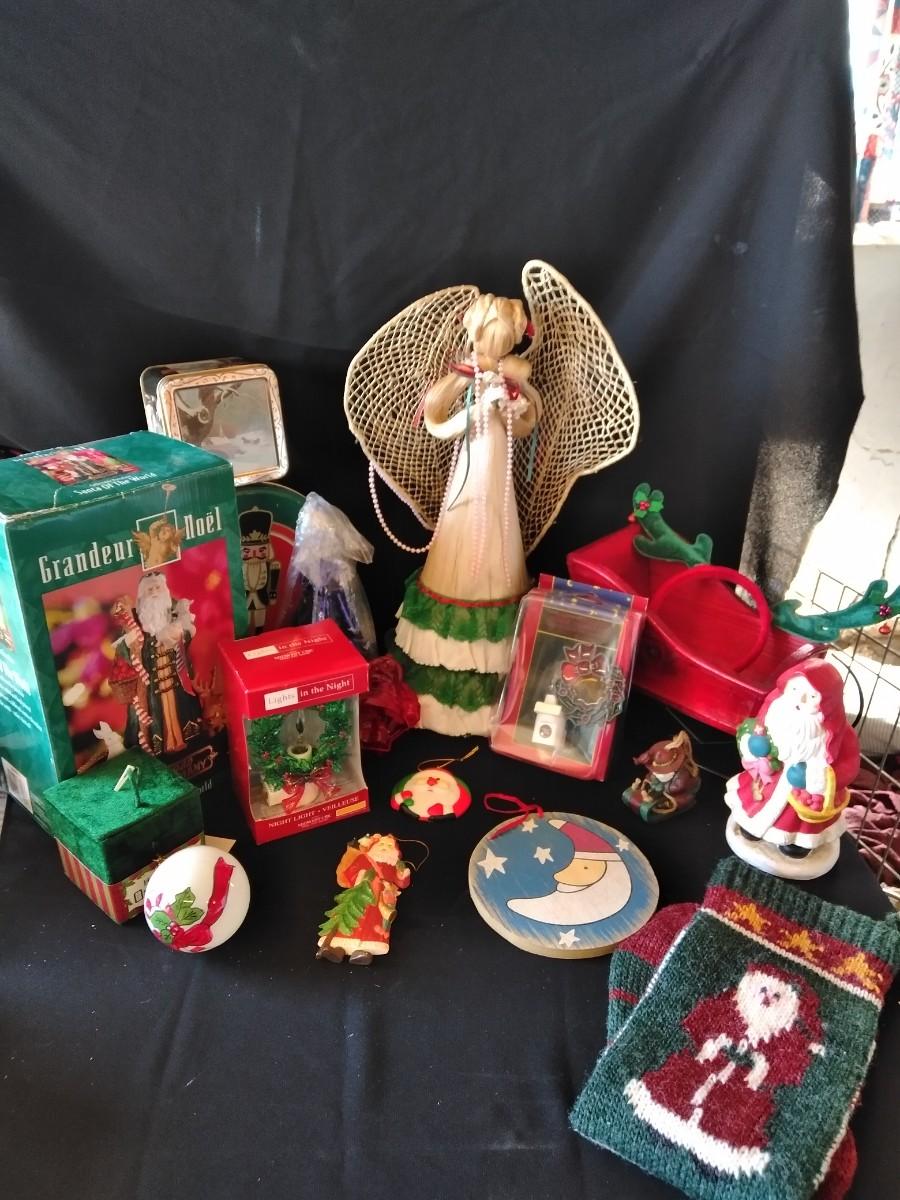 CHRISTMAS DECORATIONS, INCLUDING ANGELS, SANTA'S, NEW NIGHT LIGHTS, STOCKINGS, WOODEN SLEIGH AND MORE
