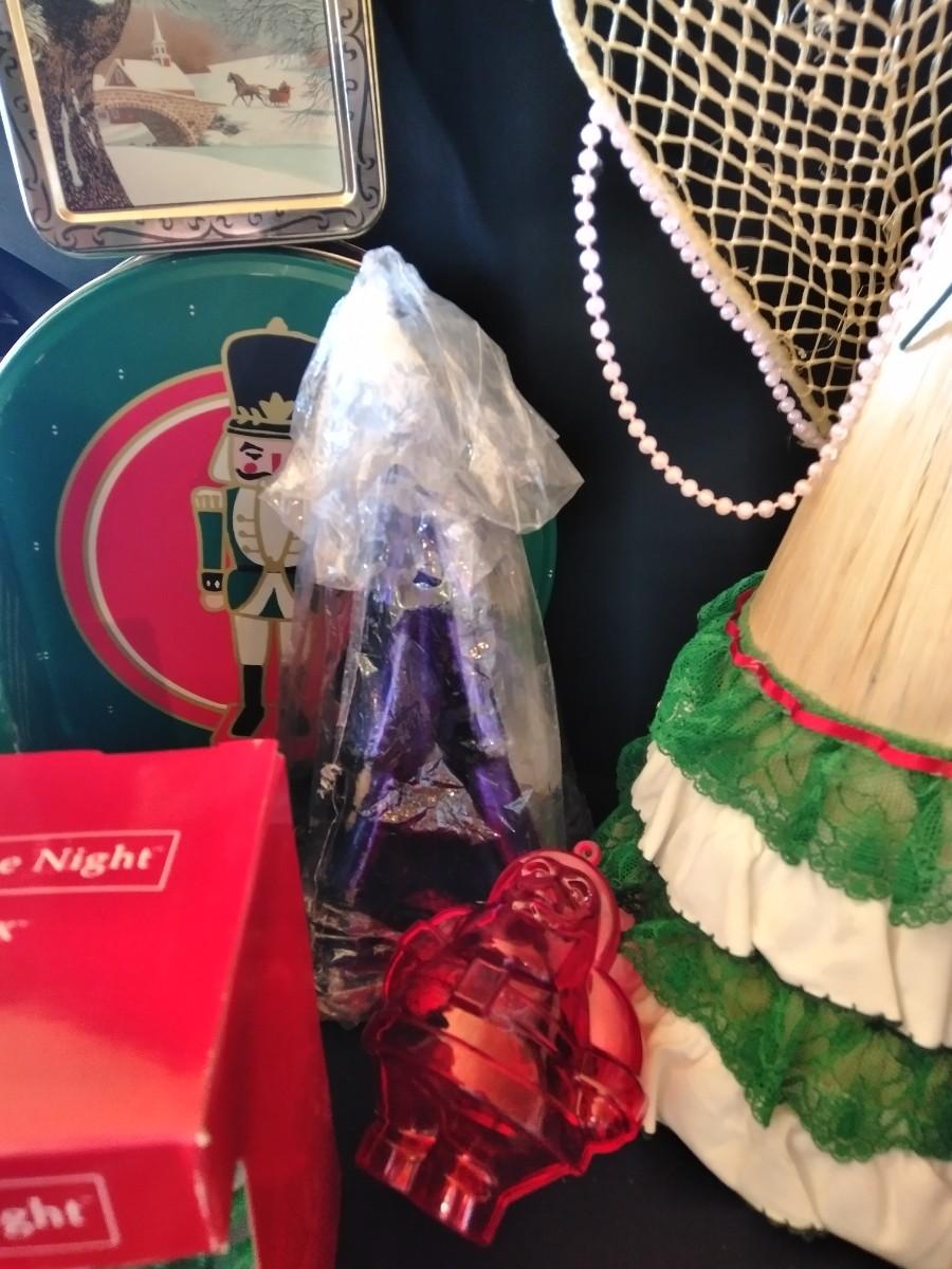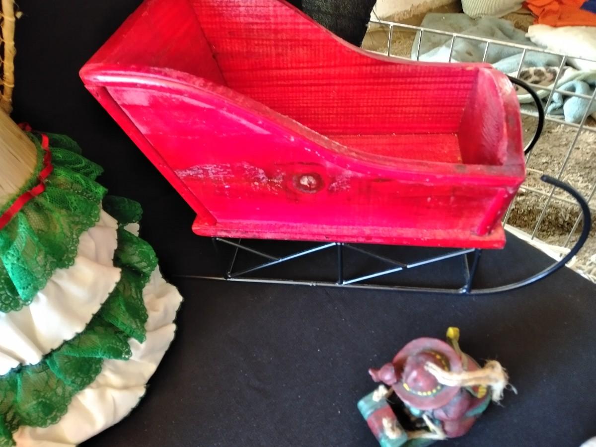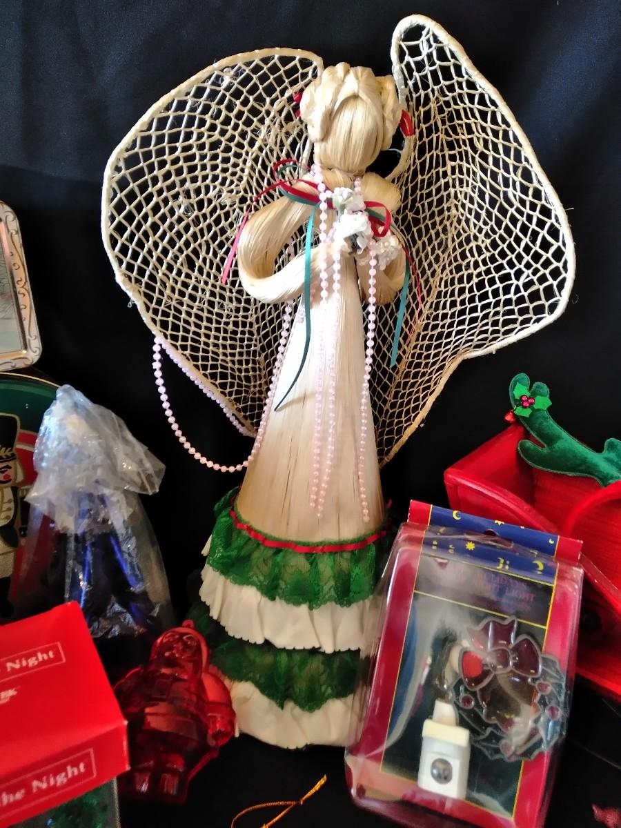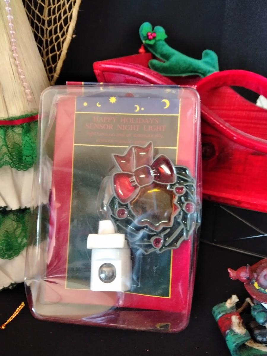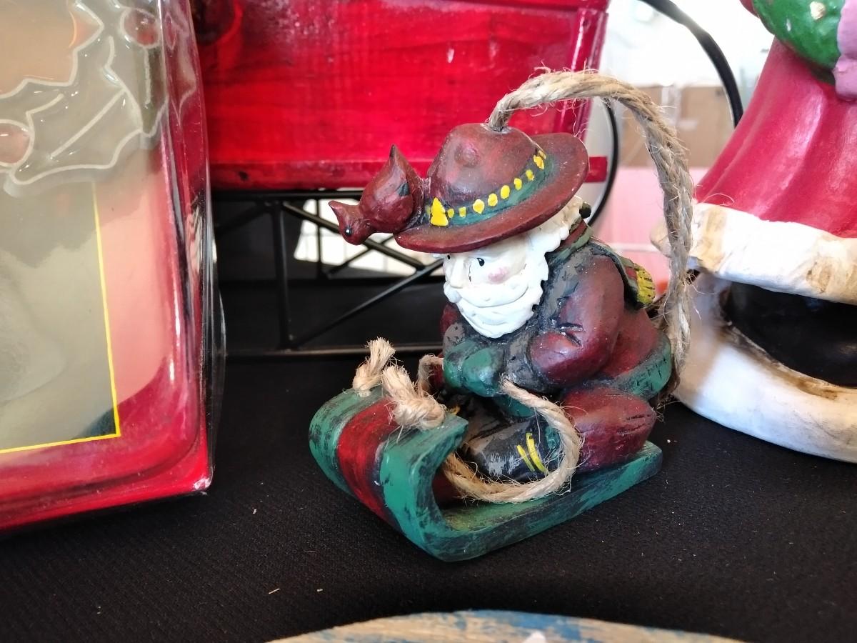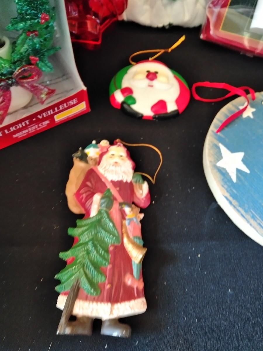 CHRISTMAS DECORATIONS, INCLUDING ANGELS, SANTA'S, NEW NIGHT LIGHTS, STOCKINGS, WOODEN SLEIGH AND MORE