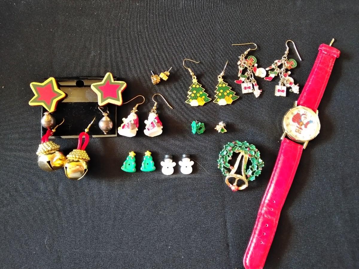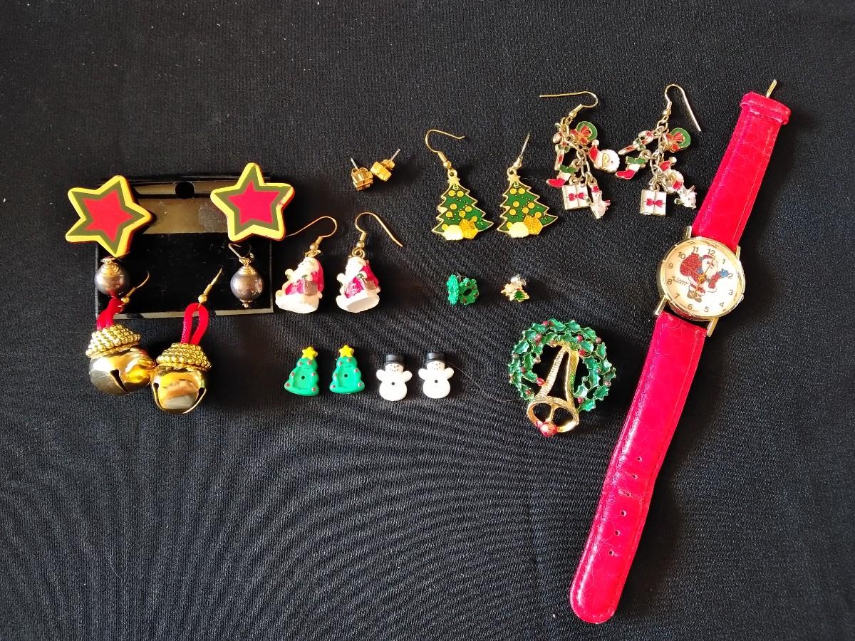 CHRISTMAS THEMED PIERCED EAR RINGS, WATCH, PIN, AND MORE