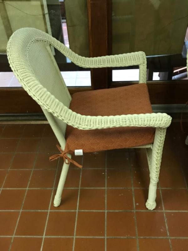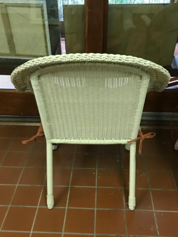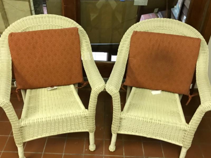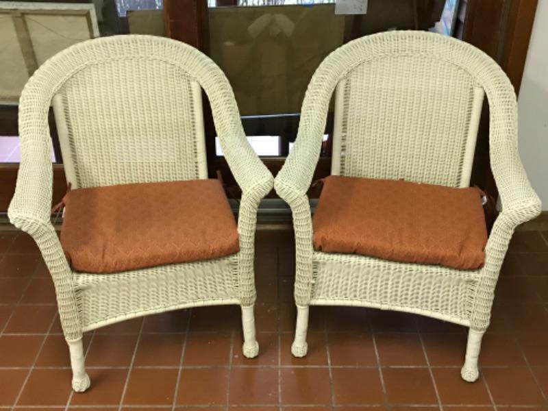 Pair of poly resin wicker style armchairs measuring approximately 36” tall 28” wide 19” deep and 18” seat height. Included are two cushions by Plantation Patterns