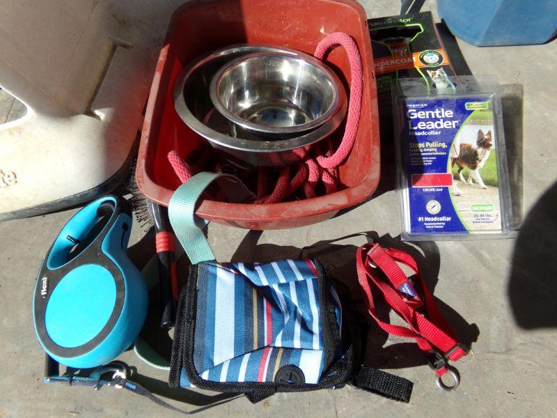 MEDIUM SIZED PETMATE DOG IGLOO, POOPER SCOOPER, BUCKETS, LEASHES, BOWLS, DOG COMBS AND MORE.