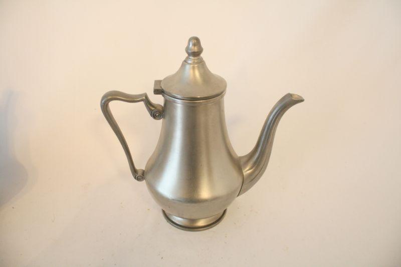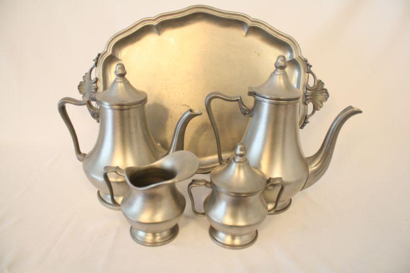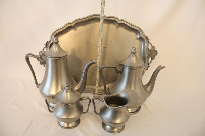 Pewter Tea Set - Five piece pewter set for tea and coffee service. Includes Two teapots, one milk jug, and one sugar bowl with lid. The four pieces are stamped on the bottom, while the tray is not marked.