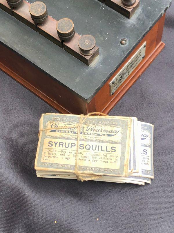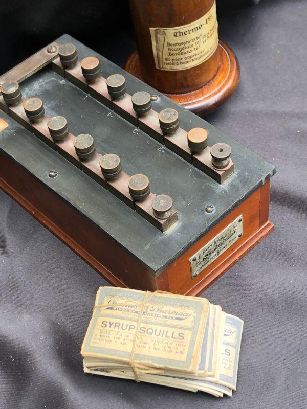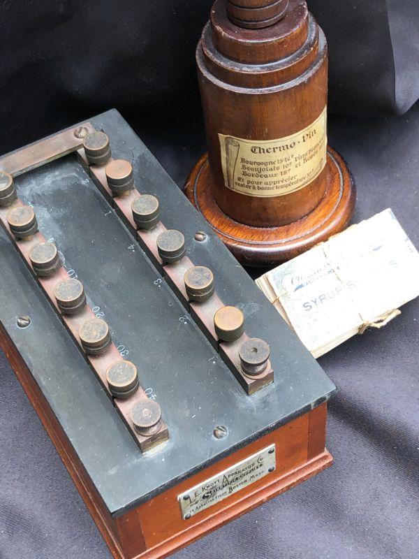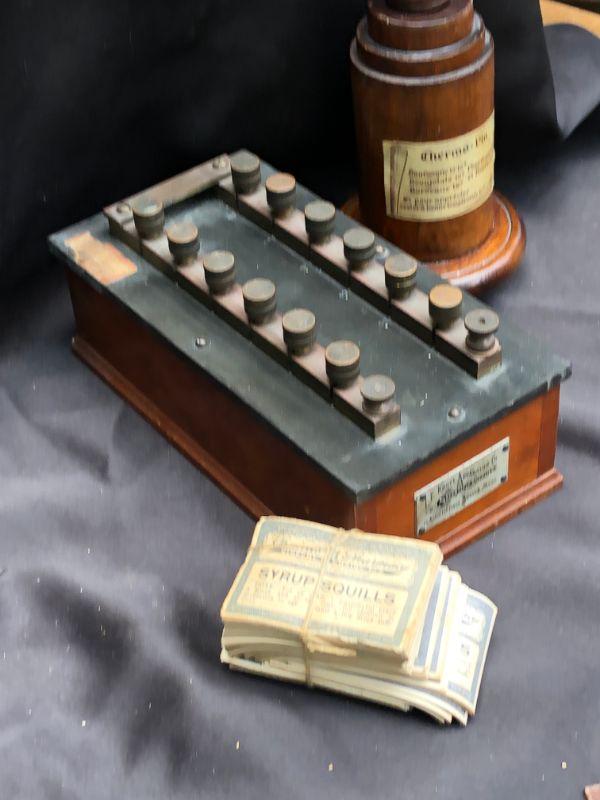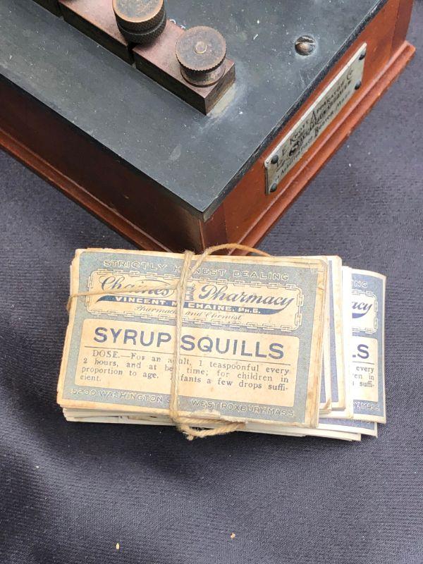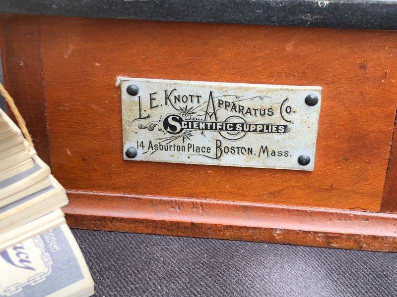 Lot of Pharmaceutical Instruments L.E. Knott Apparatus Co Scientific Supplies Resistor Test Unit, Thermometer in Wood Casing and Original Pile of Labels. All labels are identical.