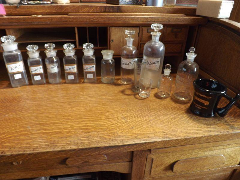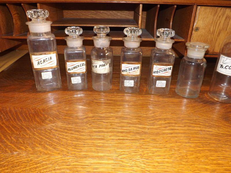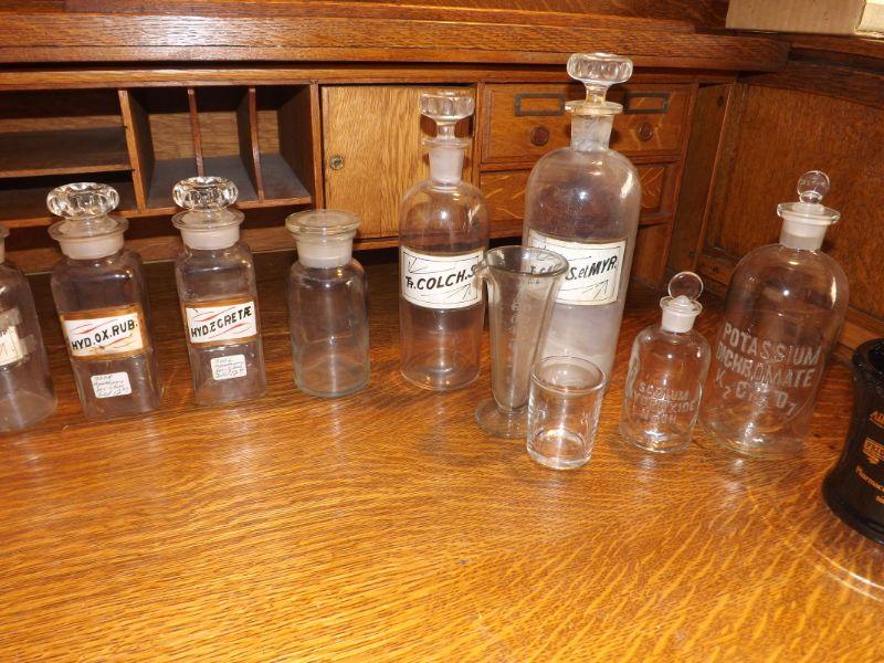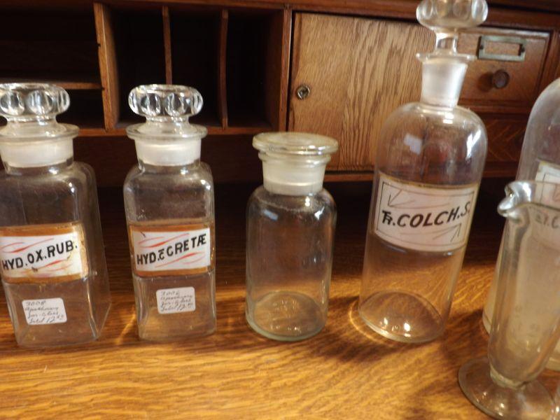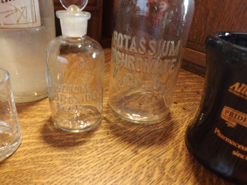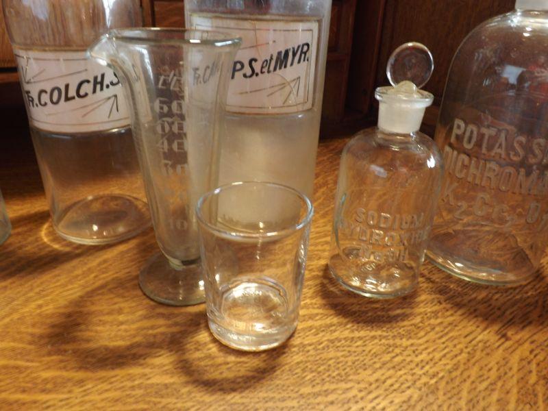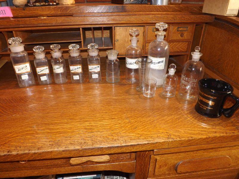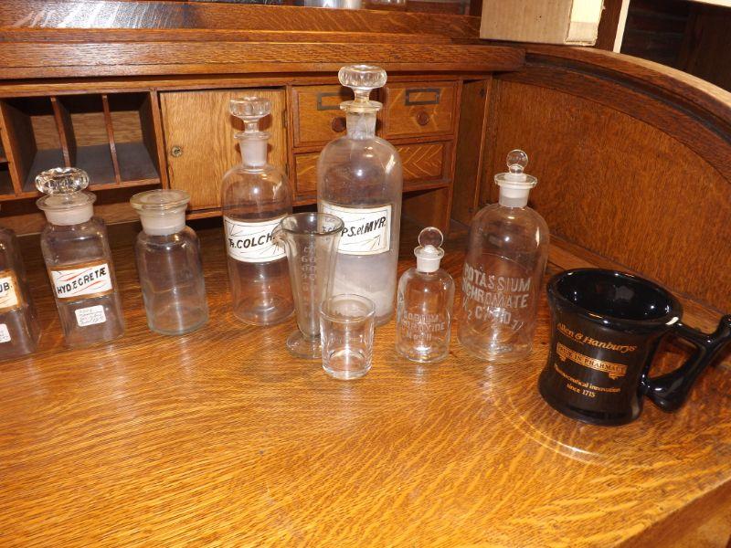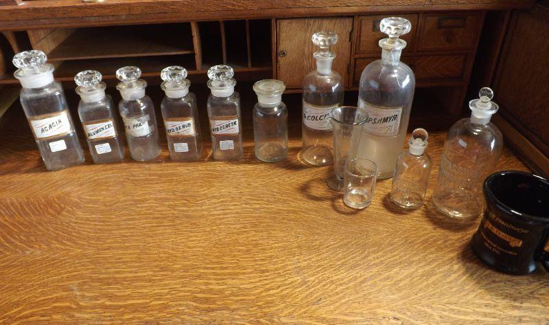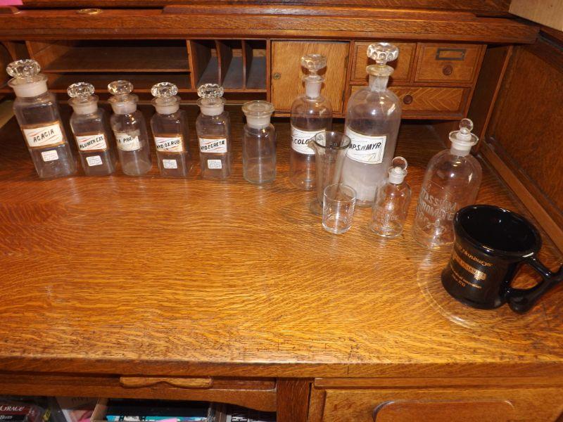 SEVERAL LABELED PHARMACY APOTHECARY JARS, TWO SMALLER ETCHED JARS, BLACK PHARMACY COFFEE MUG