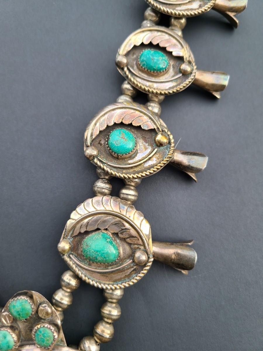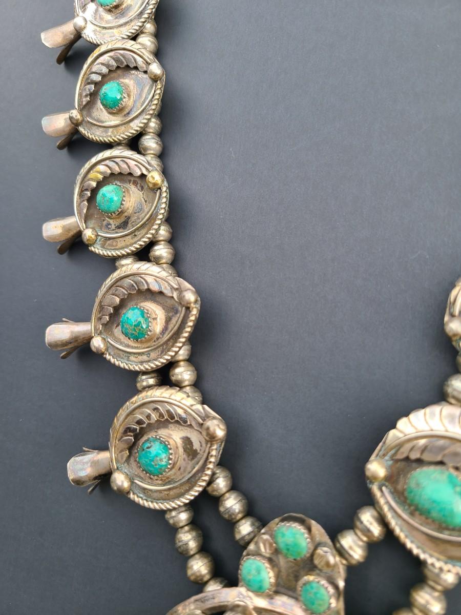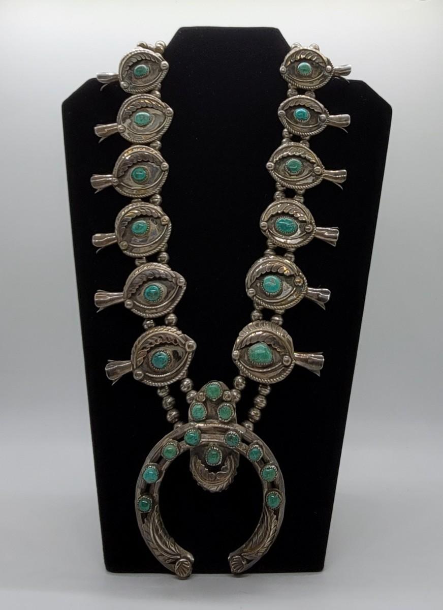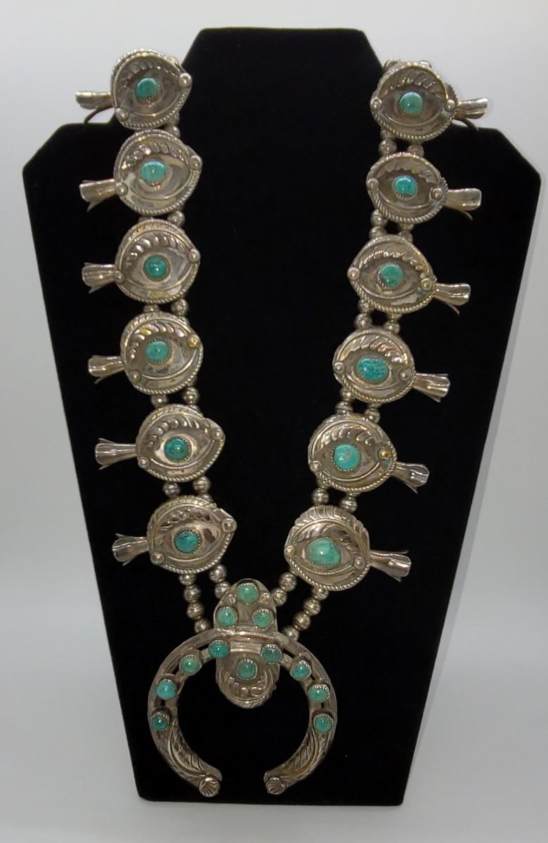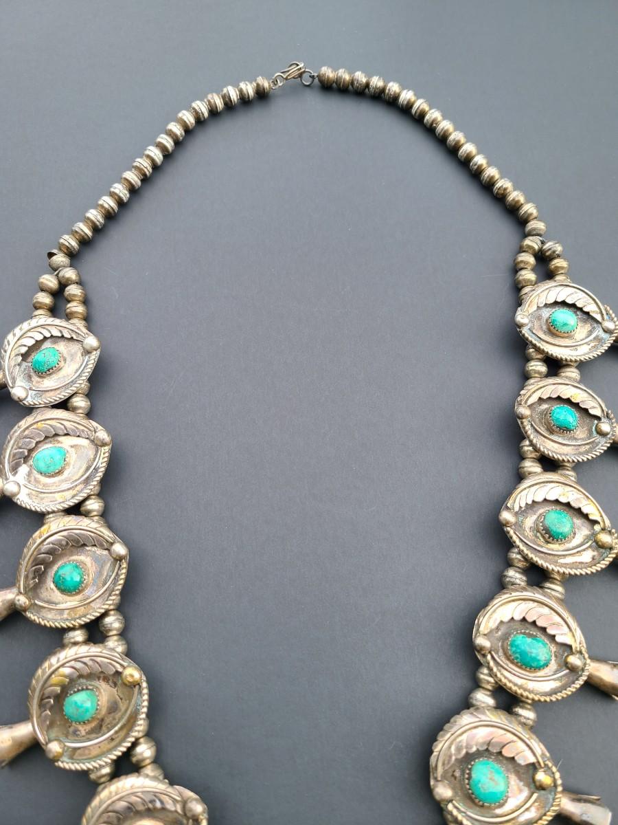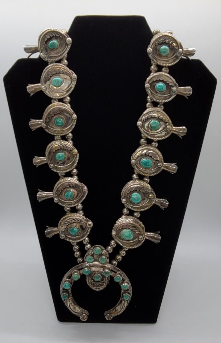 Lot PV 6: American Indian Southwestern Navajo Squash Blossom Turquoise and Silver necklace