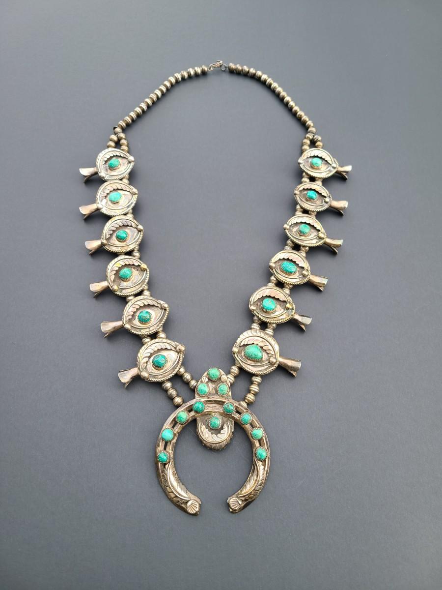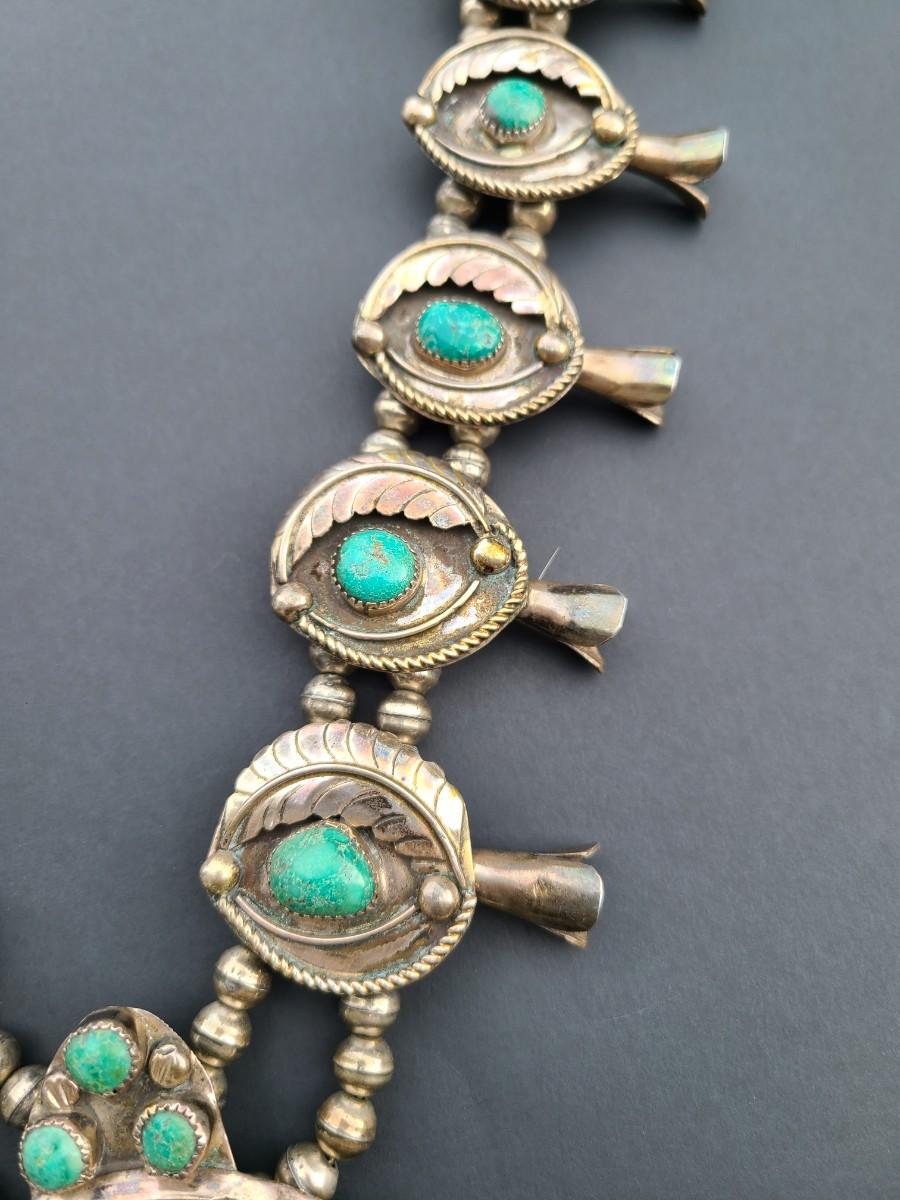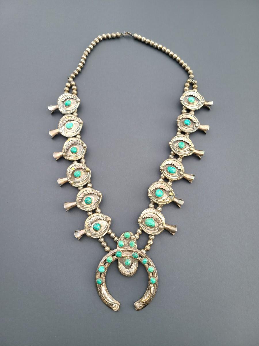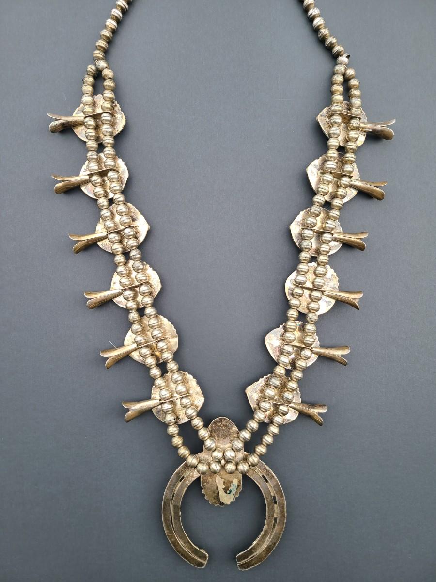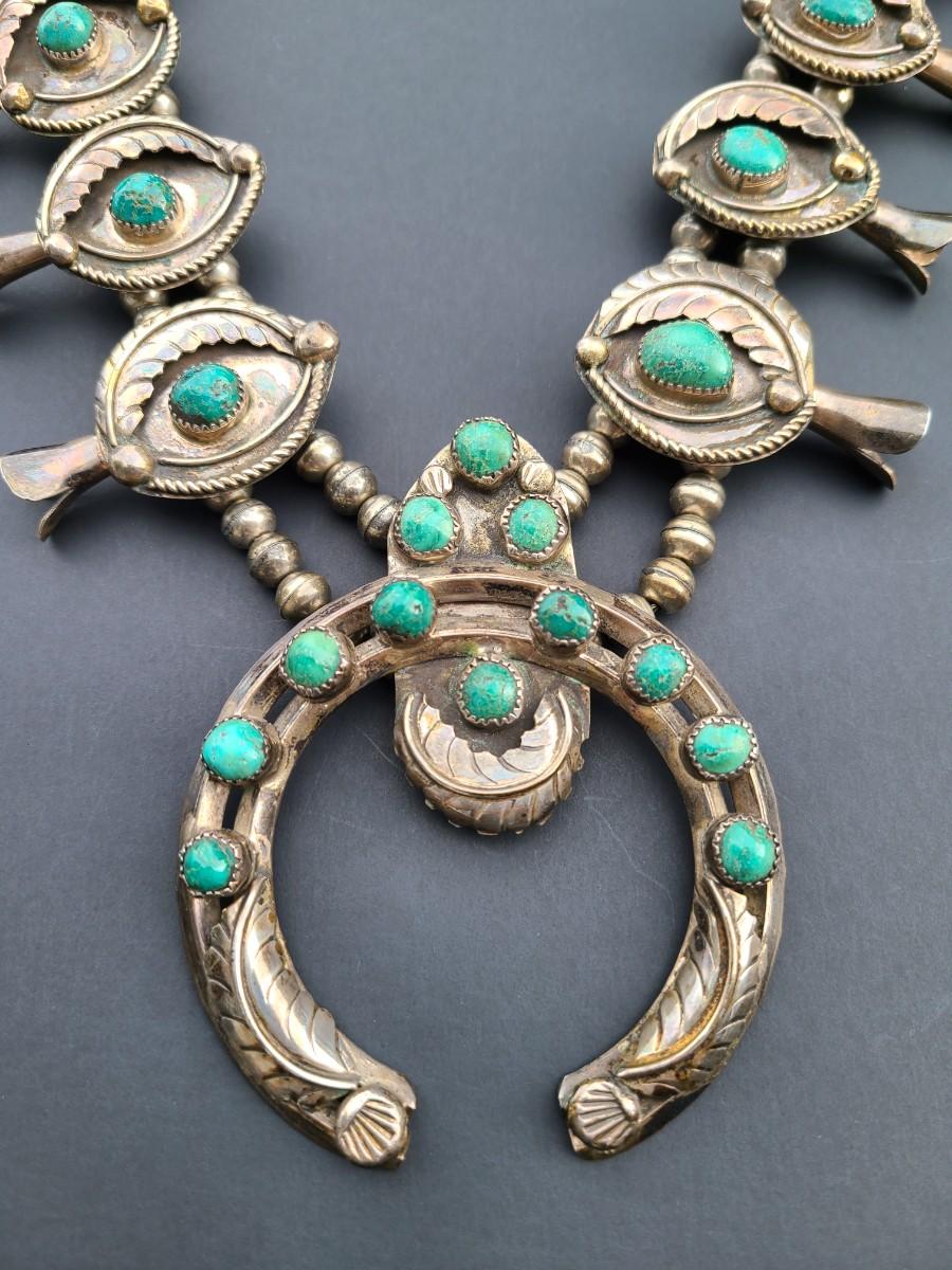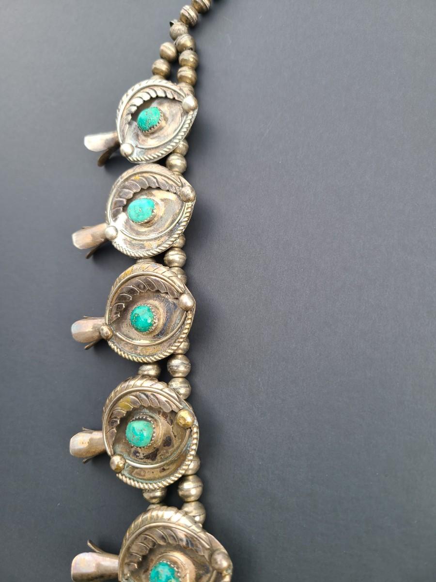 Lot PV 6: American Indian Southwestern Navajo Squash Blossom Turquoise and Silver necklace
