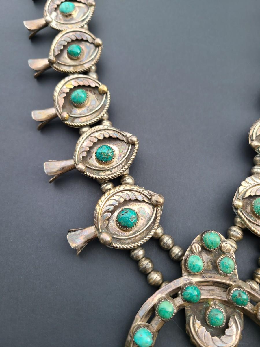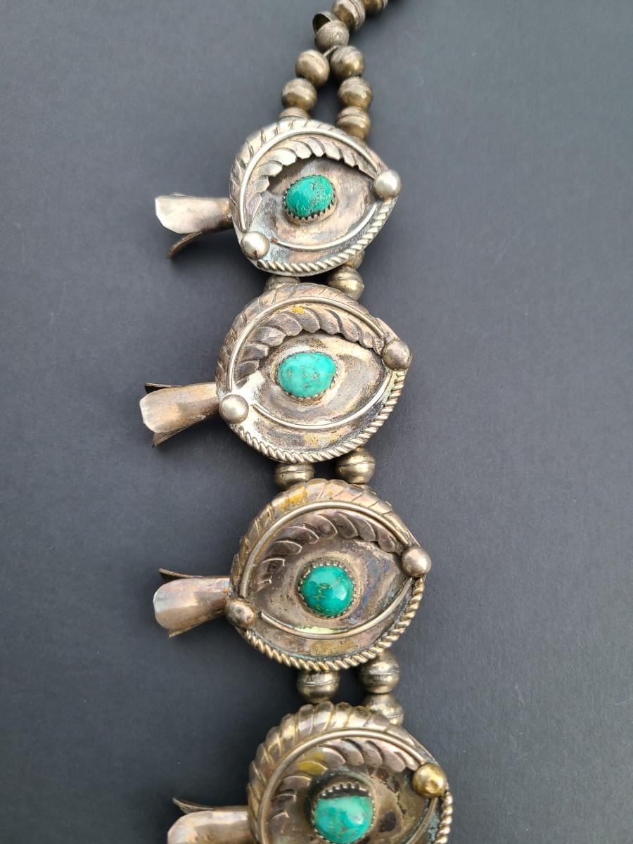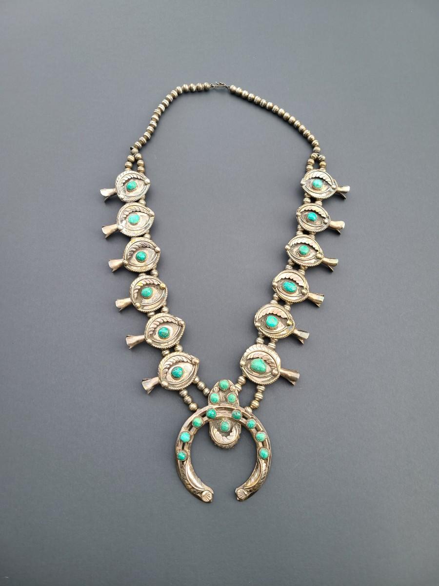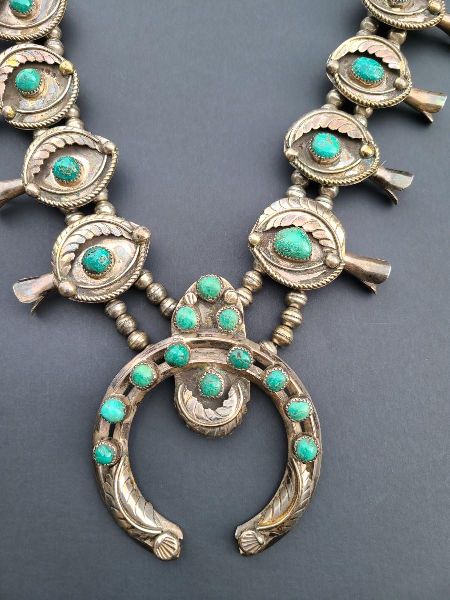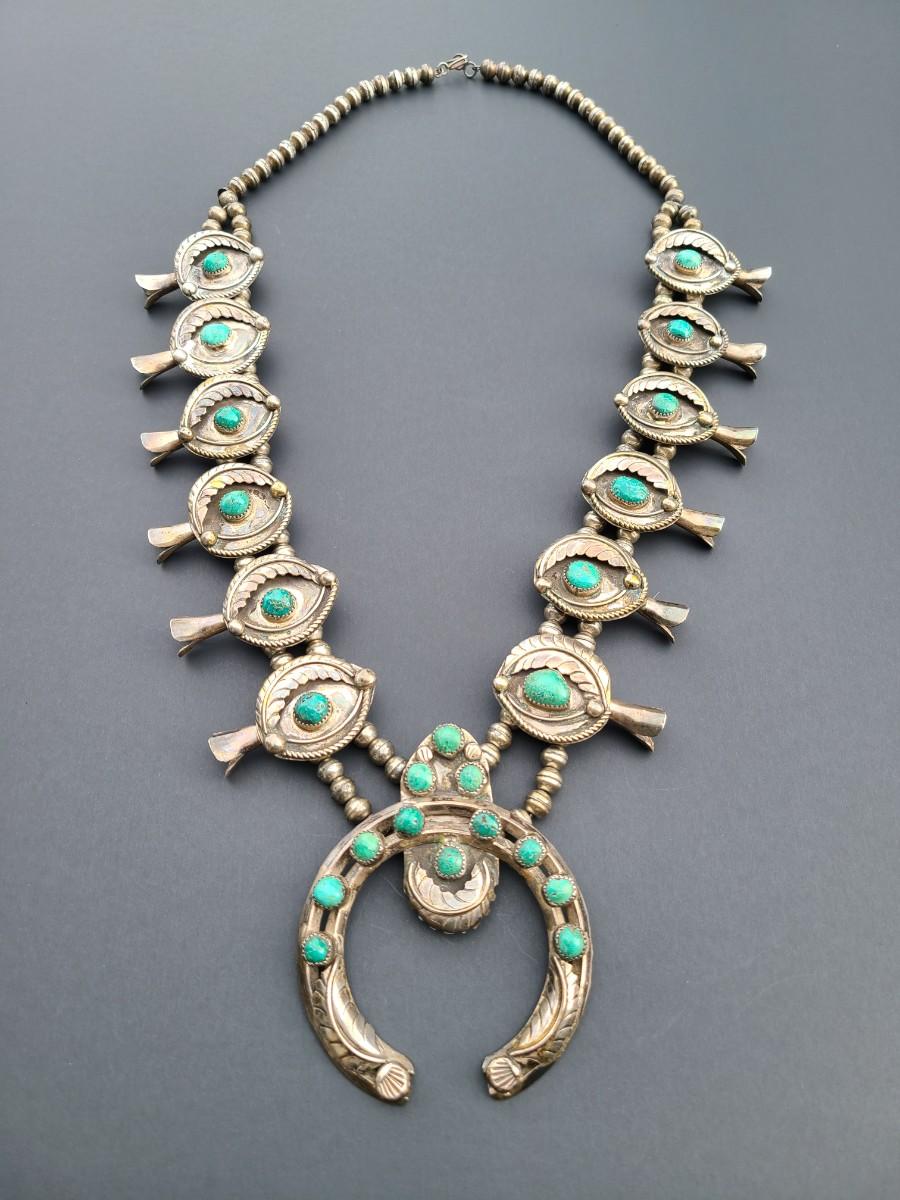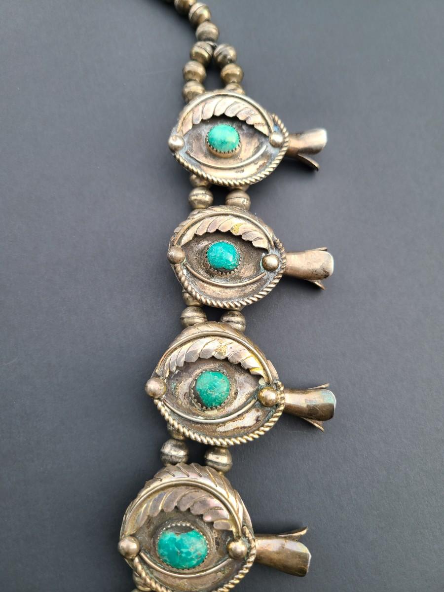 Lot PV 6: American Indian Southwestern Navajo Squash Blossom Turquoise and Silver necklace