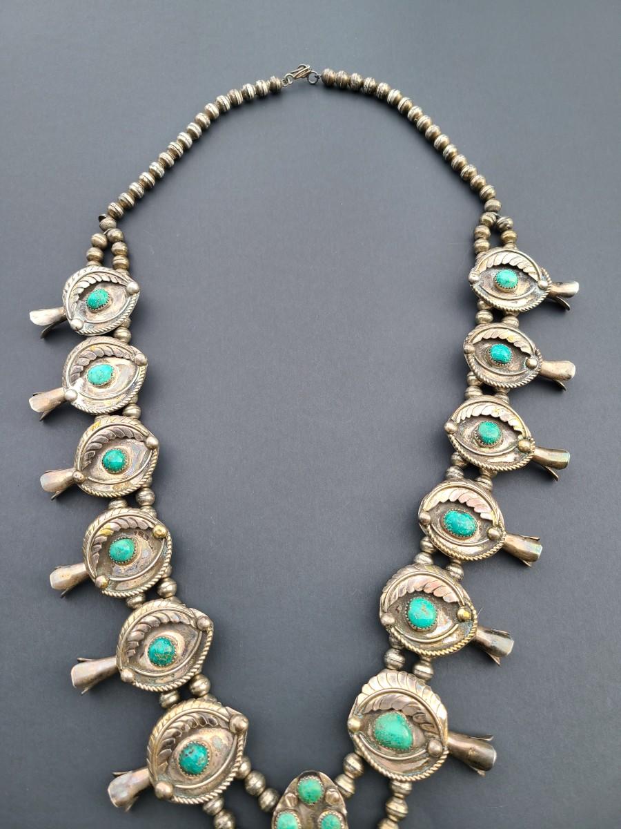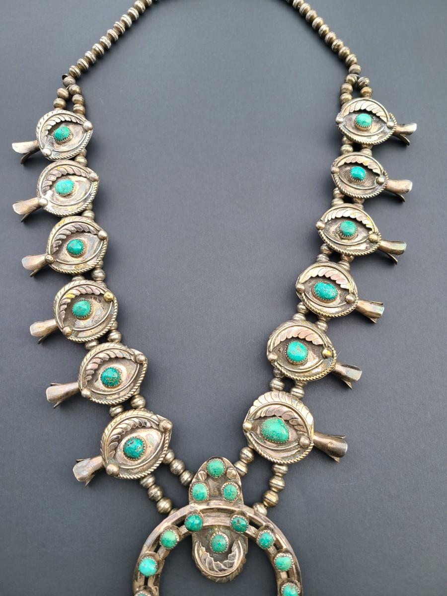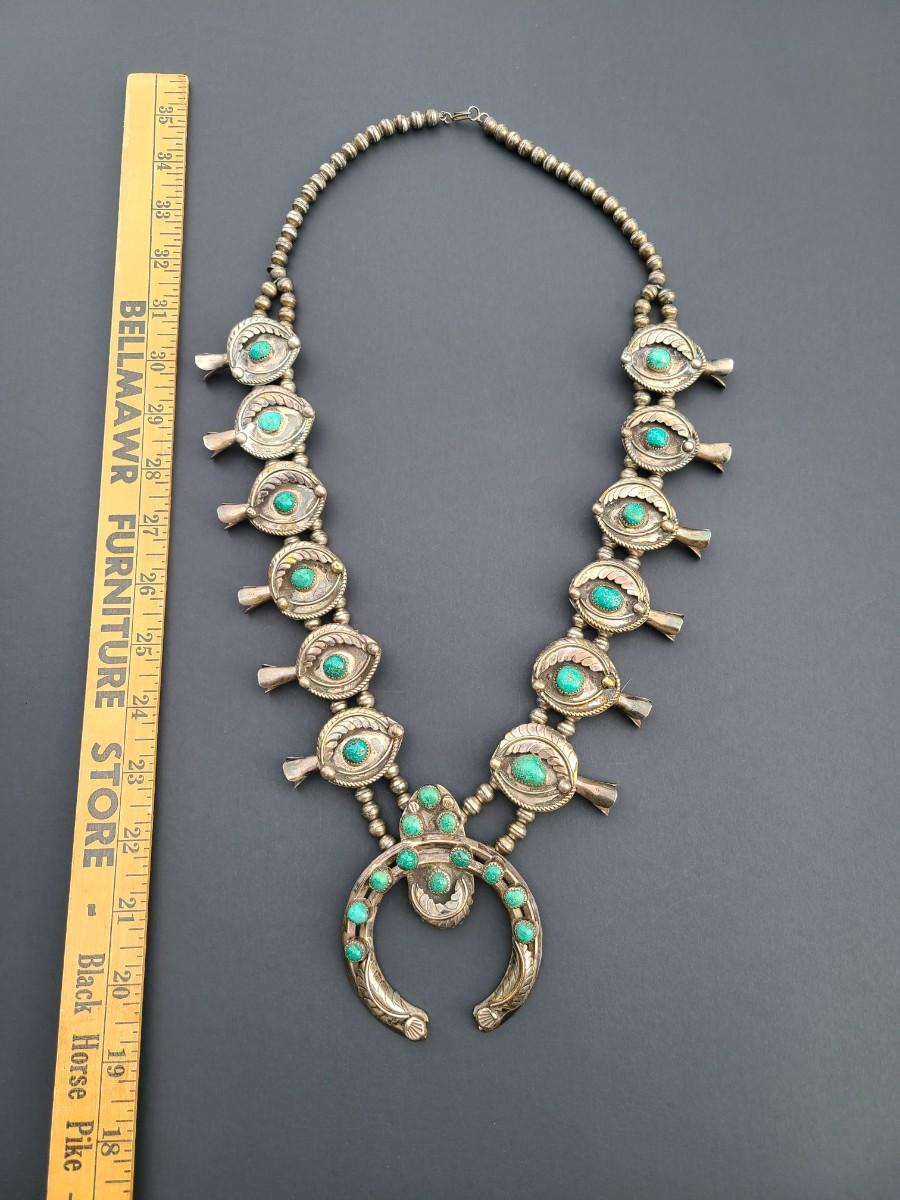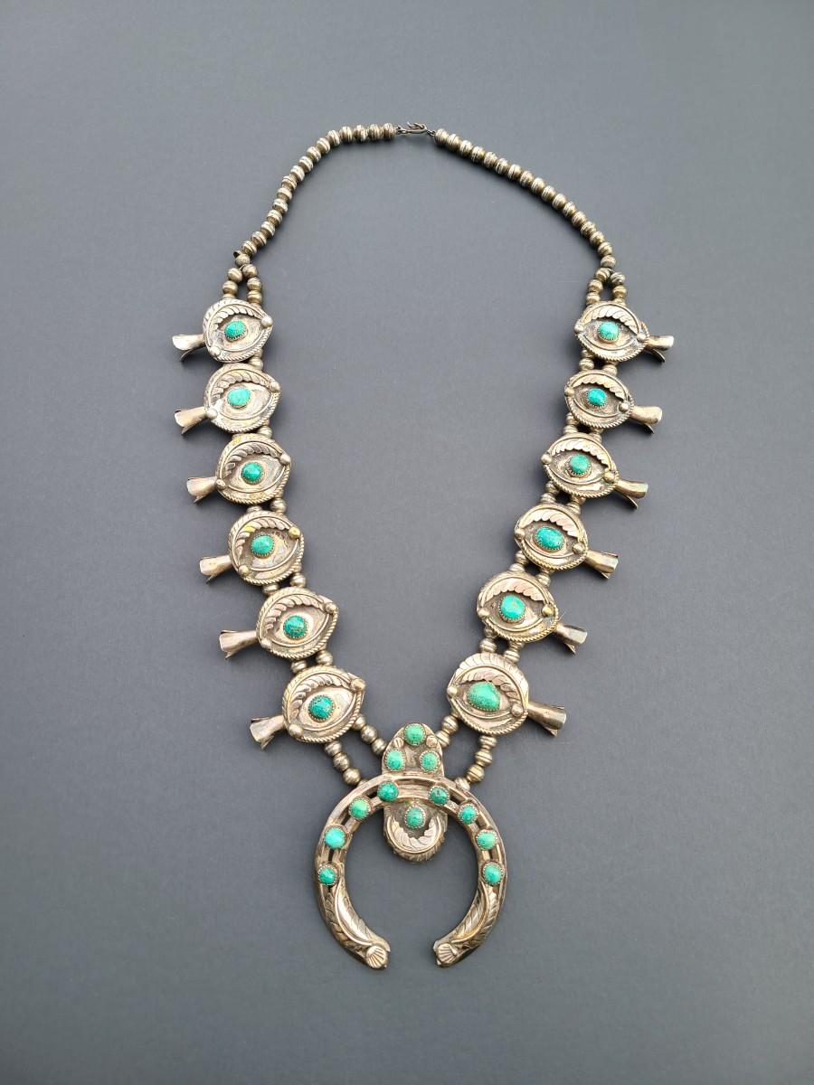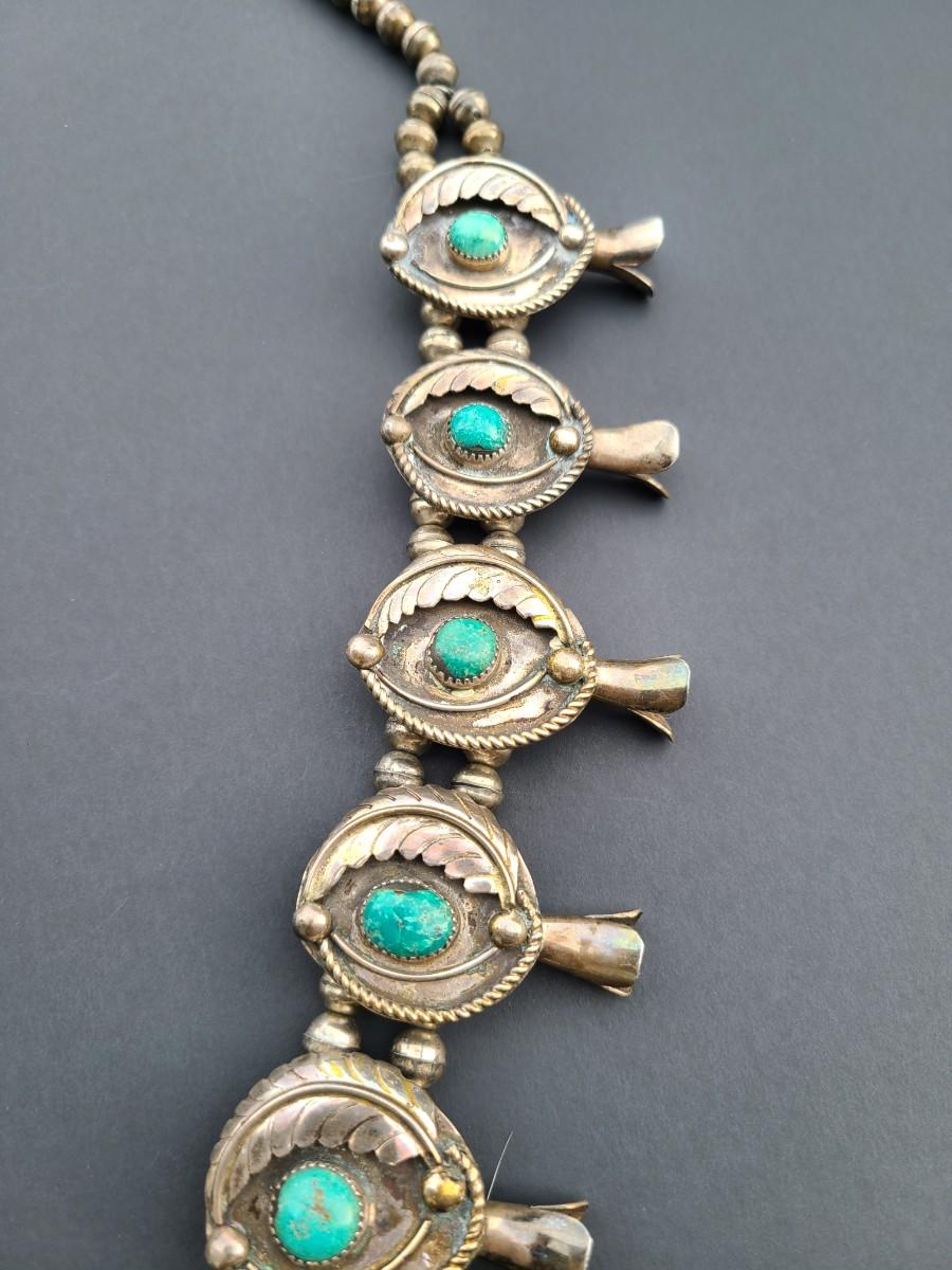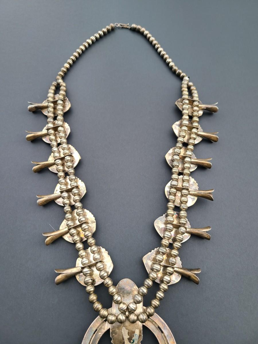 Lot PV 6: American Indian Southwestern Navajo Squash Blossom Turquoise and Silver necklace
