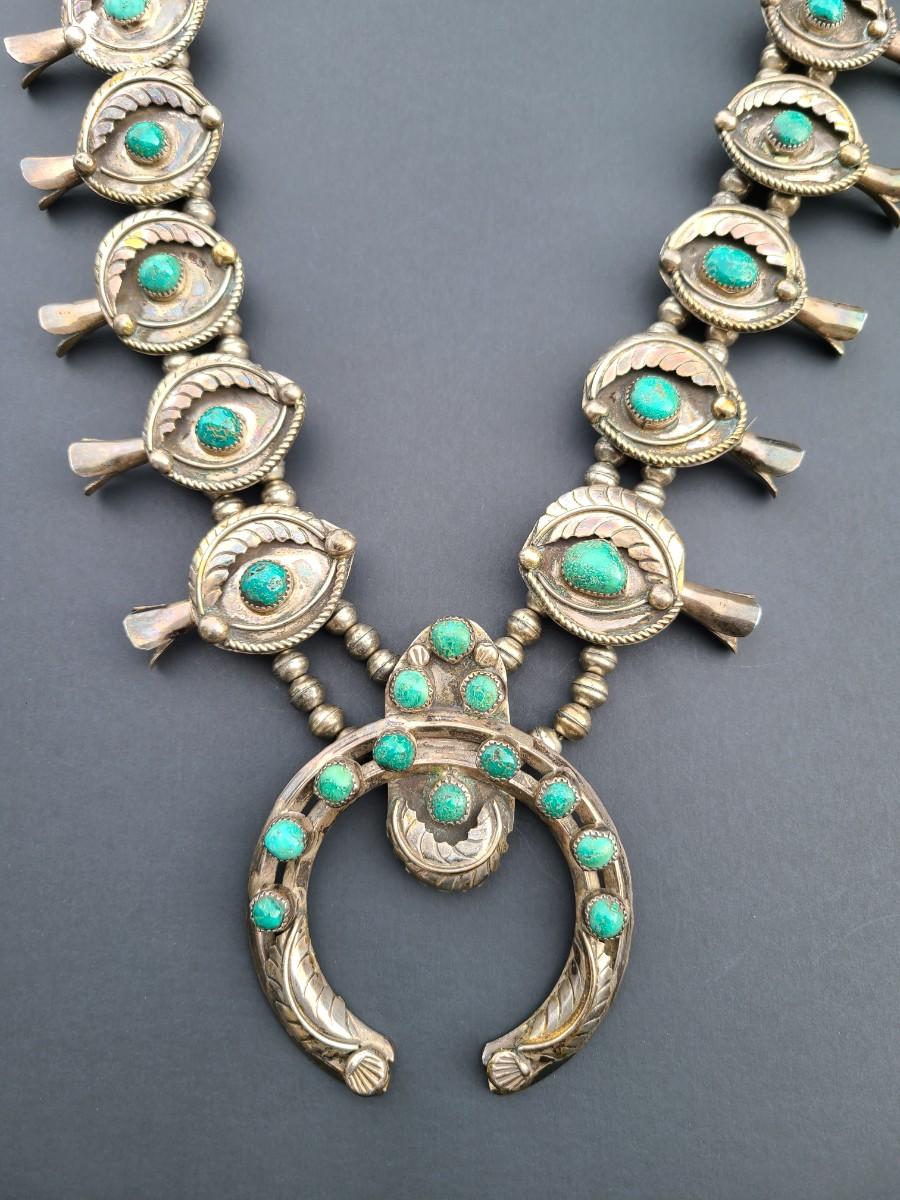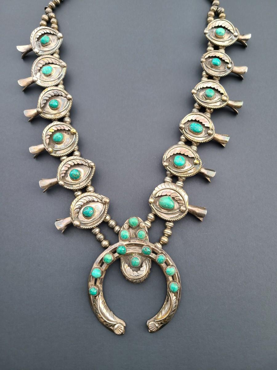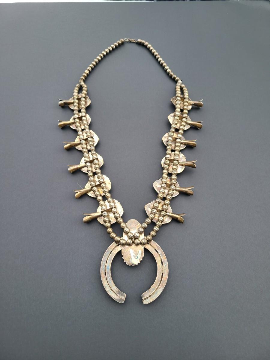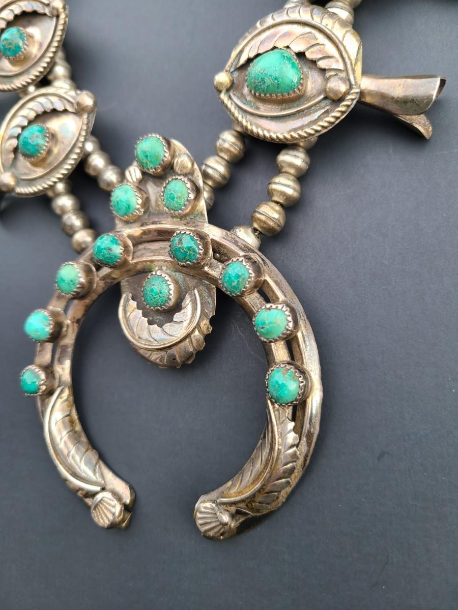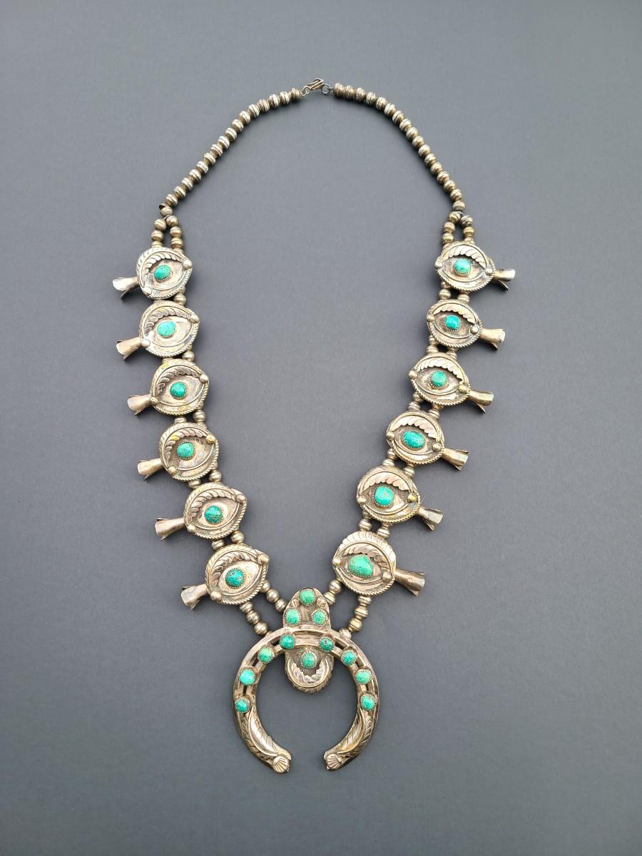 Lot PV 6: American Indian Southwestern Navajo Squash Blossom Turquoise and Silver necklace
