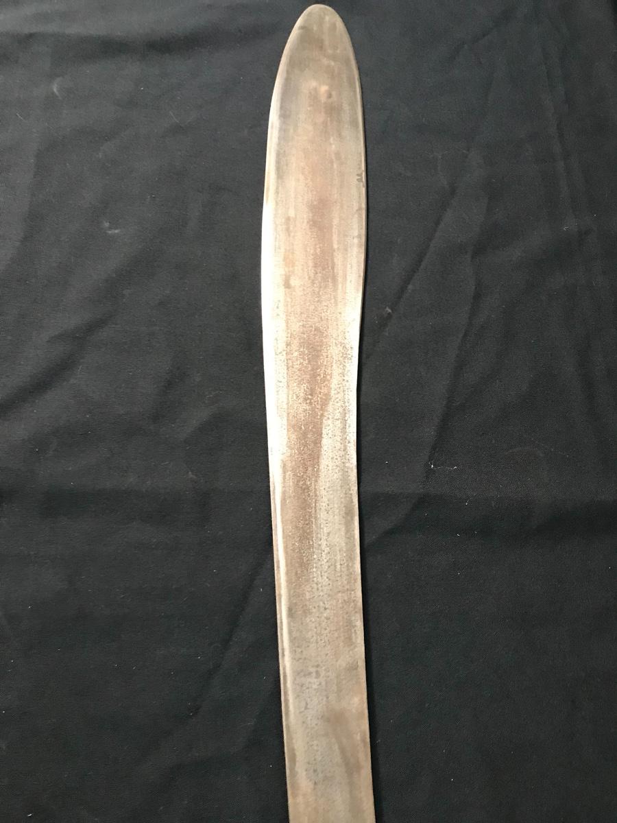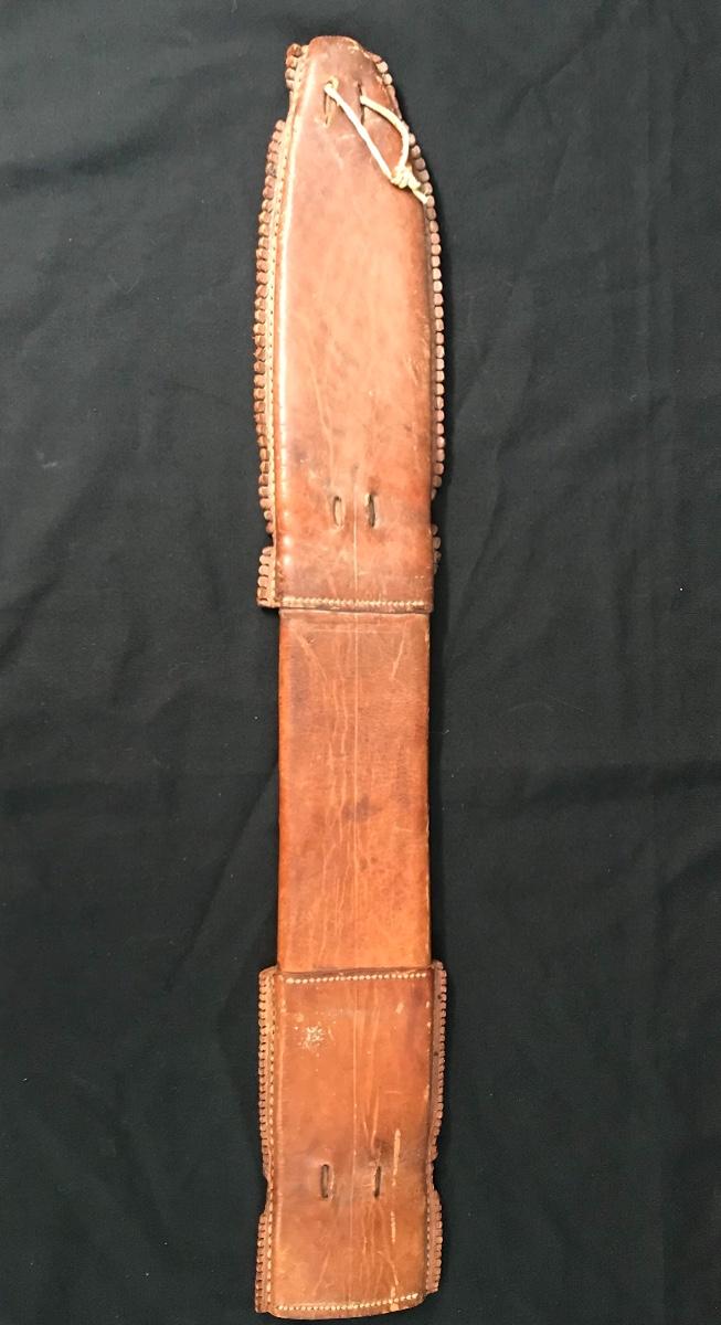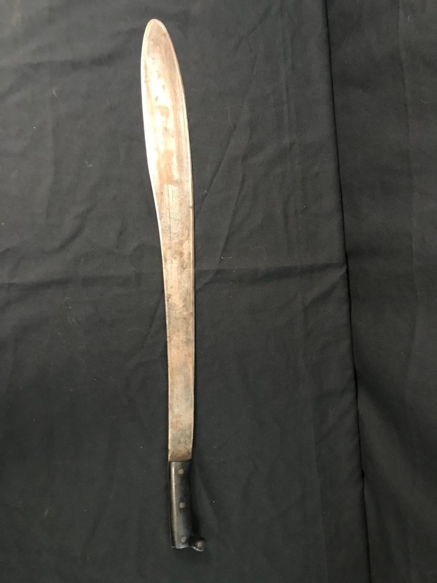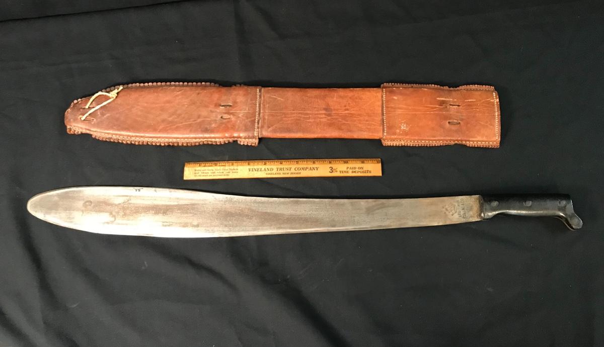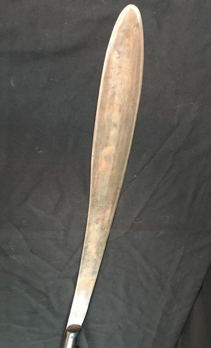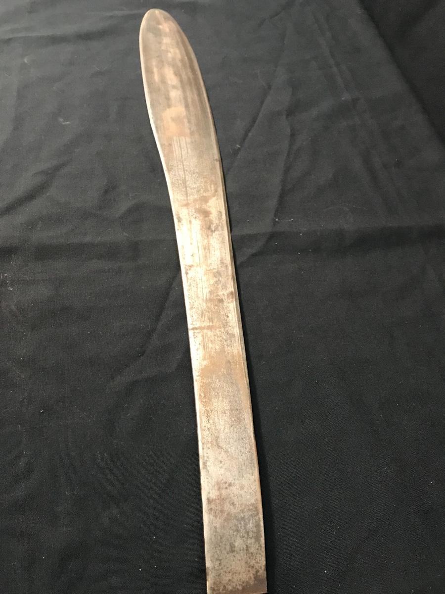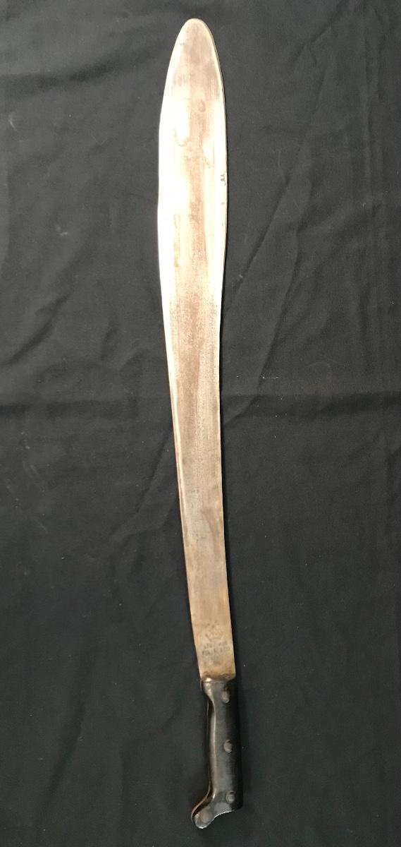 Vintage Collins & Co. Legitimus Machete with leather scabbard. Massive 27 inch blade, rounded and double-edged at the tip. The pictures show condition, measurements if taken, and what is included in the lot. Due to the large amount that we photograph and the time frame, we are not always able to take measurements. All items unless noted, are pre-owned and have been used. If you purchased furniture, you must bring help. We do not allow one person to carry large furniture out on their own. Bring help, tools and a truck for the safety of our client’s homes, and your personal safety. Company policy. Thank you.