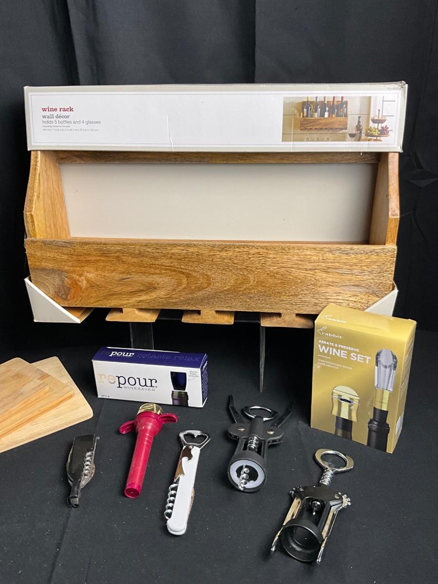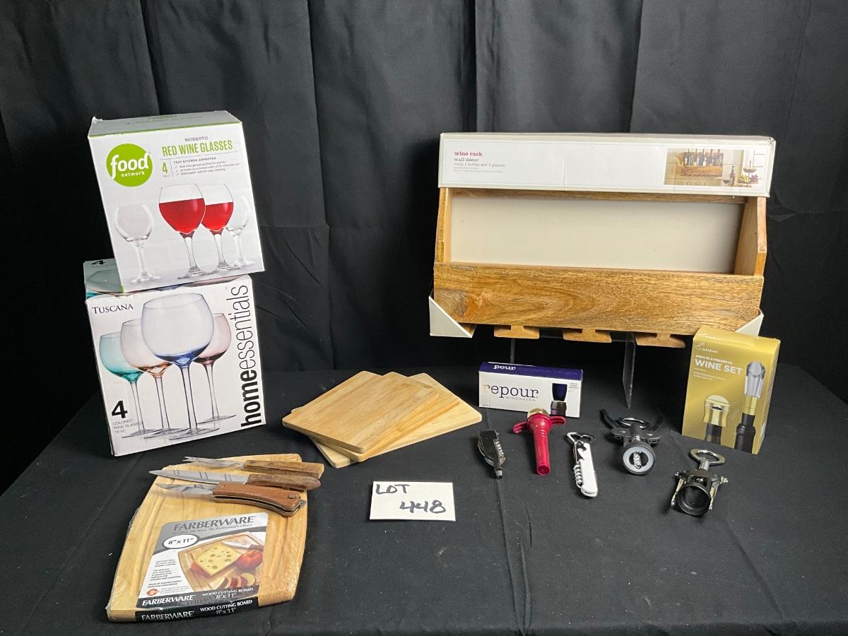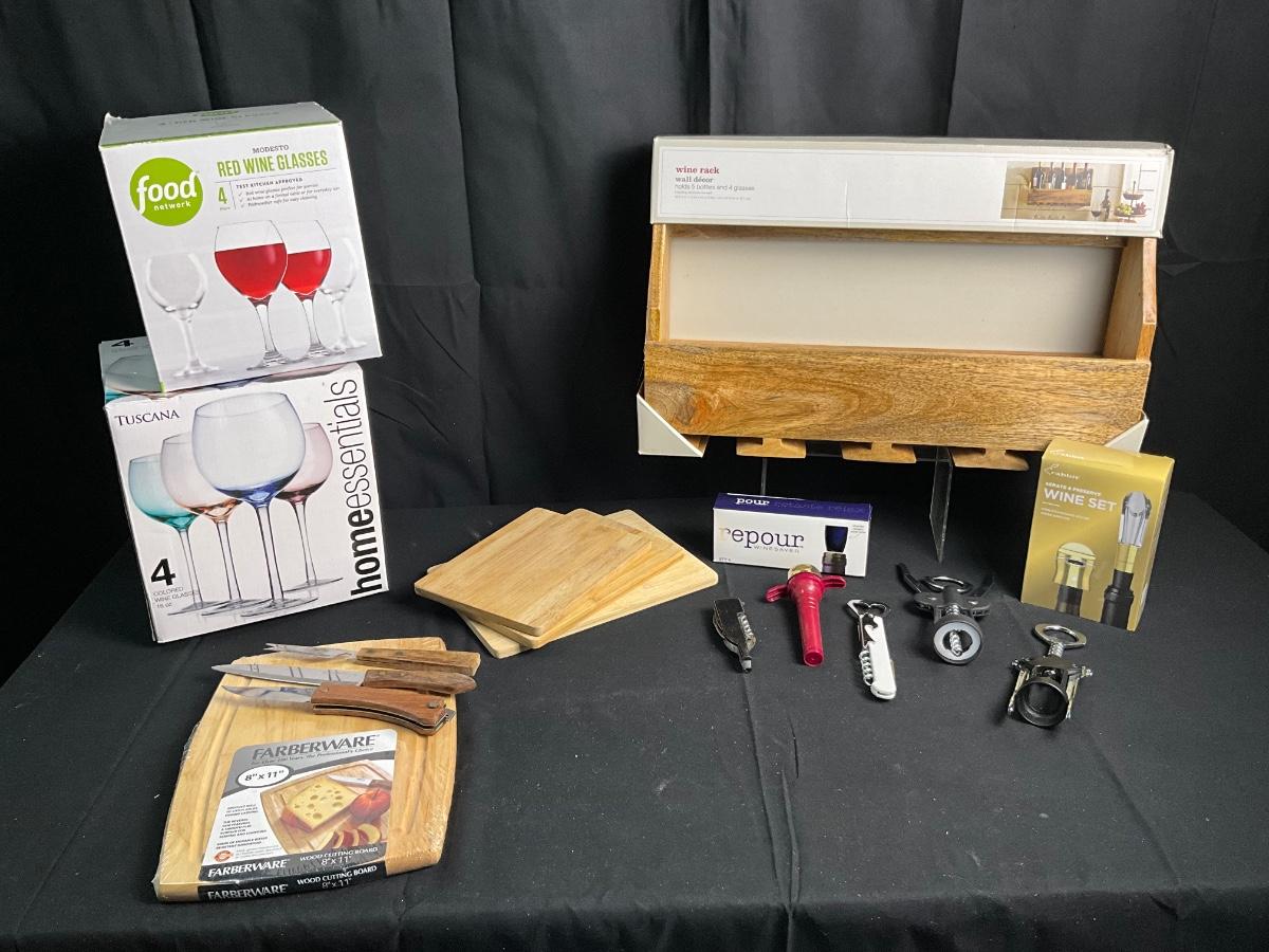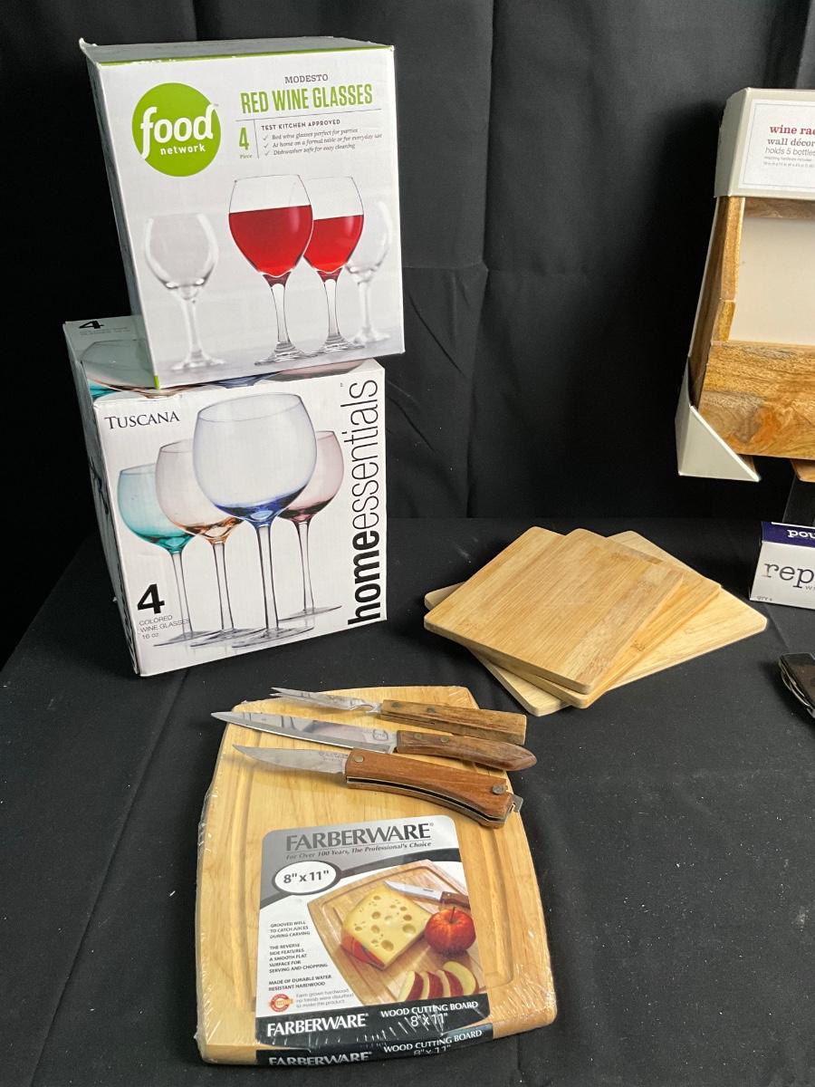 Lot R 448. Wooden Wine Rack / NIB Two Sets of Four Wine Glasses / Cork Screws / NWT Cheese Board and more