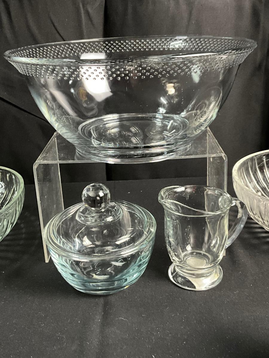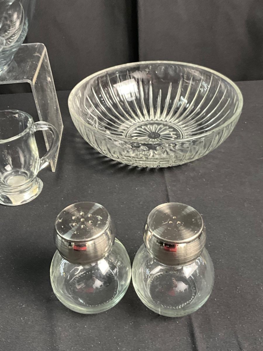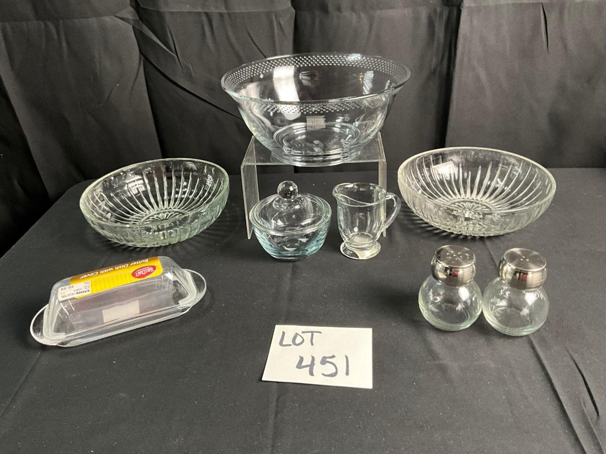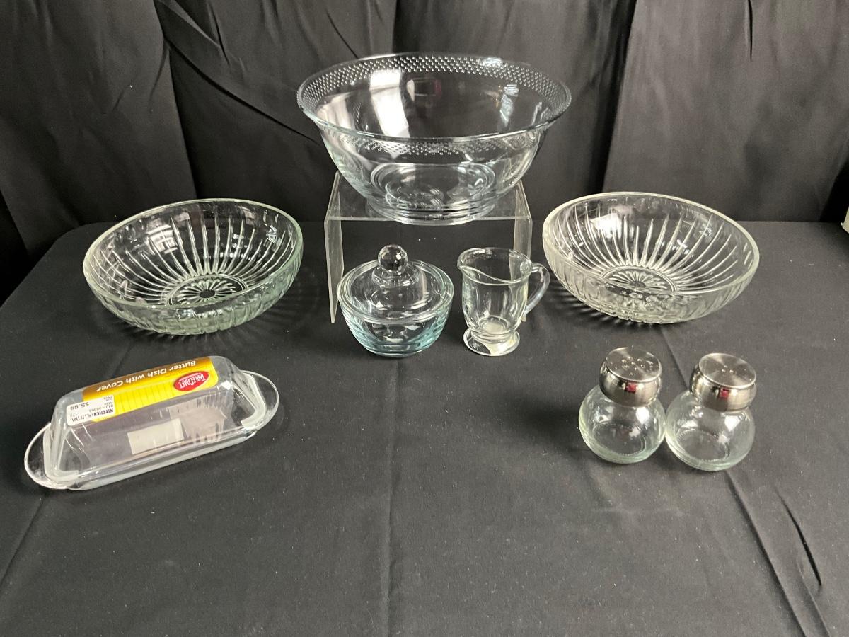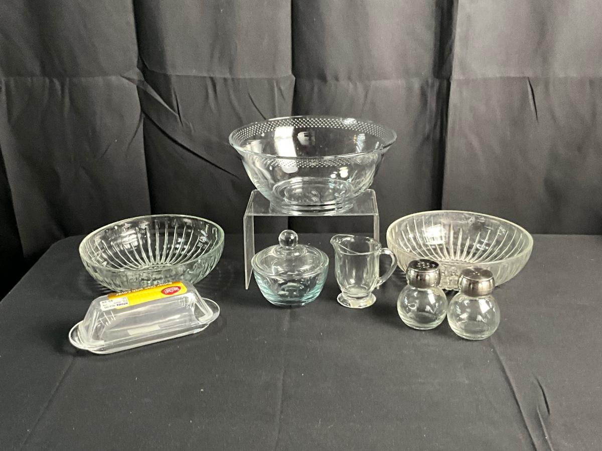 Lot R 451 Clear Glass Serving Bowls / Clear Glass Shakers / Creamer / Sugar / Butter Dish
