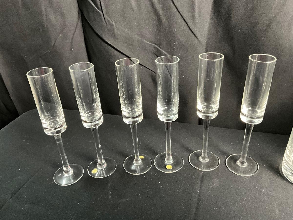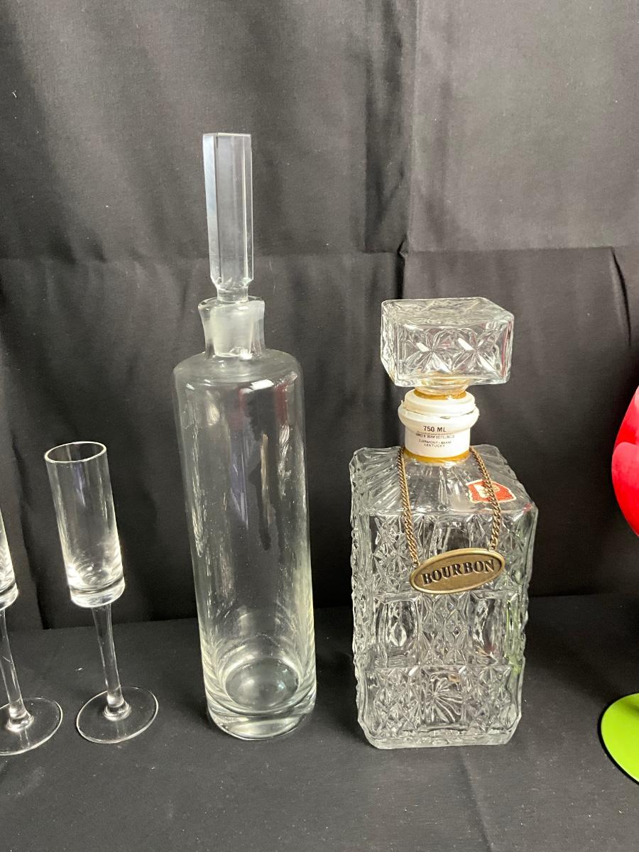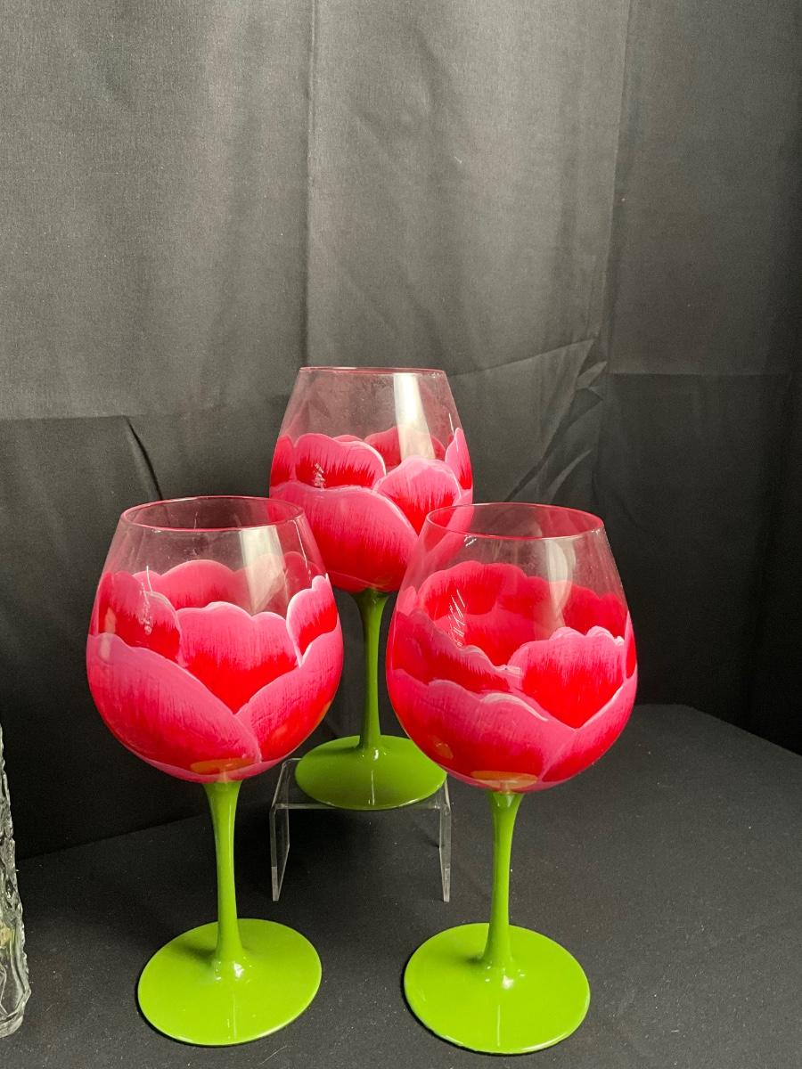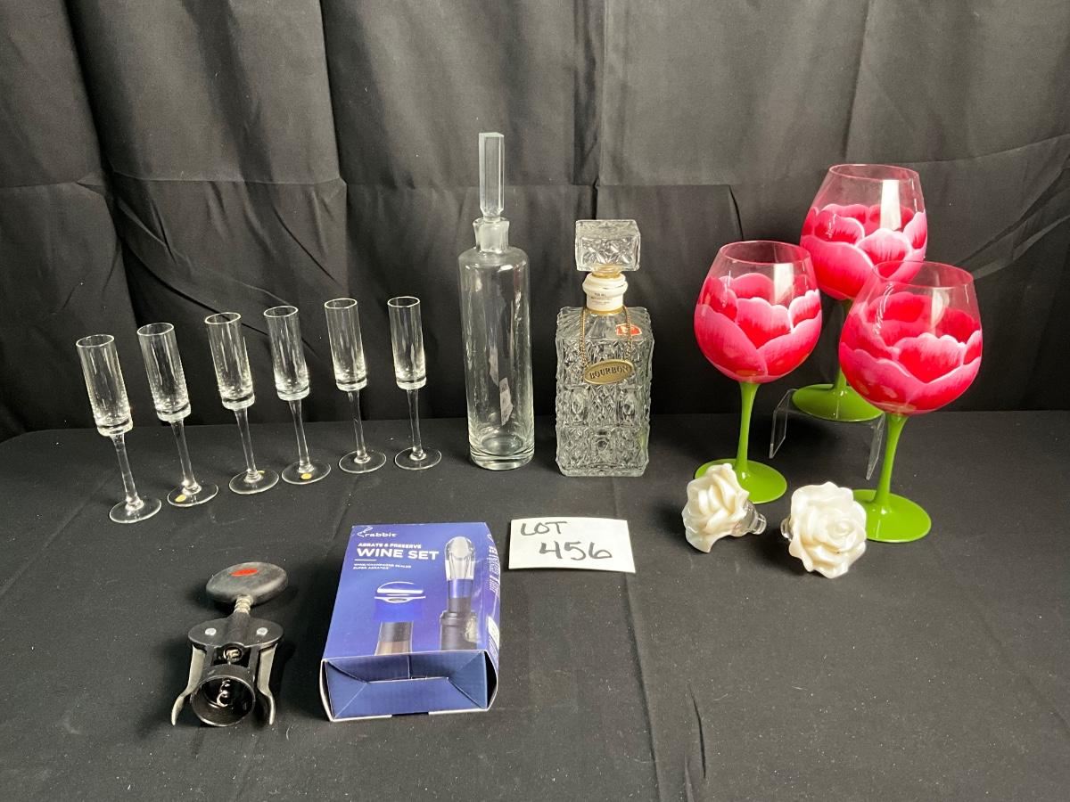 Lot R 456 Floral Painted Wine Glasses / Crystal Champagne Flutes from Hungary / Two Decanters / Two Rose Bud Stoppers / Wine Sets
