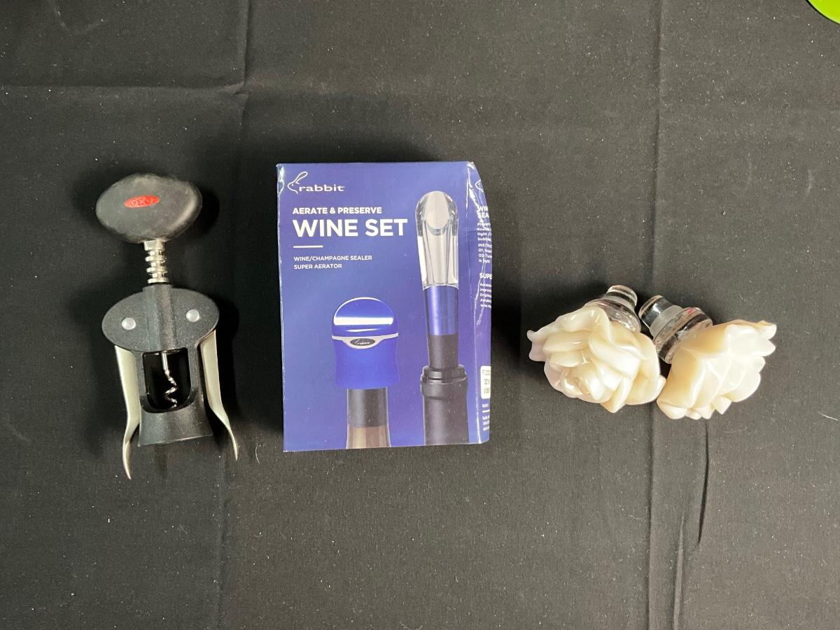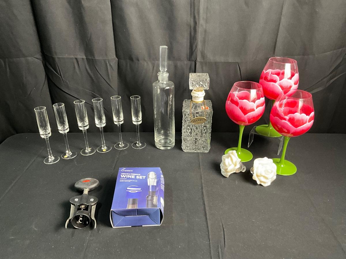 Floral Painted Wine Glasses / Crystal Champagne Flutes from Hungary / Two Decanters / Two Rose Bud Stoppers / Wine Sets