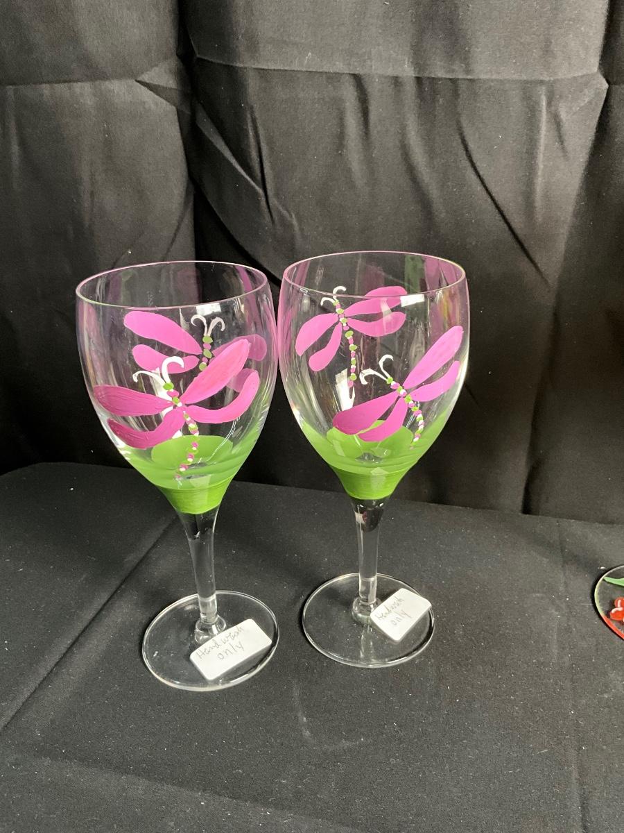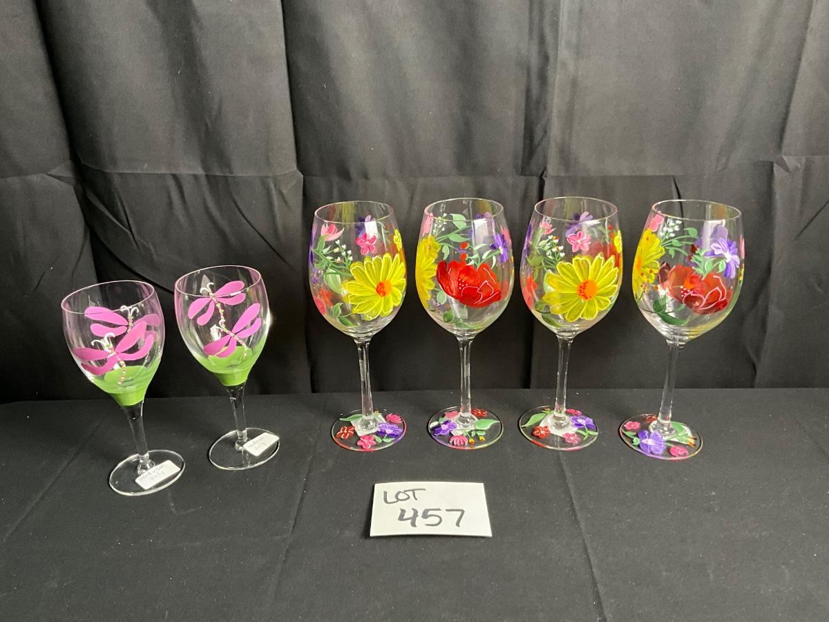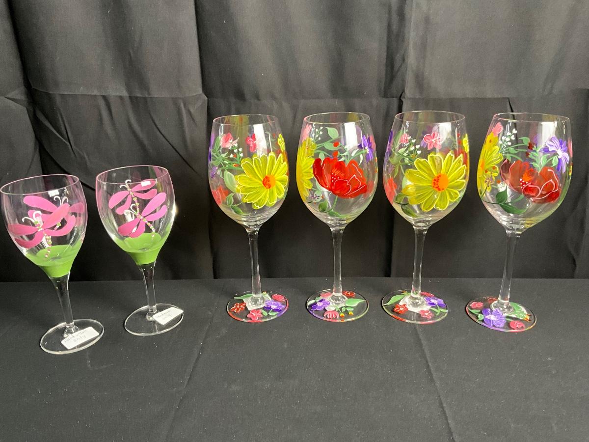 Lot R 457 Set of Four Pier 1 Imports Hand Painted Floral Wine Glasses / Pair of Hand Painted Dragonfly Wine Glasses