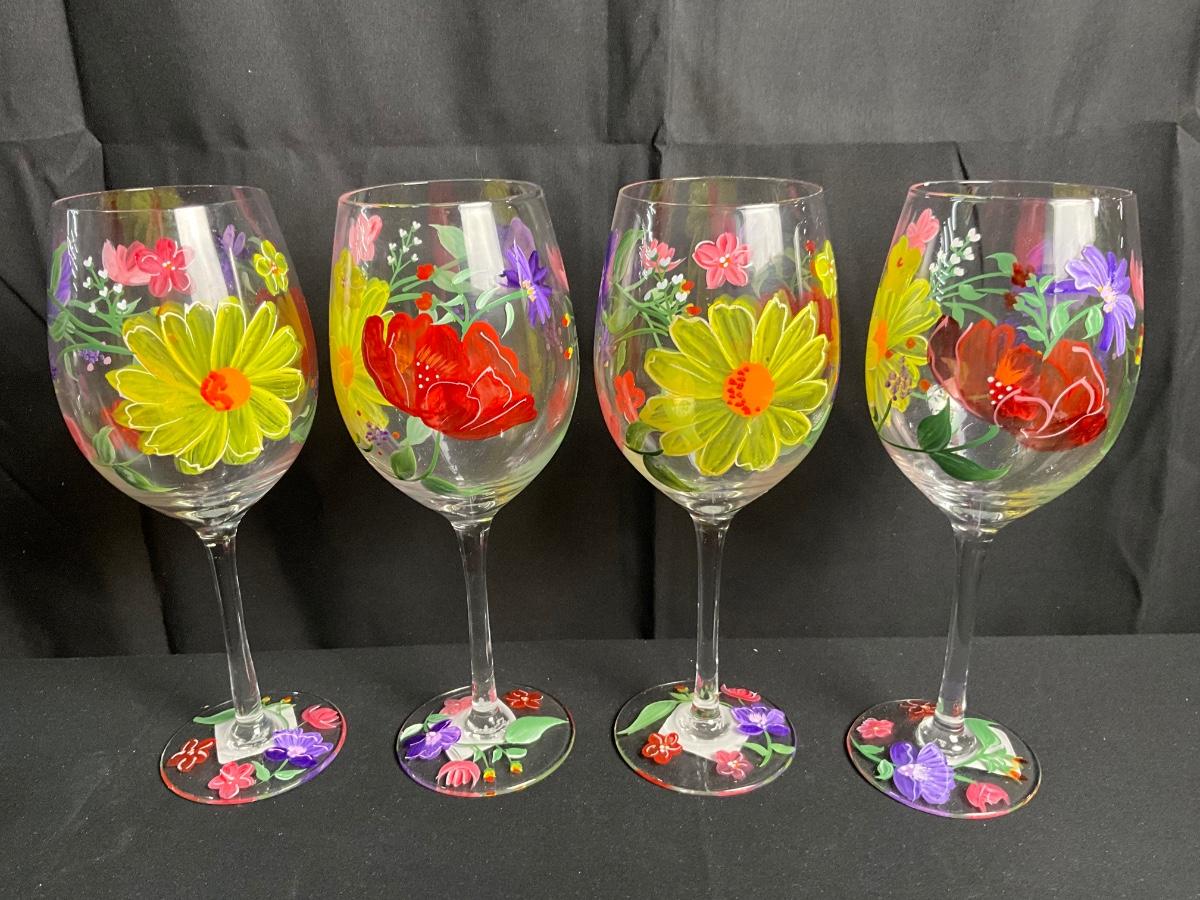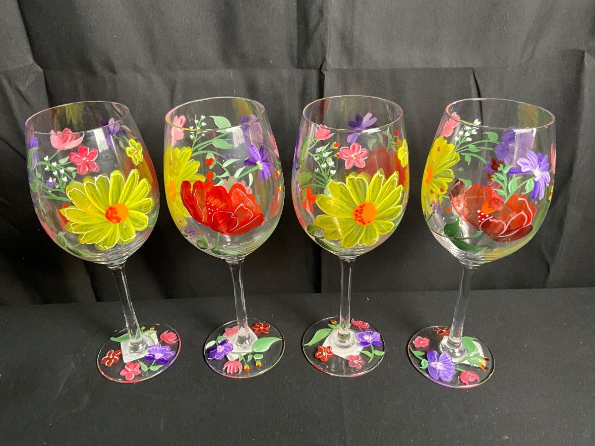 Set of Four Pier 1 Imports Hand Painted Floral Wine Glasses