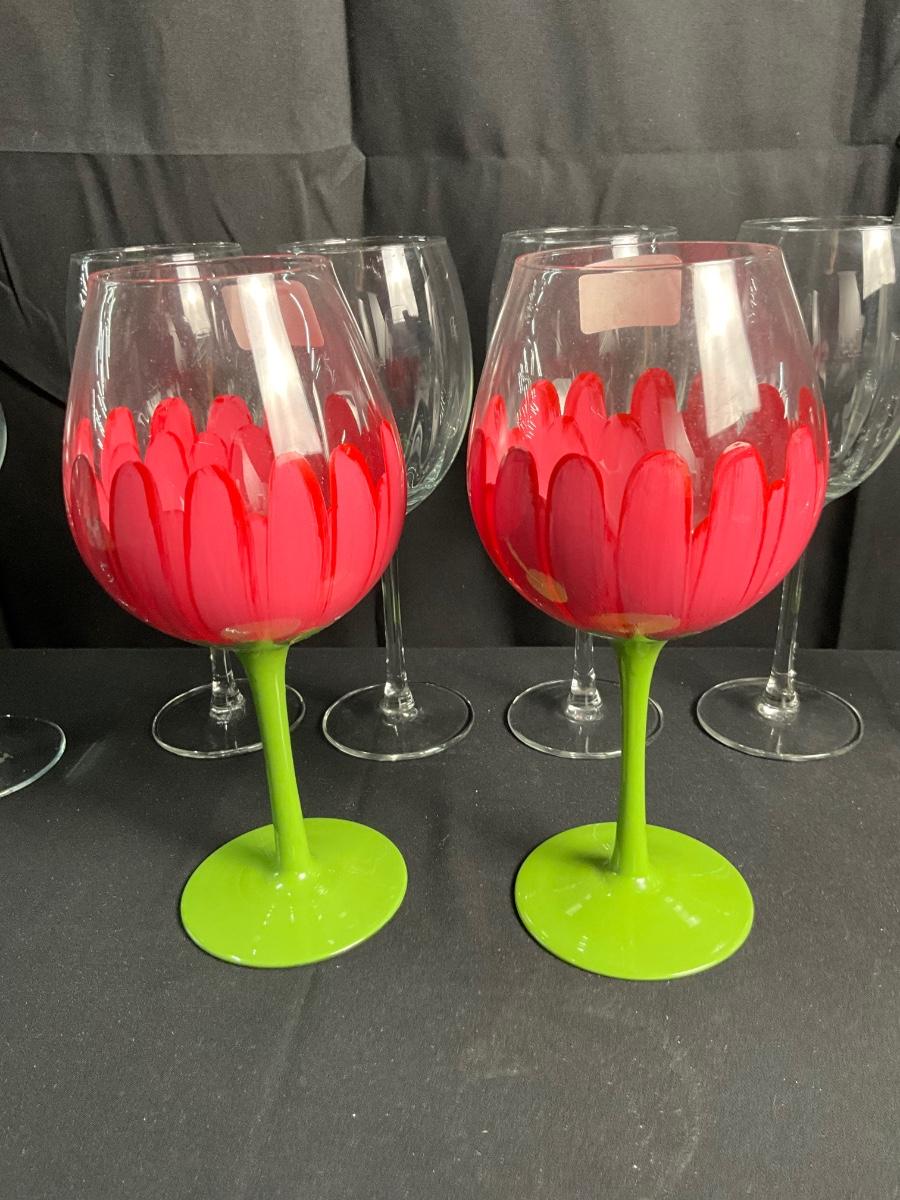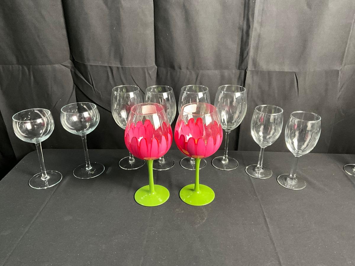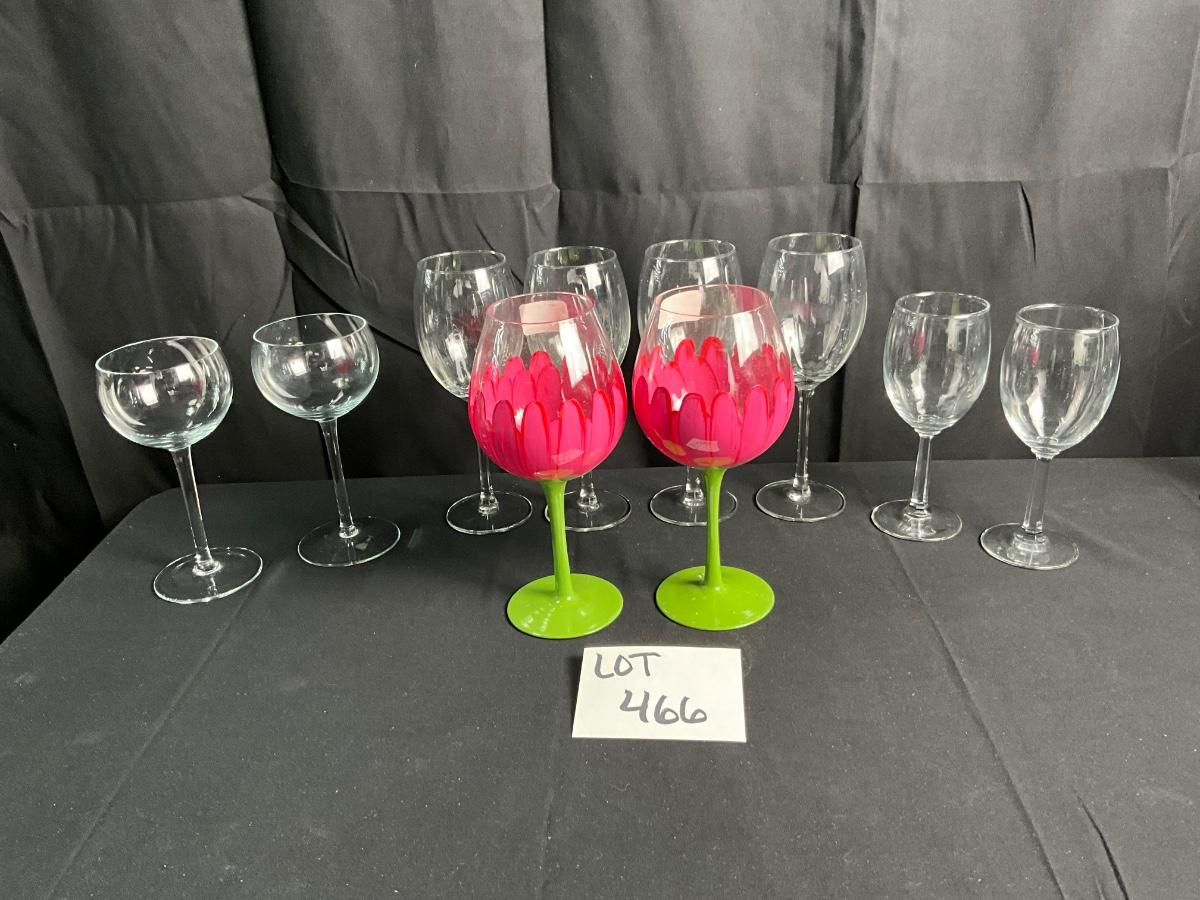 Lot R 466 Lot of Wine Glasses, Two Floral, Eight Clear Glass