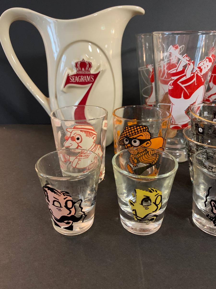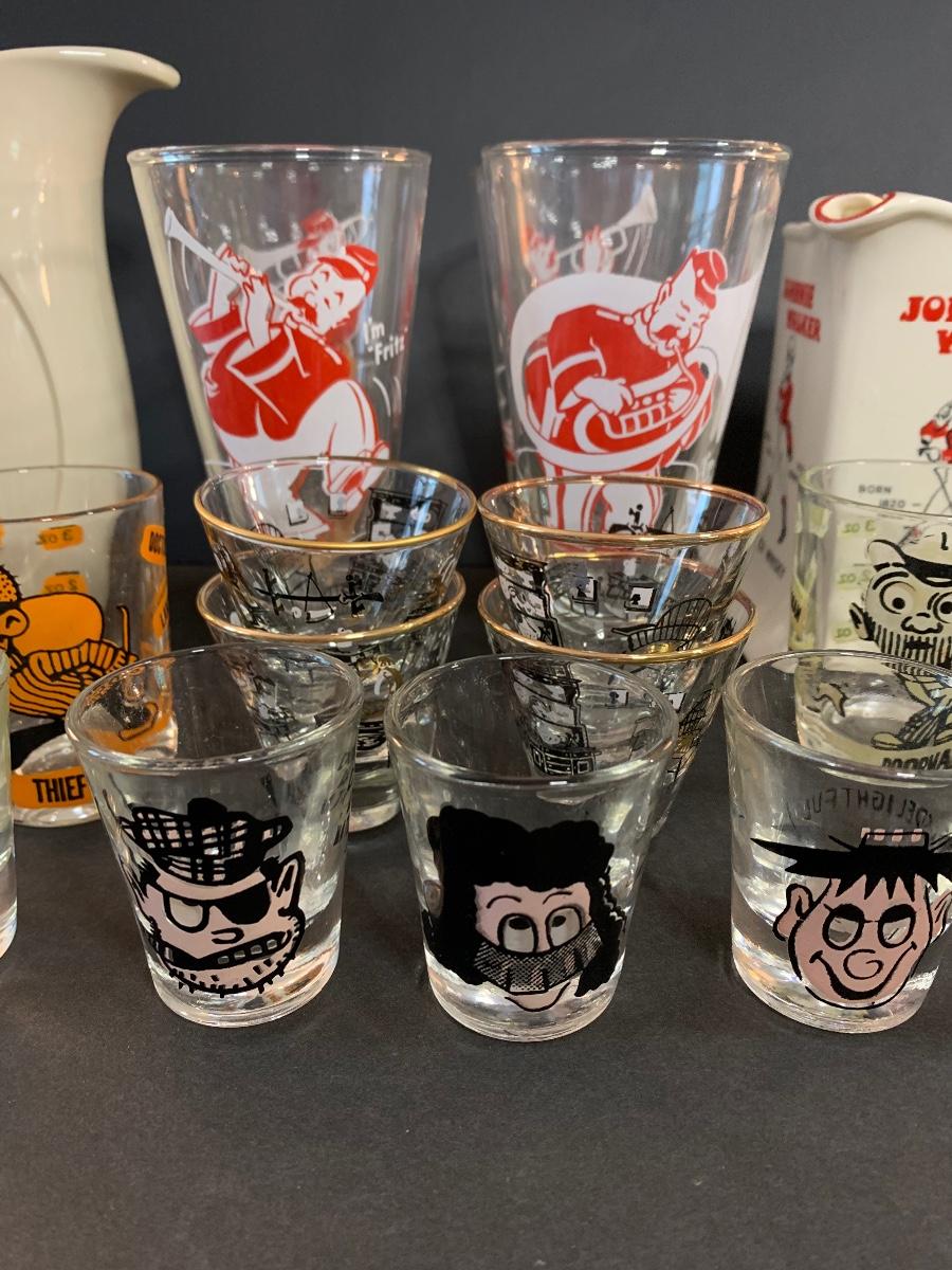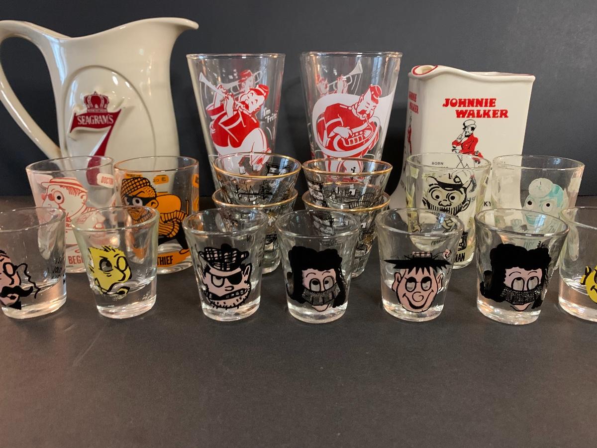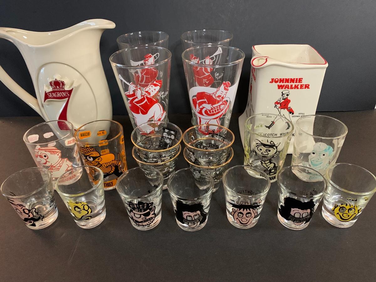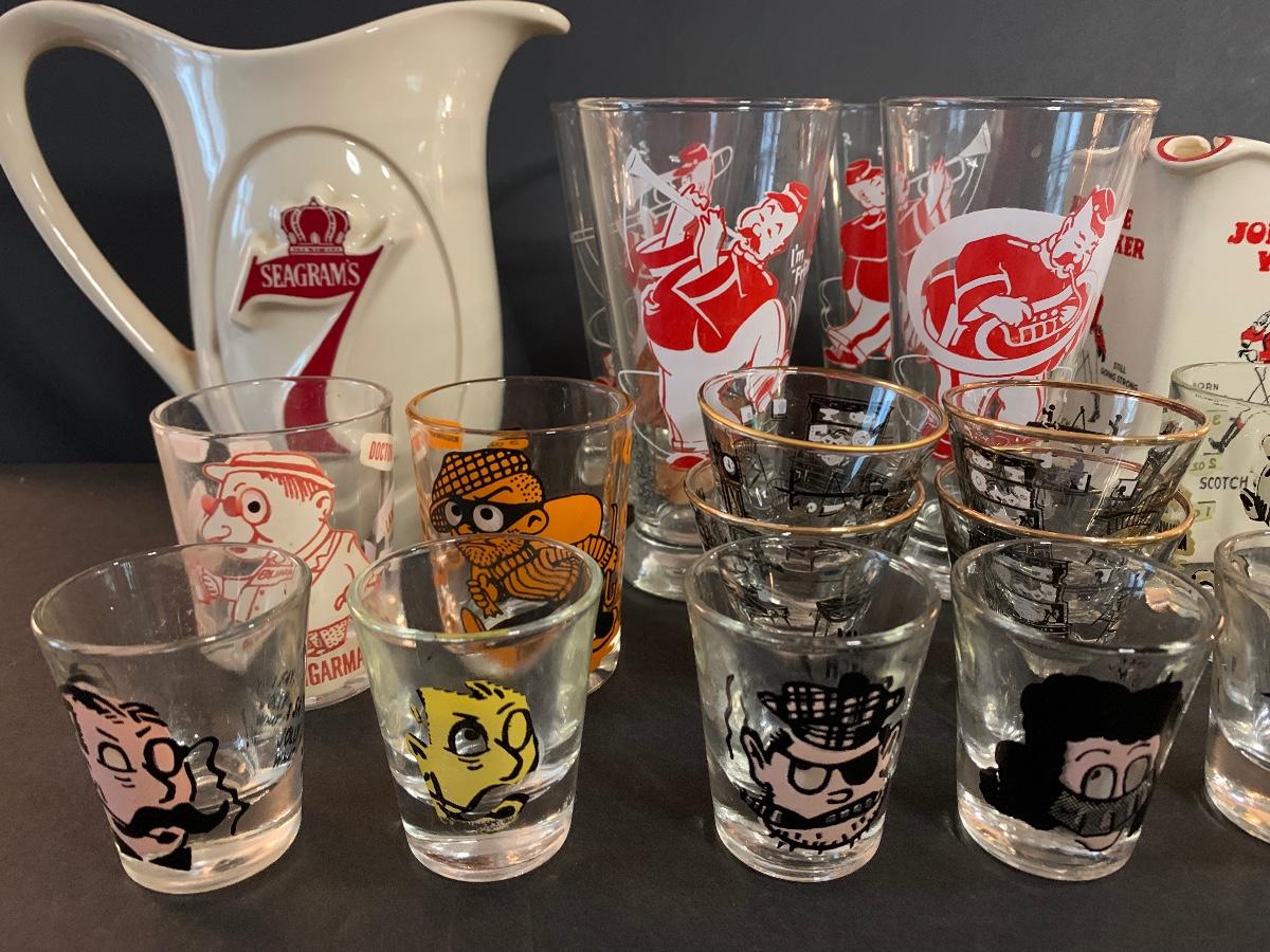 Vintage German Pilsner Beer Bar Glasses Band Horns Hans, Louie, Fritz & Gus, novelty shot lasses "Roving Eyes", set of 4 gold rimmed shot glasses, Johnnie Walker Scotch Whiskey Pitcher along with a Seagram' 7 ceramic pitcher.