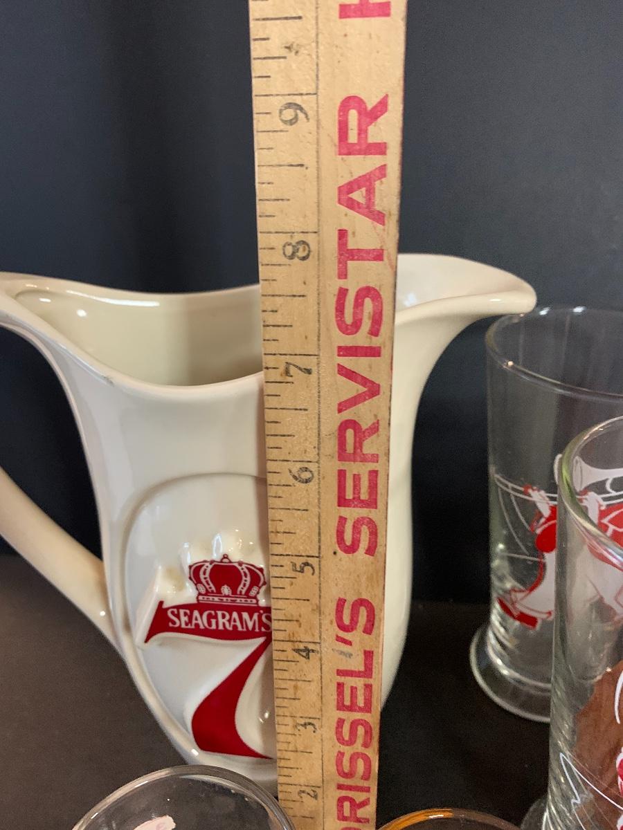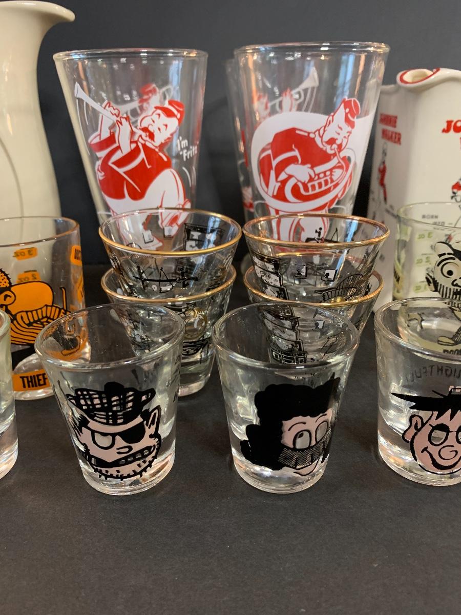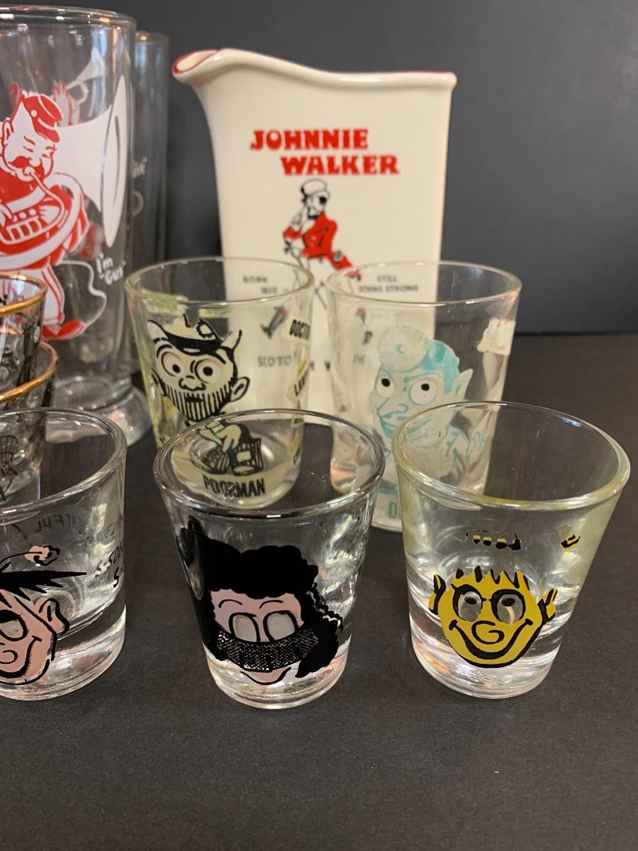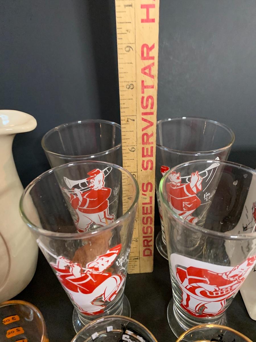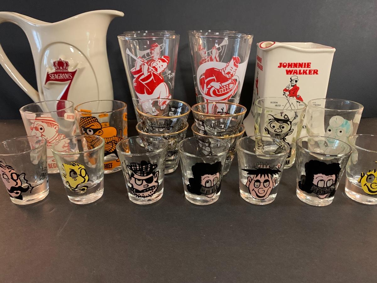Vintage German Pilsner Beer Bar Glasses Band Horns Hans, Louie, Fritz & Gus, novelty shot lasses "Roving Eyes", set of 4 gold rimmed shot glasses, Johnnie Walker Scotch Whiskey Pitcher along with a Seagram' 7 ceramic pitcher.
