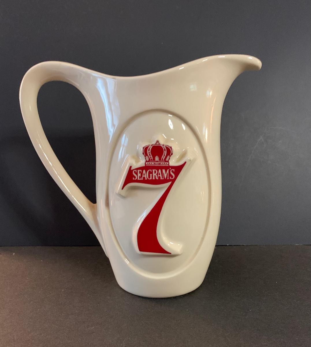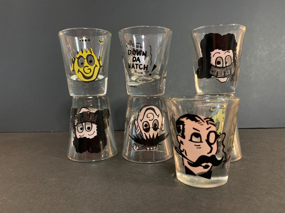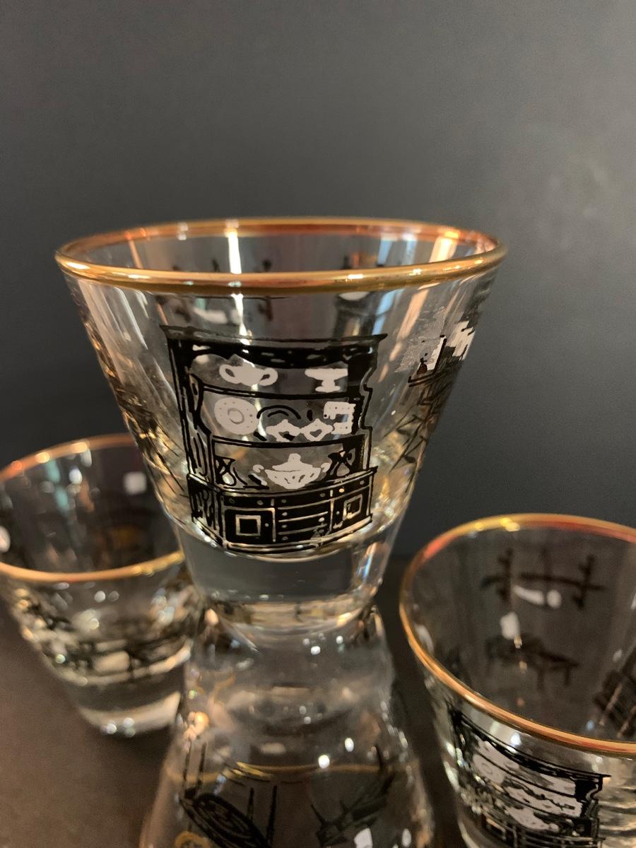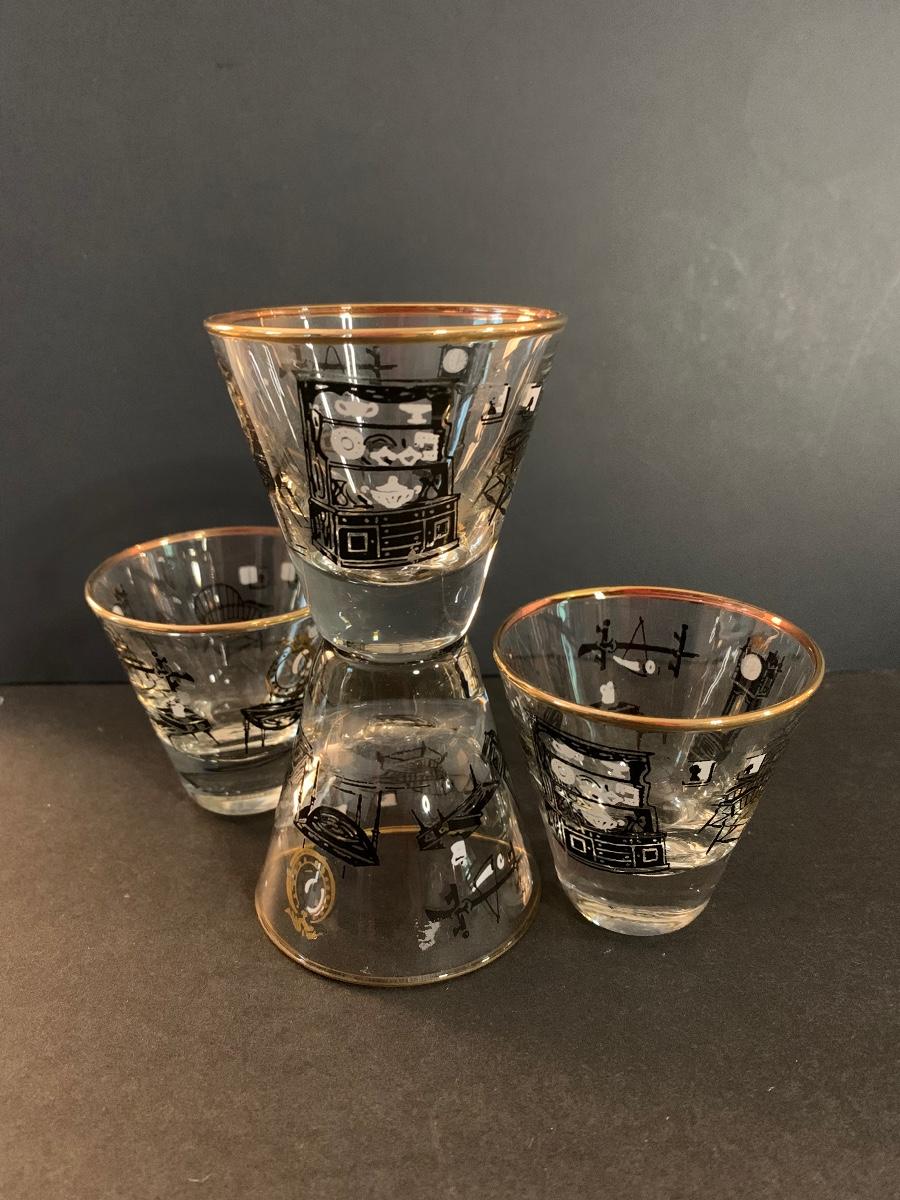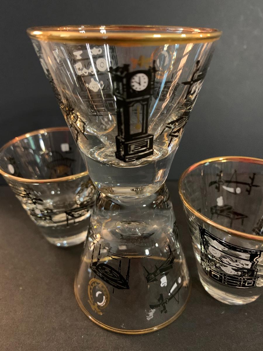 Vintage German Pilsner Beer Bar Glasses Band Horns Hans, Louie, Fritz & Gus, novelty shot lasses "Roving Eyes", set of 4 gold rimmed shot glasses, Johnnie Walker Scotch Whiskey Pitcher along with a Seagram' 7 ceramic pitcher.