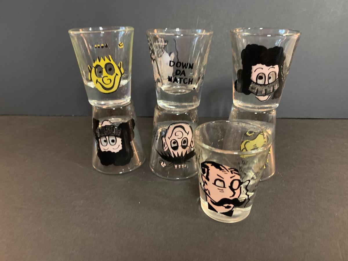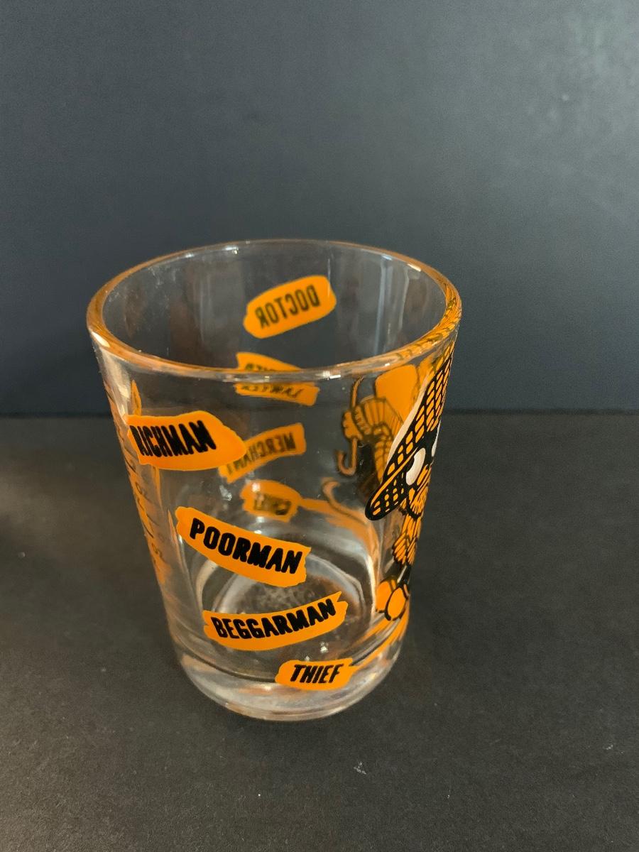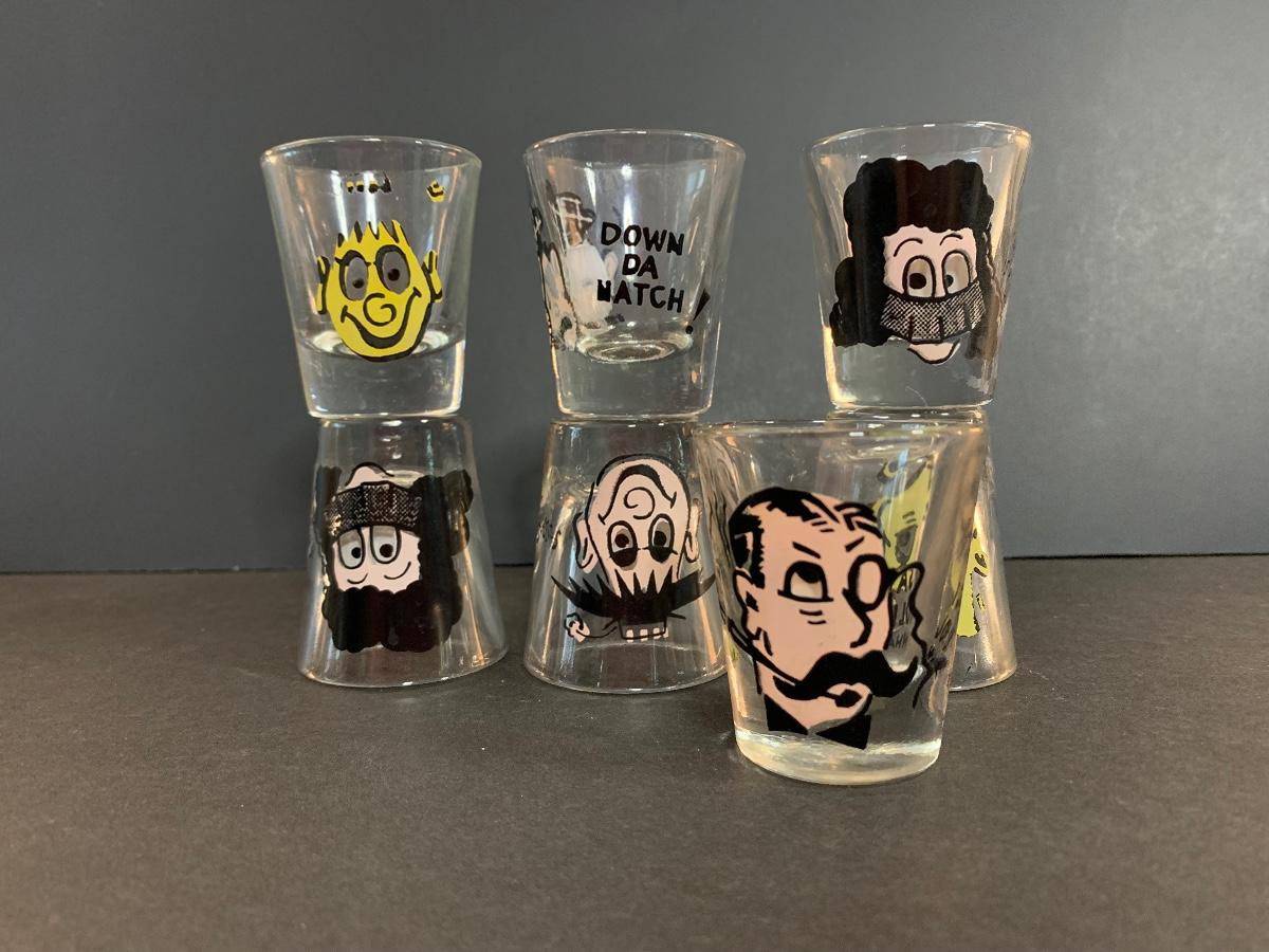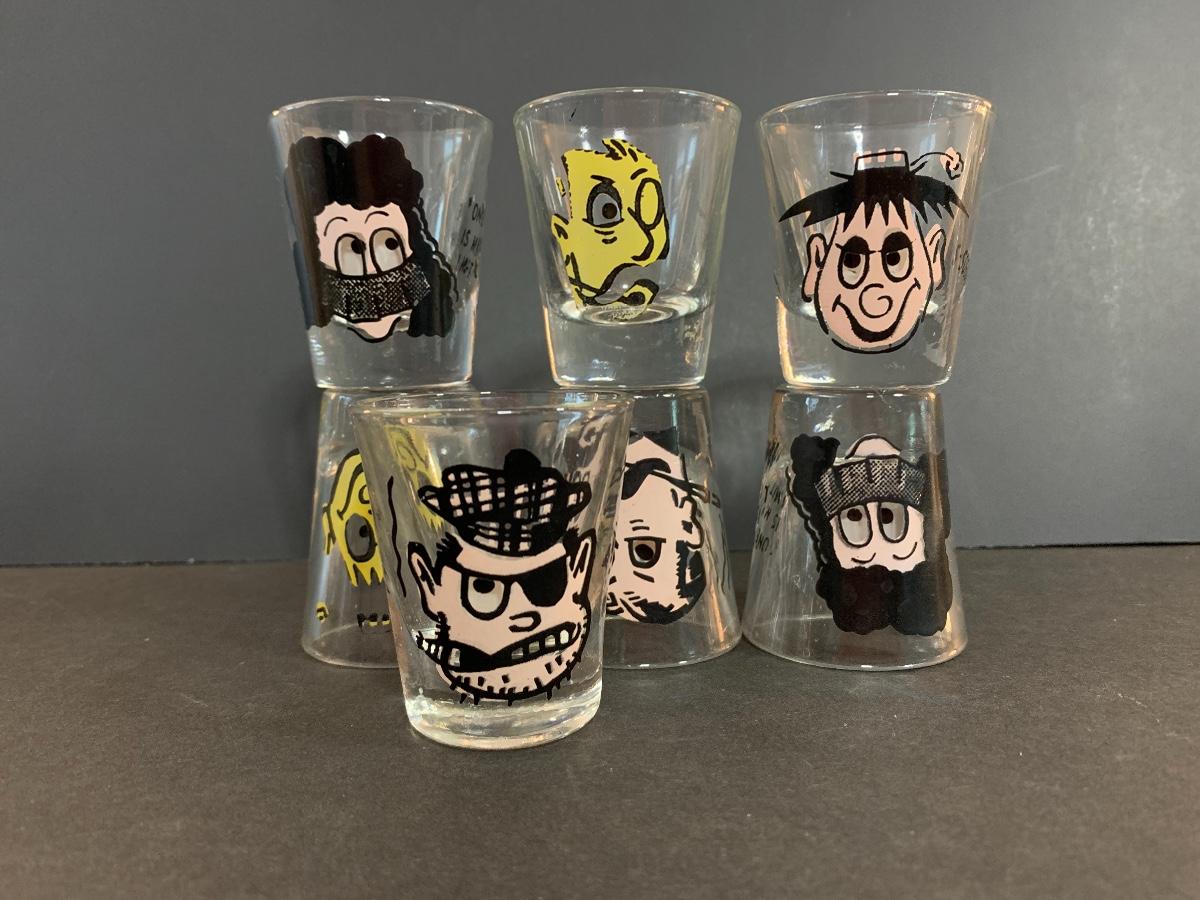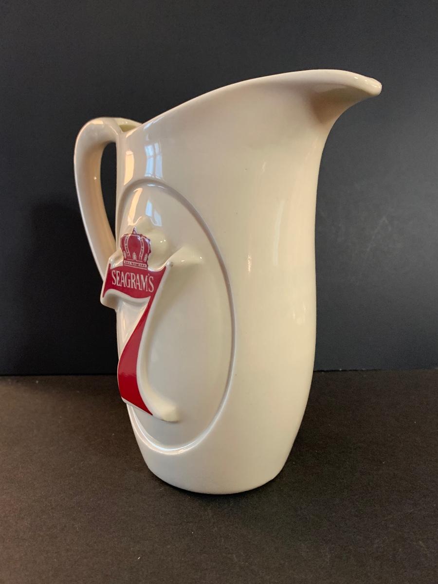 Vintage German Pilsner Beer Bar Glasses Band Horns Hans, Louie, Fritz & Gus, novelty shot lasses "Roving Eyes", set of 4 gold rimmed shot glasses, Johnnie Walker Scotch Whiskey Pitcher along with a Seagram' 7 ceramic pitcher.