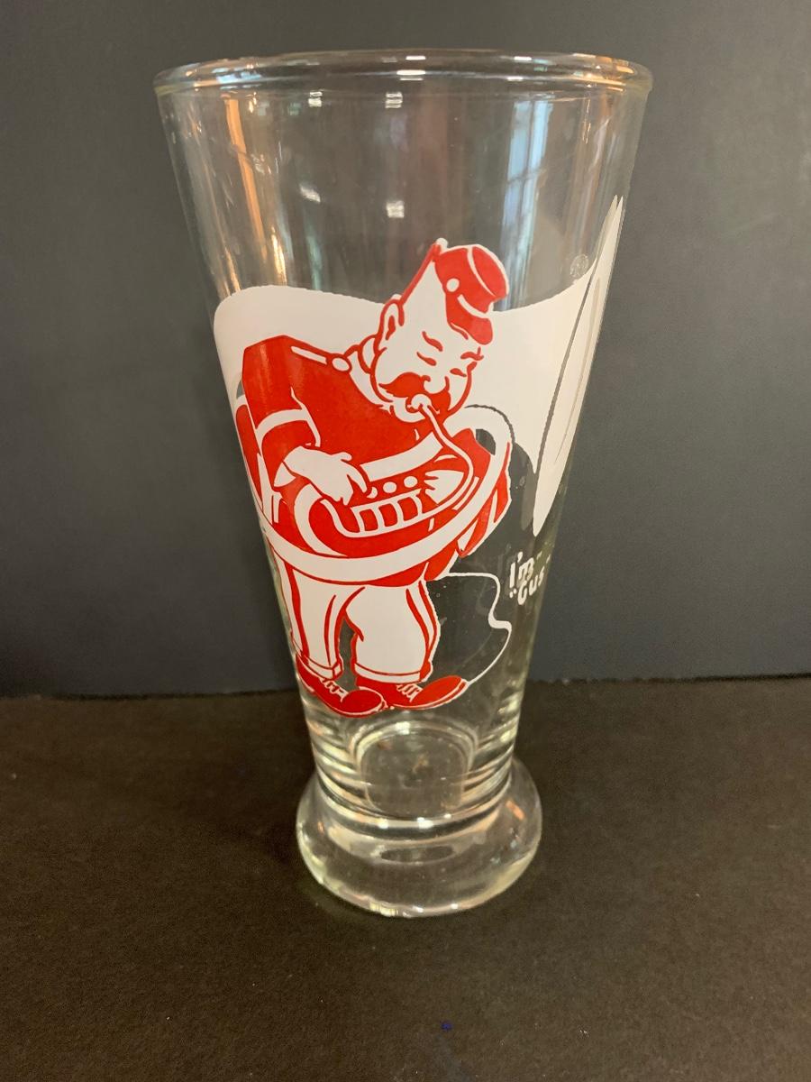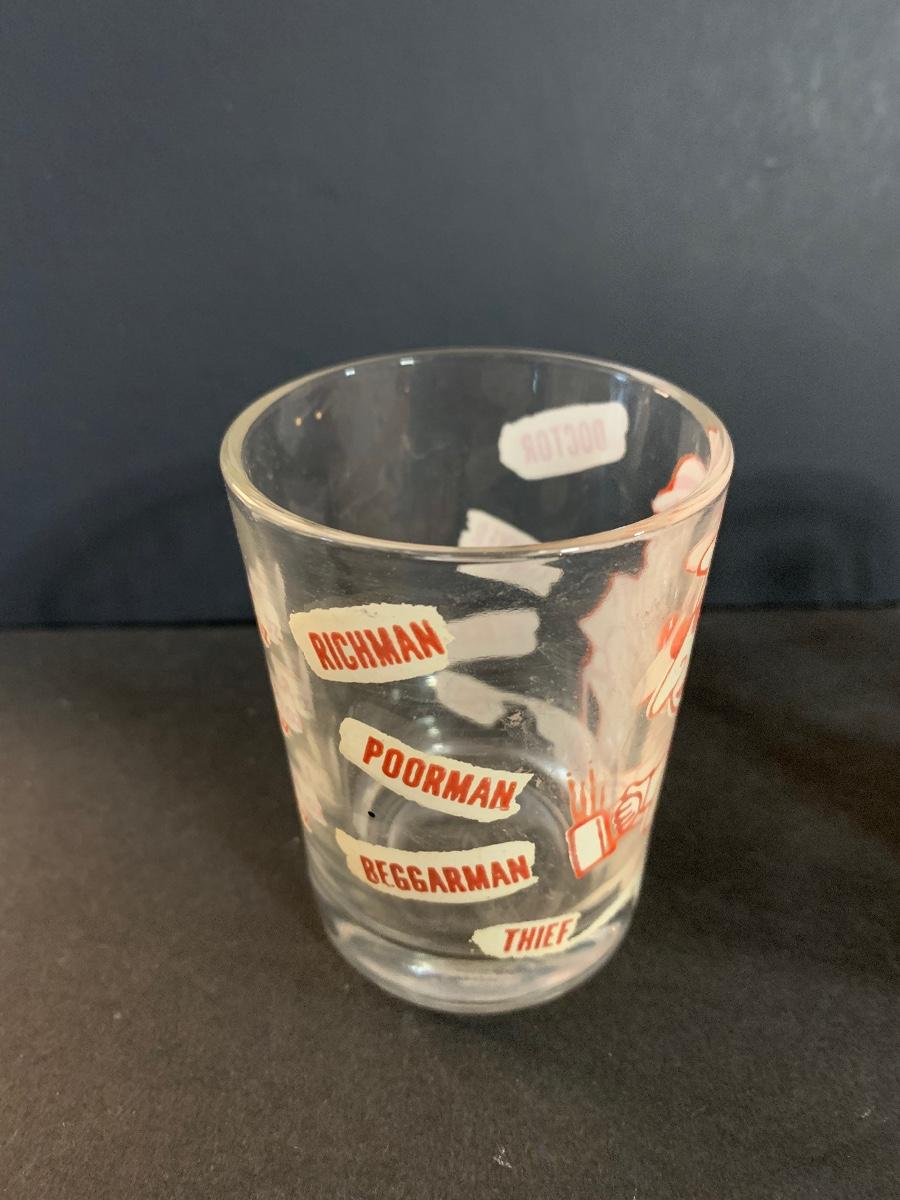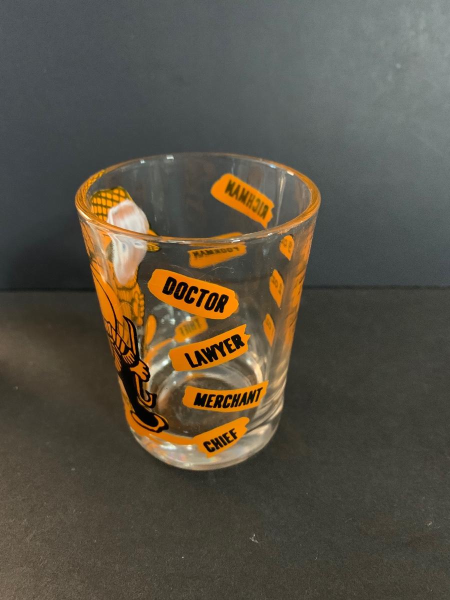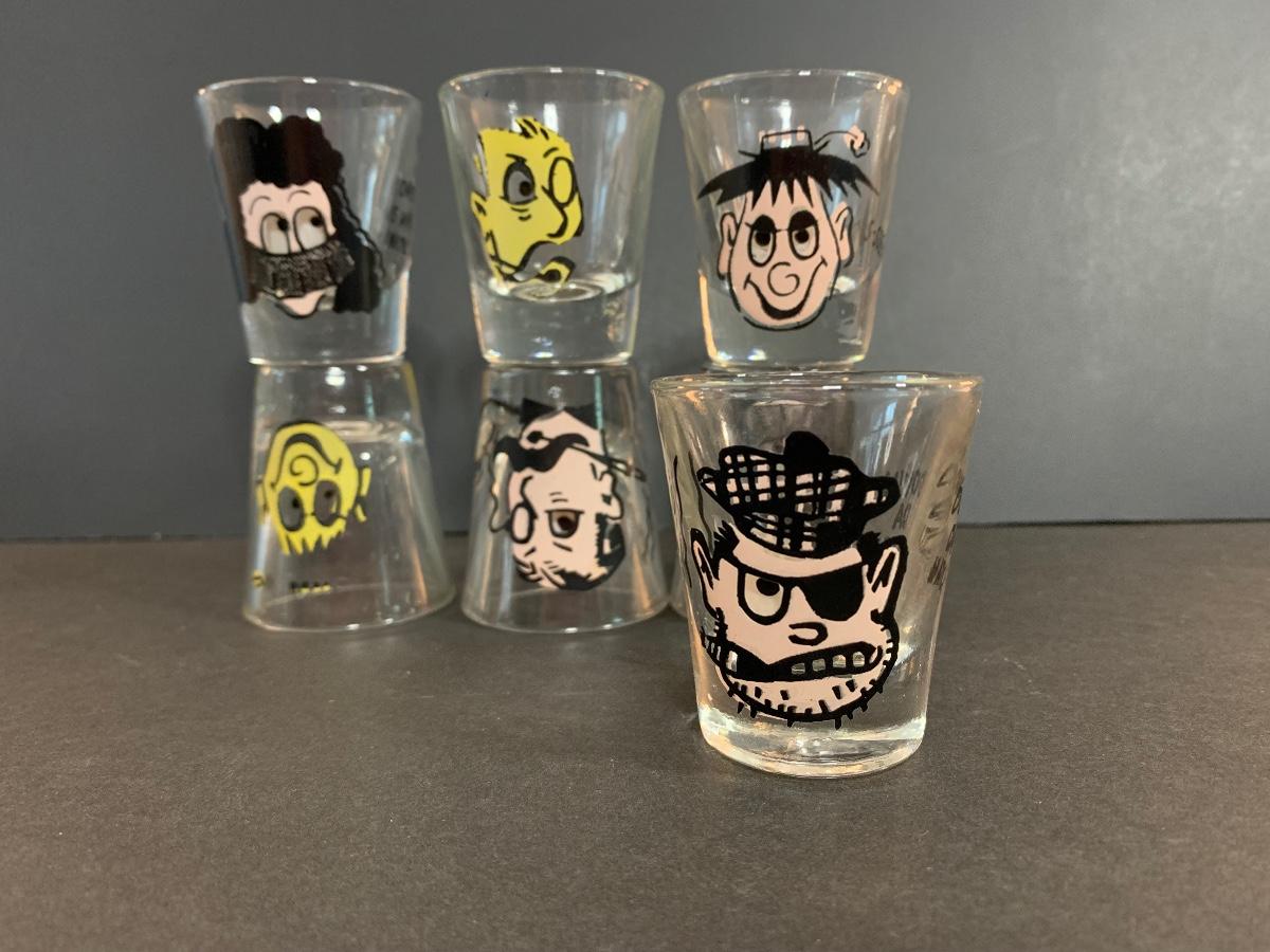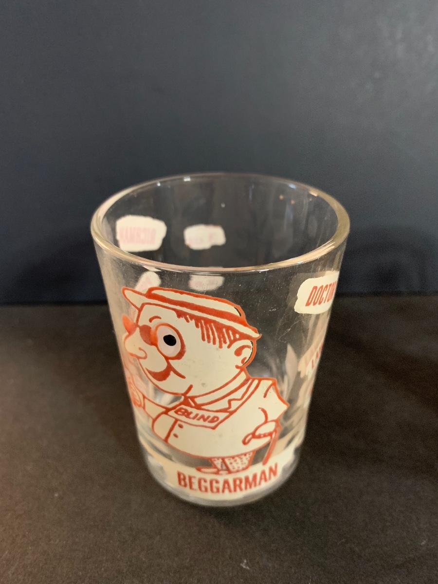 Vintage German Pilsner Beer Bar Glasses Band Horns Hans, Louie, Fritz & Gus, novelty shot lasses "Roving Eyes", set of 4 gold rimmed shot glasses, Johnnie Walker Scotch Whiskey Pitcher along with a Seagram' 7 ceramic pitcher.