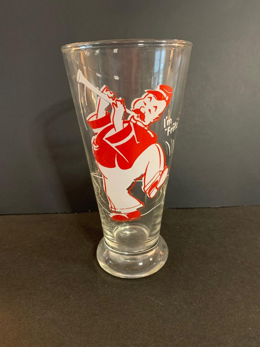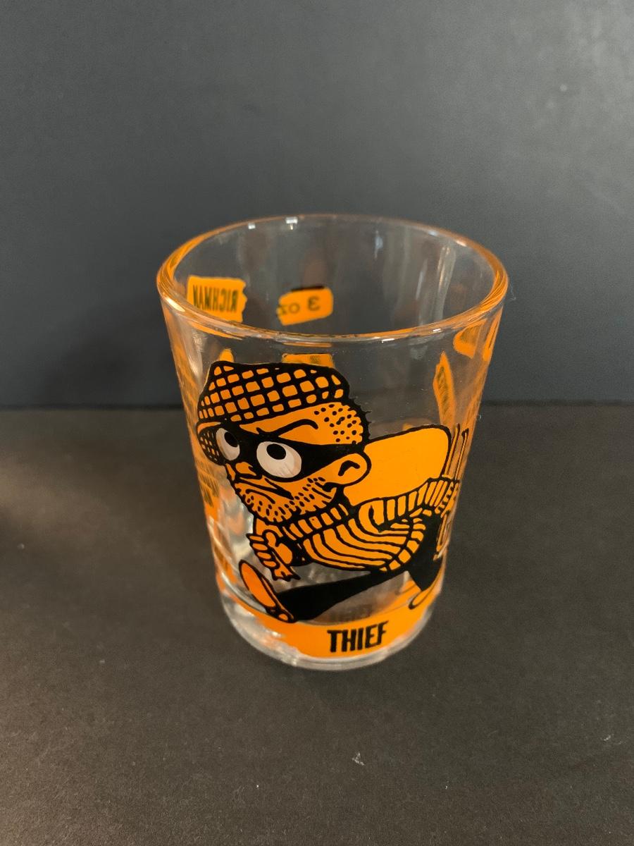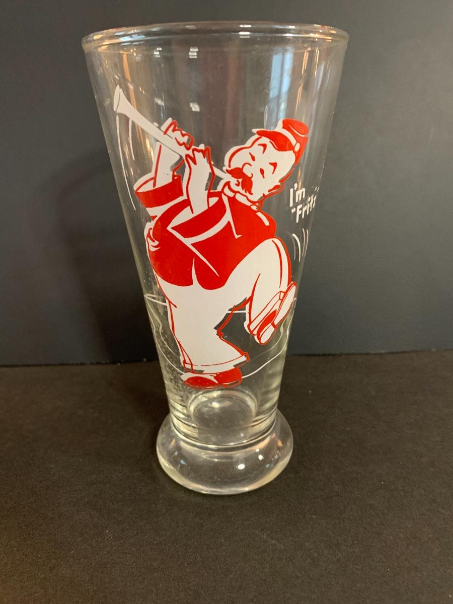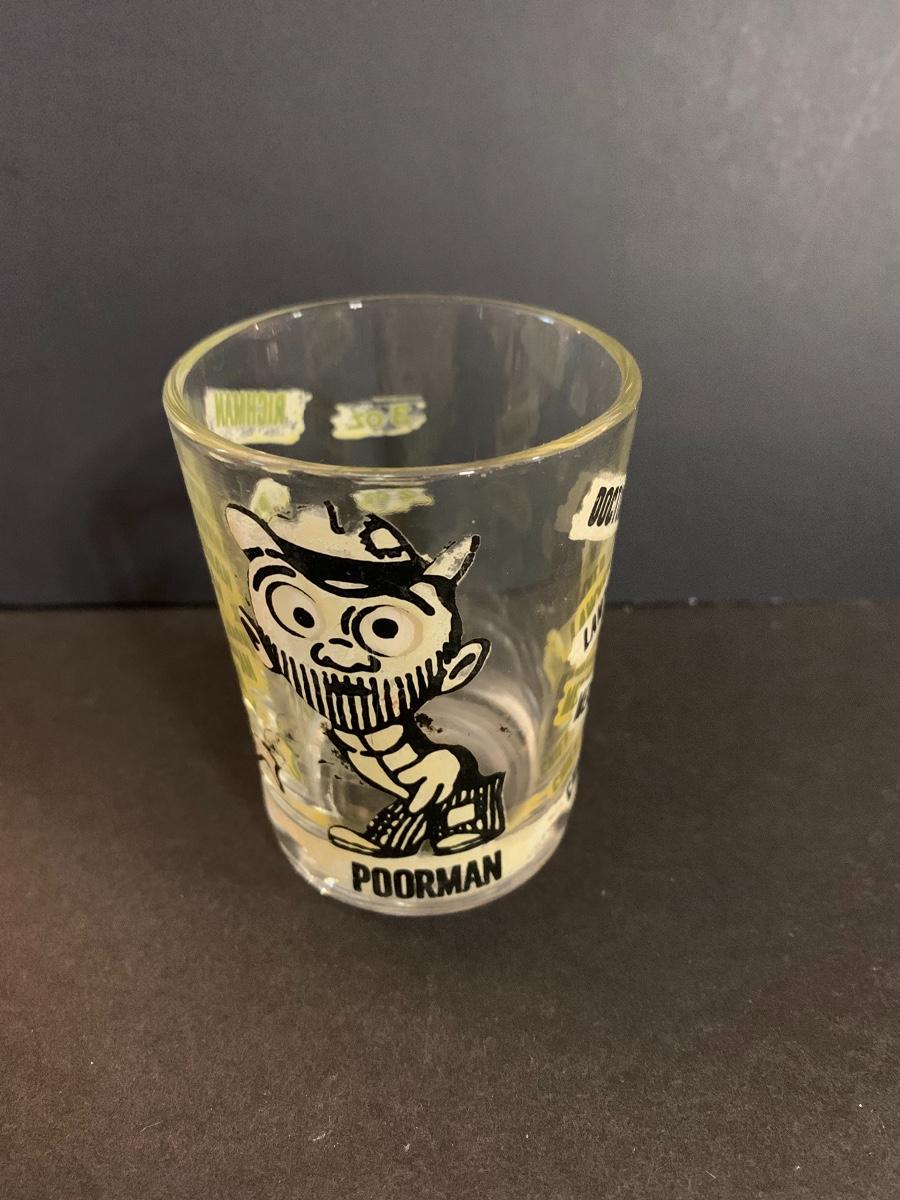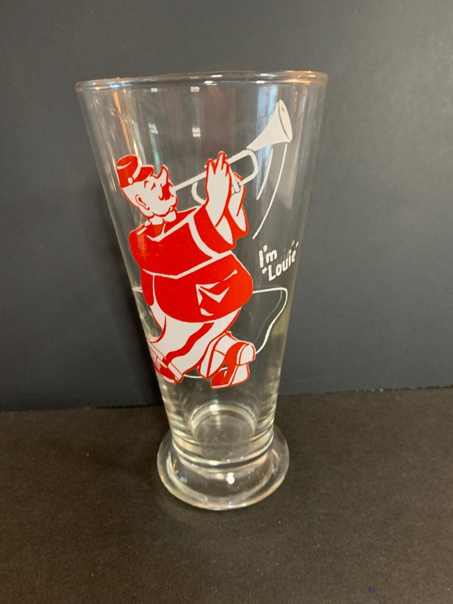Vintage German Pilsner Beer Bar Glasses Band Horns Hans, Louie, Fritz & Gus, novelty shot lasses "Roving Eyes", set of 4 gold rimmed shot glasses, Johnnie Walker Scotch Whiskey Pitcher along with a Seagram' 7 ceramic pitcher.
