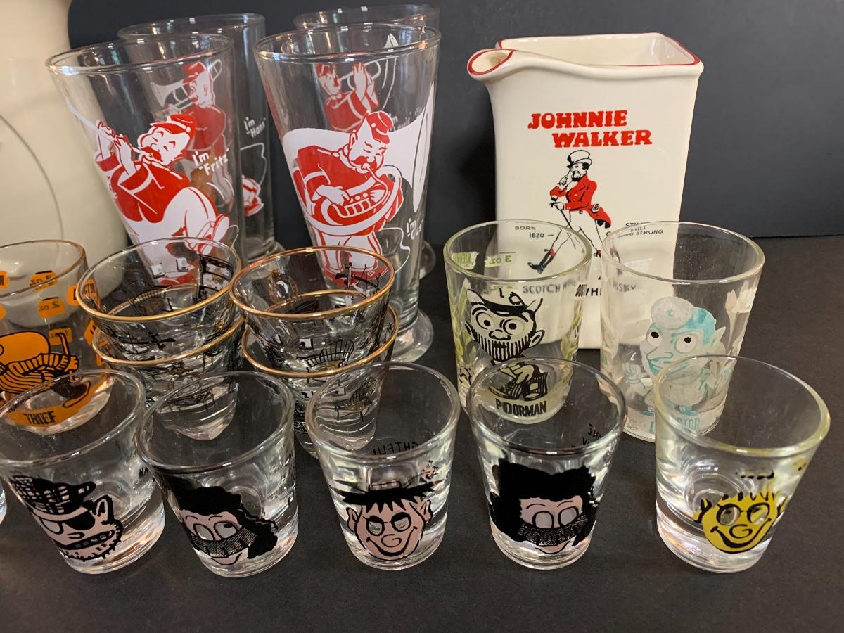 Lot 91: Vintage Bar Glasses, Wade Regicor Vintage Johnnie Walker Pitcher &  More