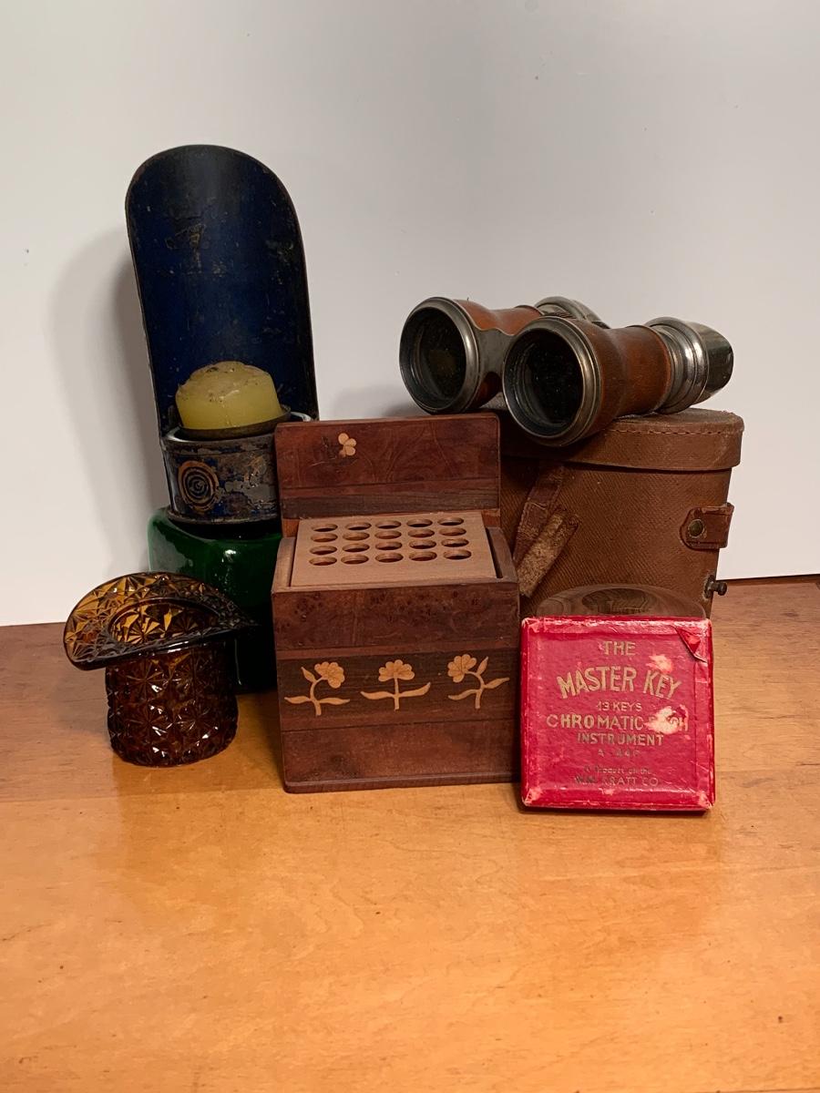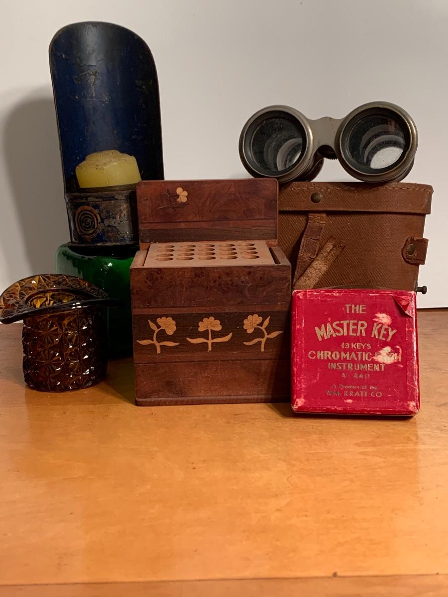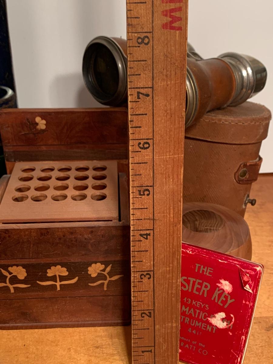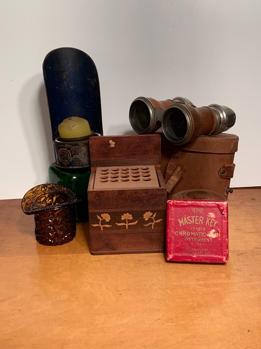 Beautiful lot of vintage/antique items: including Paris Binoculars, a gorgeous wood pencil box with flip top and Scottie Dog on top, a Master Key pitch instrument, and antique tin painted votive holder. Please see all pictures as they are the best representation of the items. The pictures show condition, measurements if taken, and what is included in the lot. Due to the large amount that we photograph and the time frame, we are not always able to take measurements. All items unless noted, are pre-owned and have been used. If you purchased furniture, you must bring help. We do not allow one person to carry large furniture out on their own. Bring help, tools and a truck for the safety of our client’s homes, and your personal safety. Company policy. Thank you.