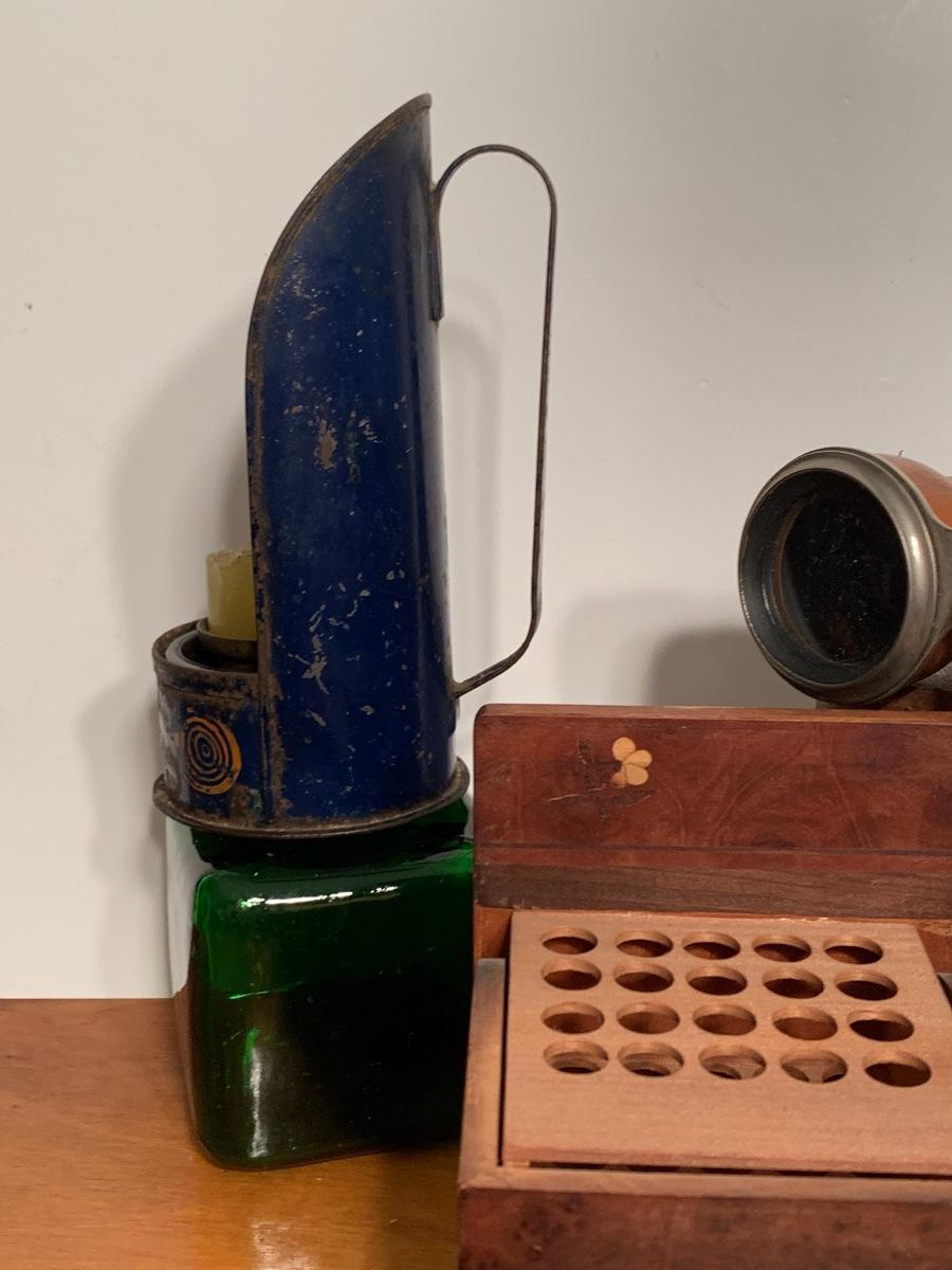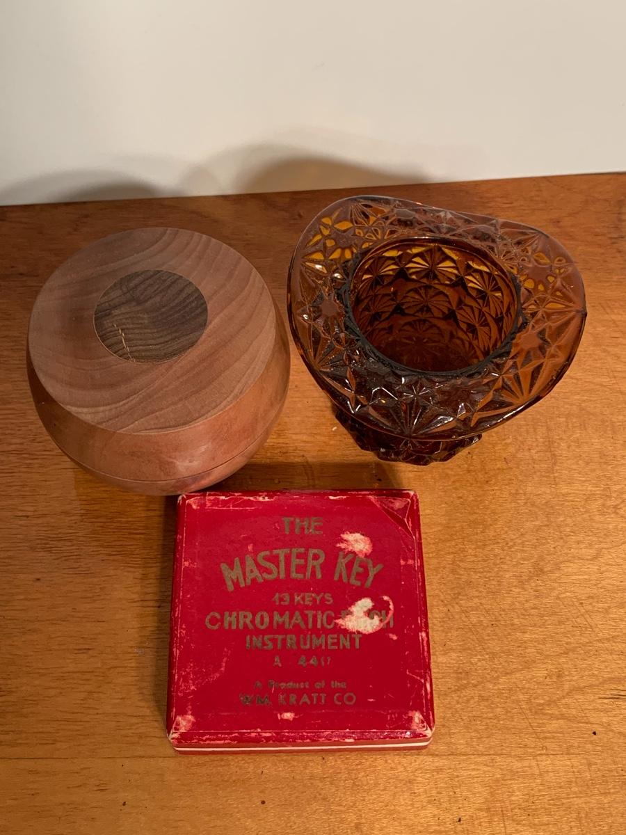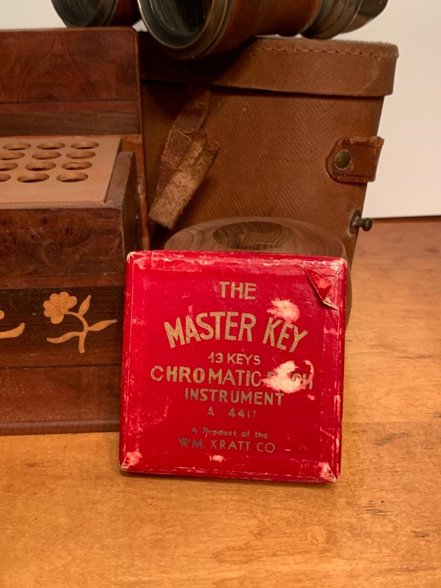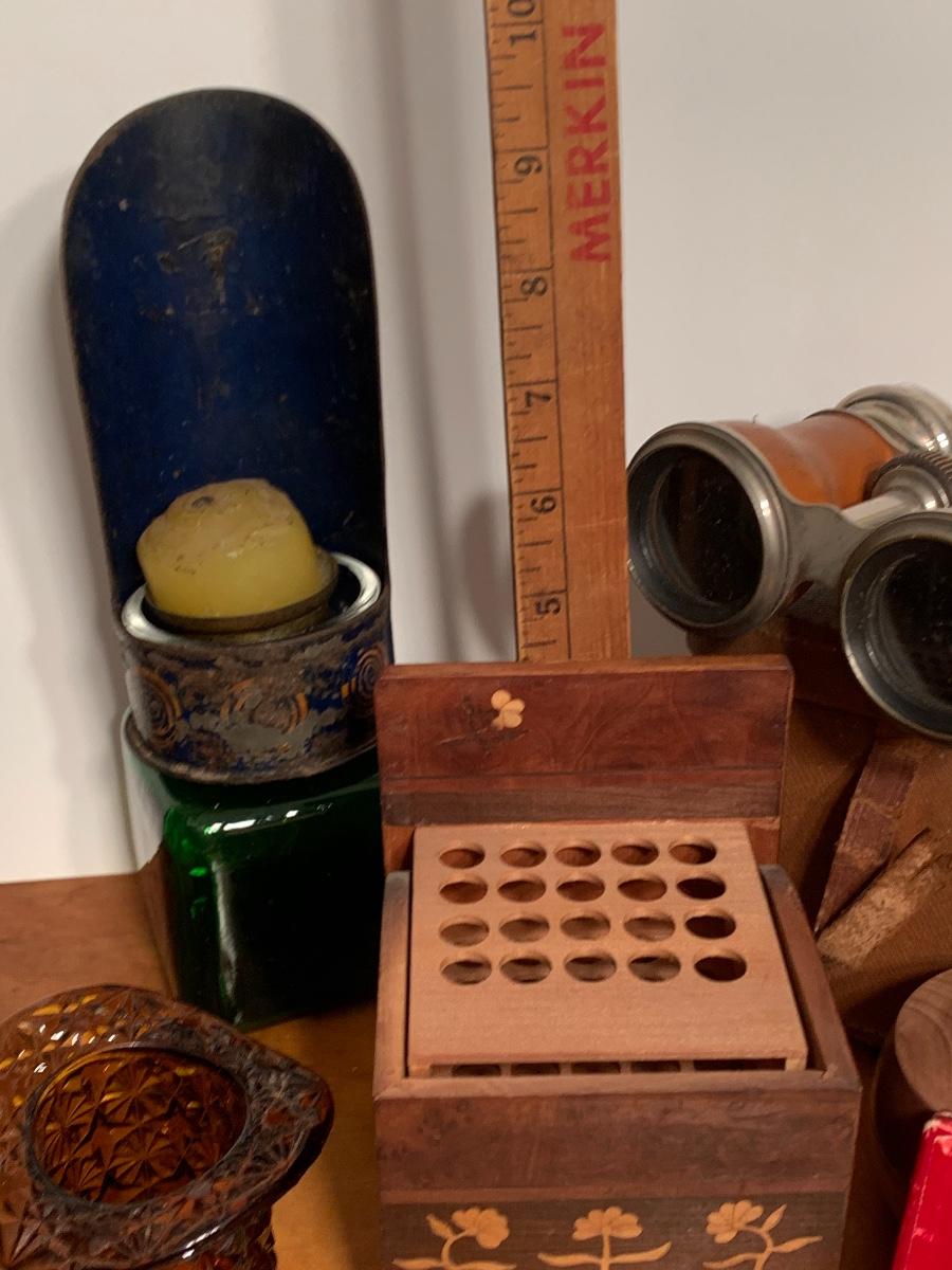 Beautiful lot of vintage/antique items: including Paris Binoculars, a gorgeous wood pencil box with flip top and Scottie Dog on top, a Master Key pitch instrument, and antique tin painted votive holder. Please see all pictures as they are the best representation of the items. The pictures show condition, measurements if taken, and what is included in the lot. Due to the large amount that we photograph and the time frame, we are not always able to take measurements. All items unless noted, are pre-owned and have been used. If you purchased furniture, you must bring help. We do not allow one person to carry large furniture out on their own. Bring help, tools and a truck for the safety of our client’s homes, and your personal safety. Company policy. Thank you.