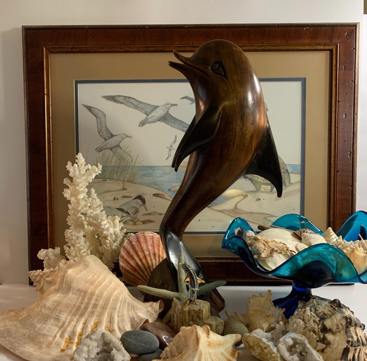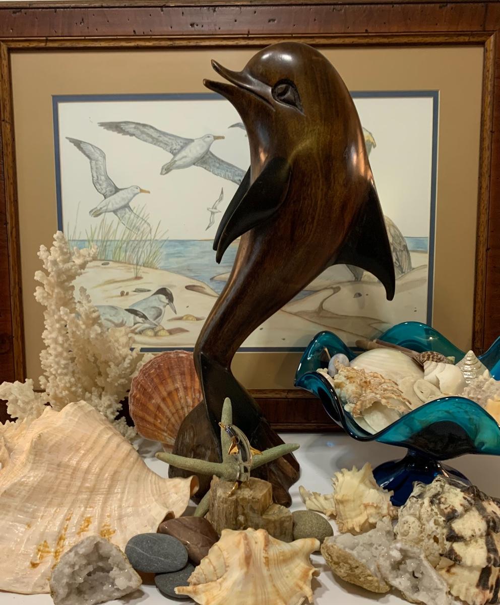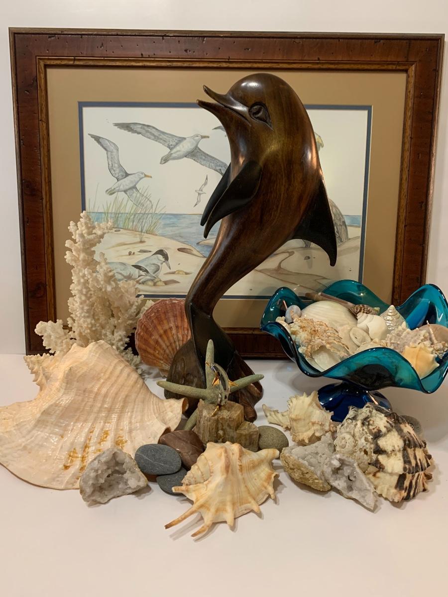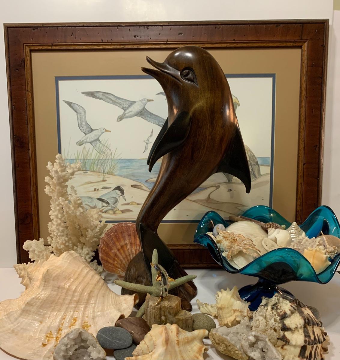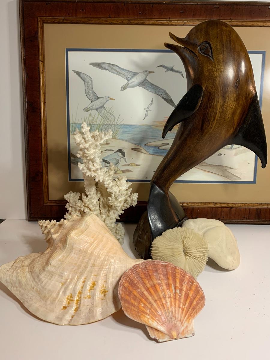 This lot has everything you need to make you feel like you are at the beach including the seashells, There is a large carved dolphin, signed print of birds on a beach done in colored pencils, a beautiful blue dish to display the seashells.