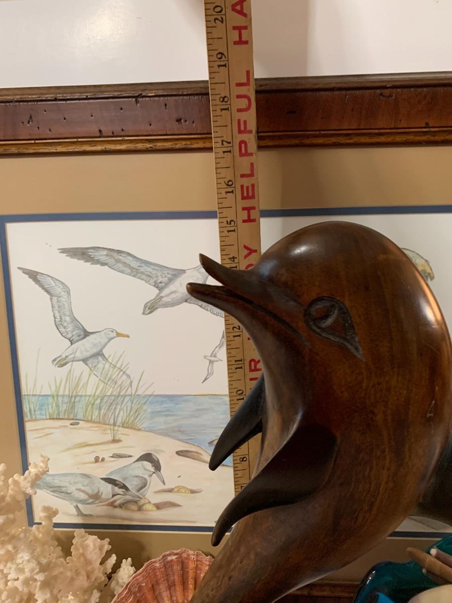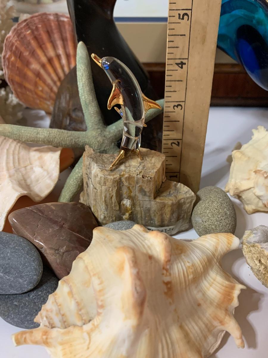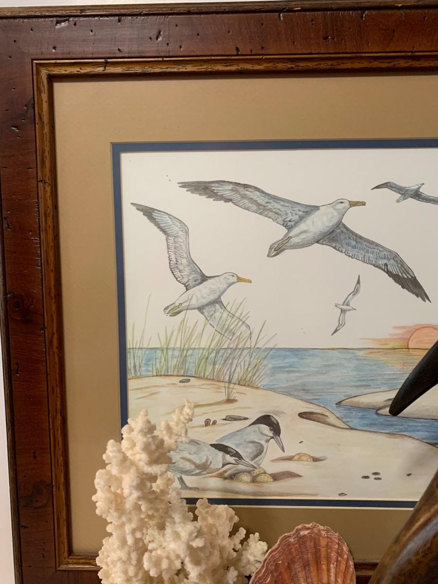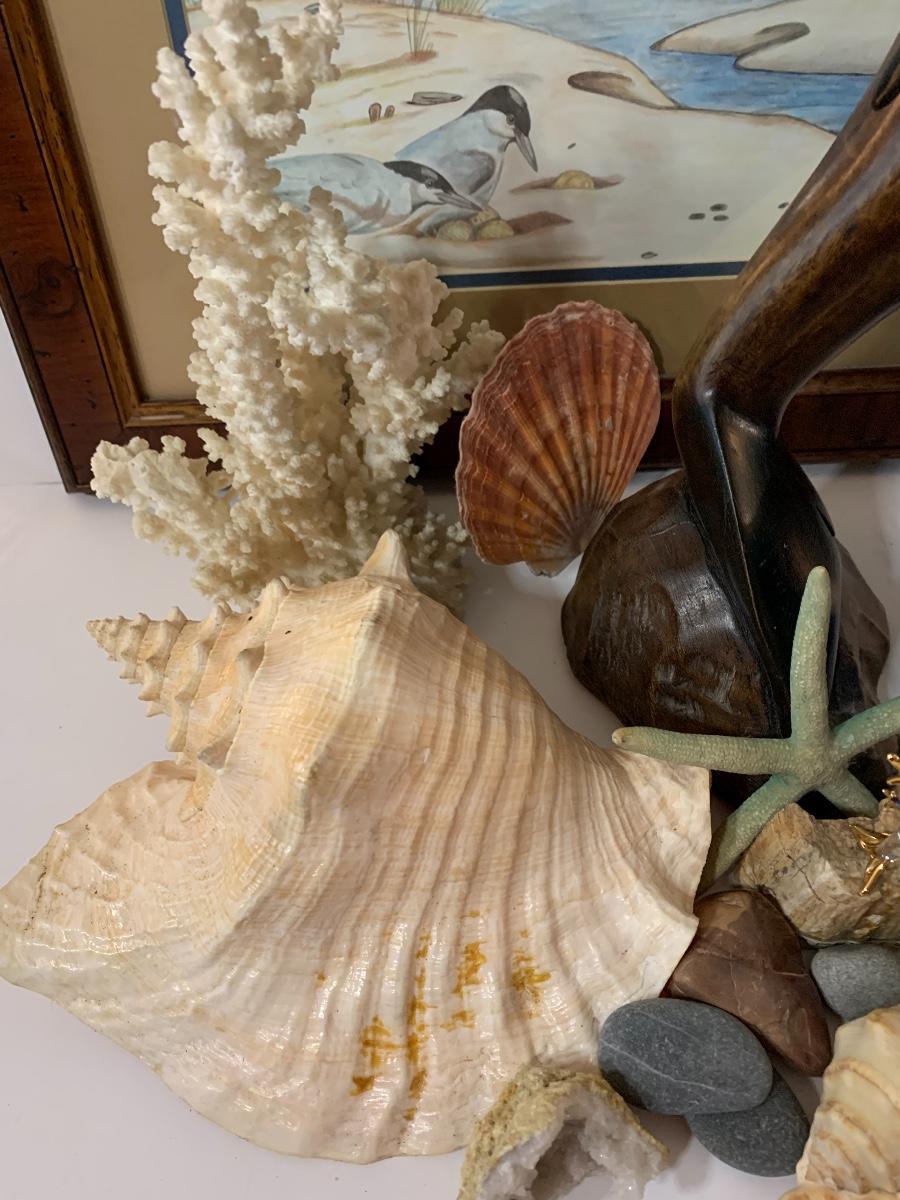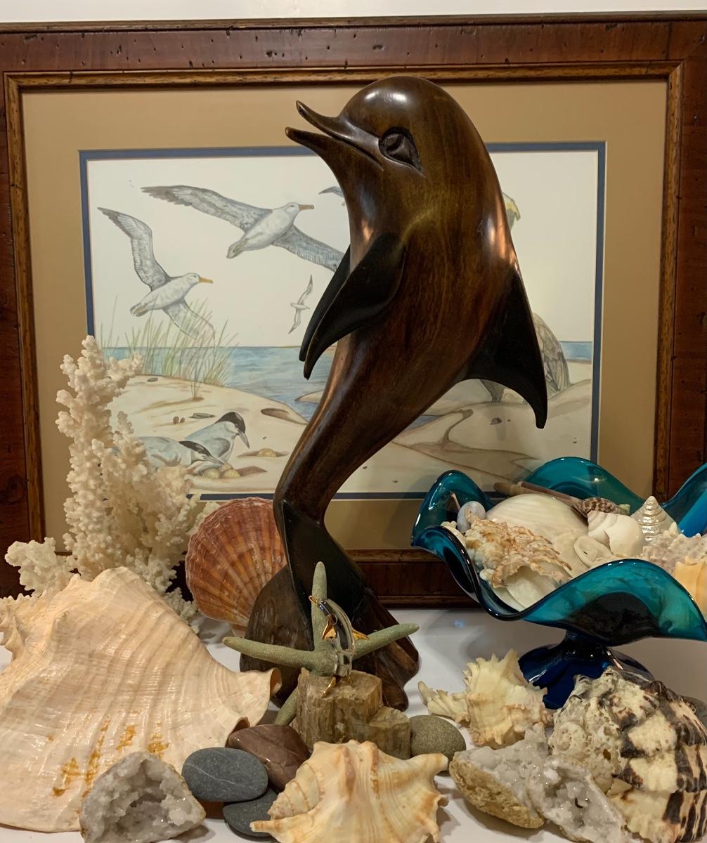 This lot has everything you need to make you feel like you are at the beach including the seashells, There is a large carved dolphin, signed print of birds on a beach done in colored pencils, a beautiful blue dish to display the seashells.