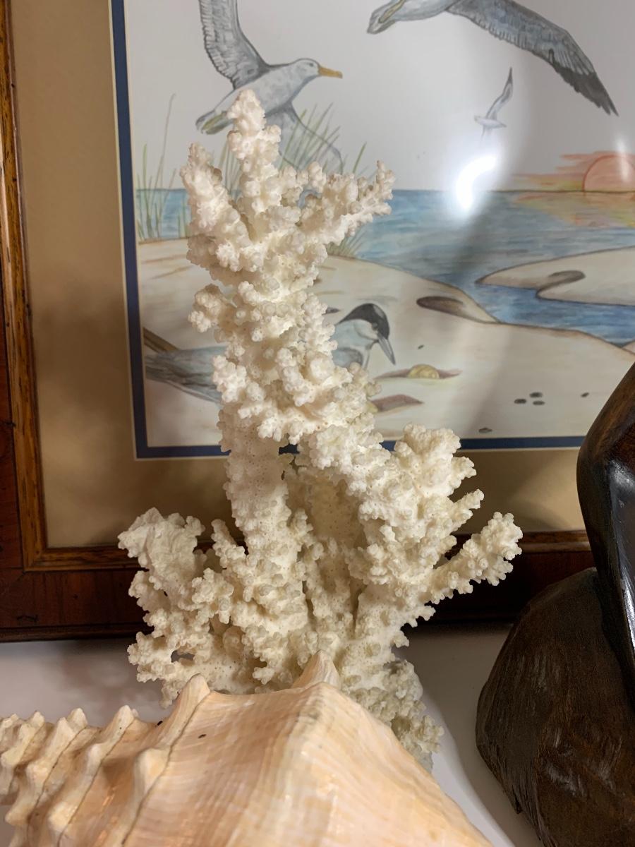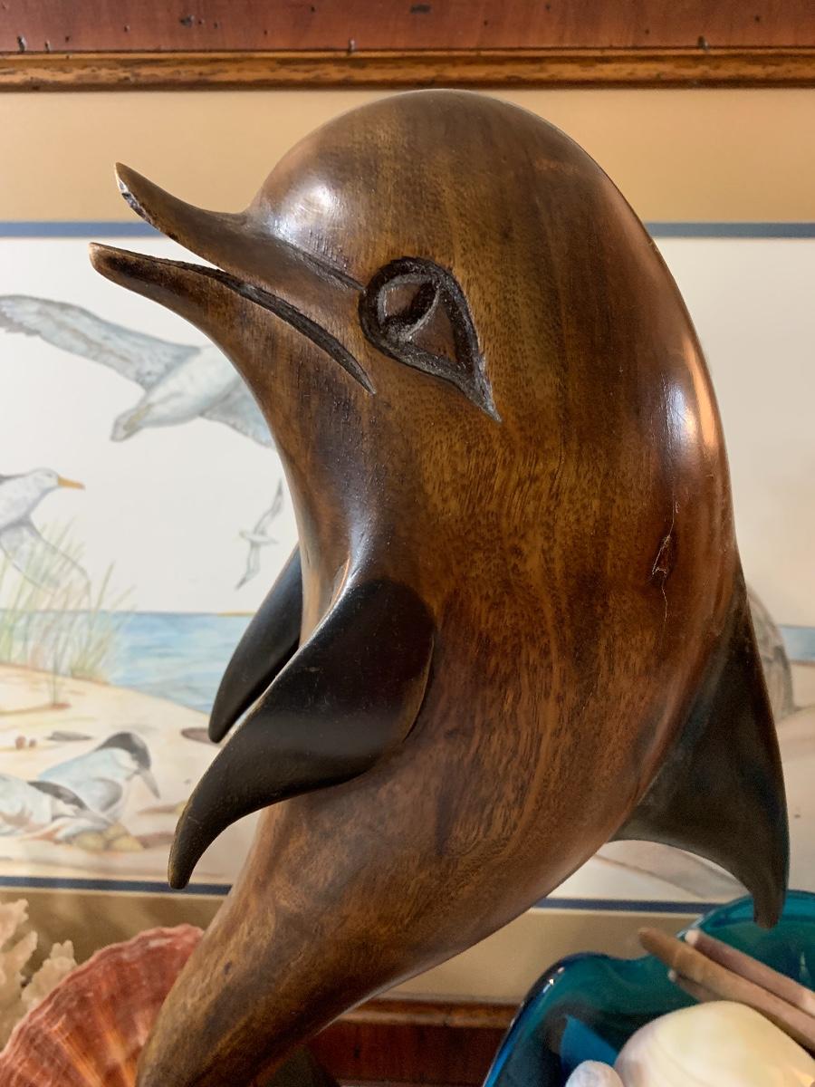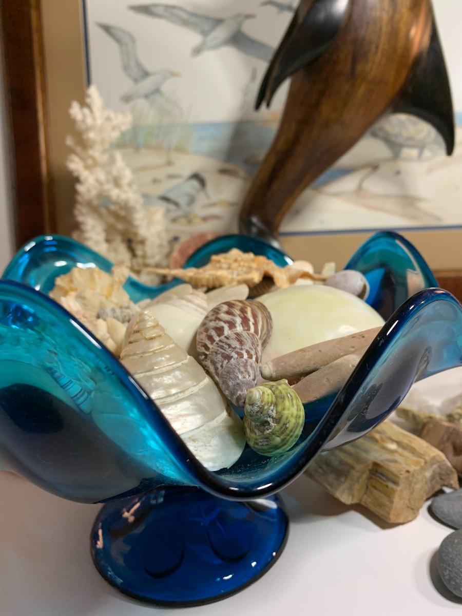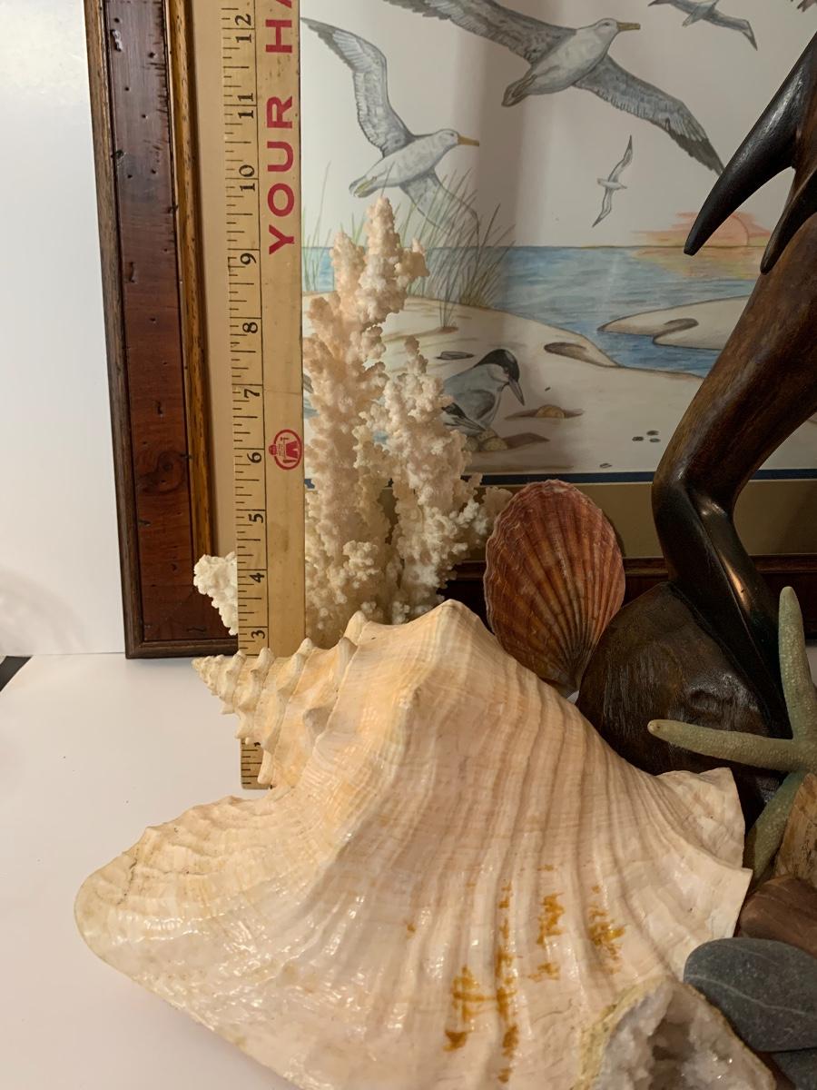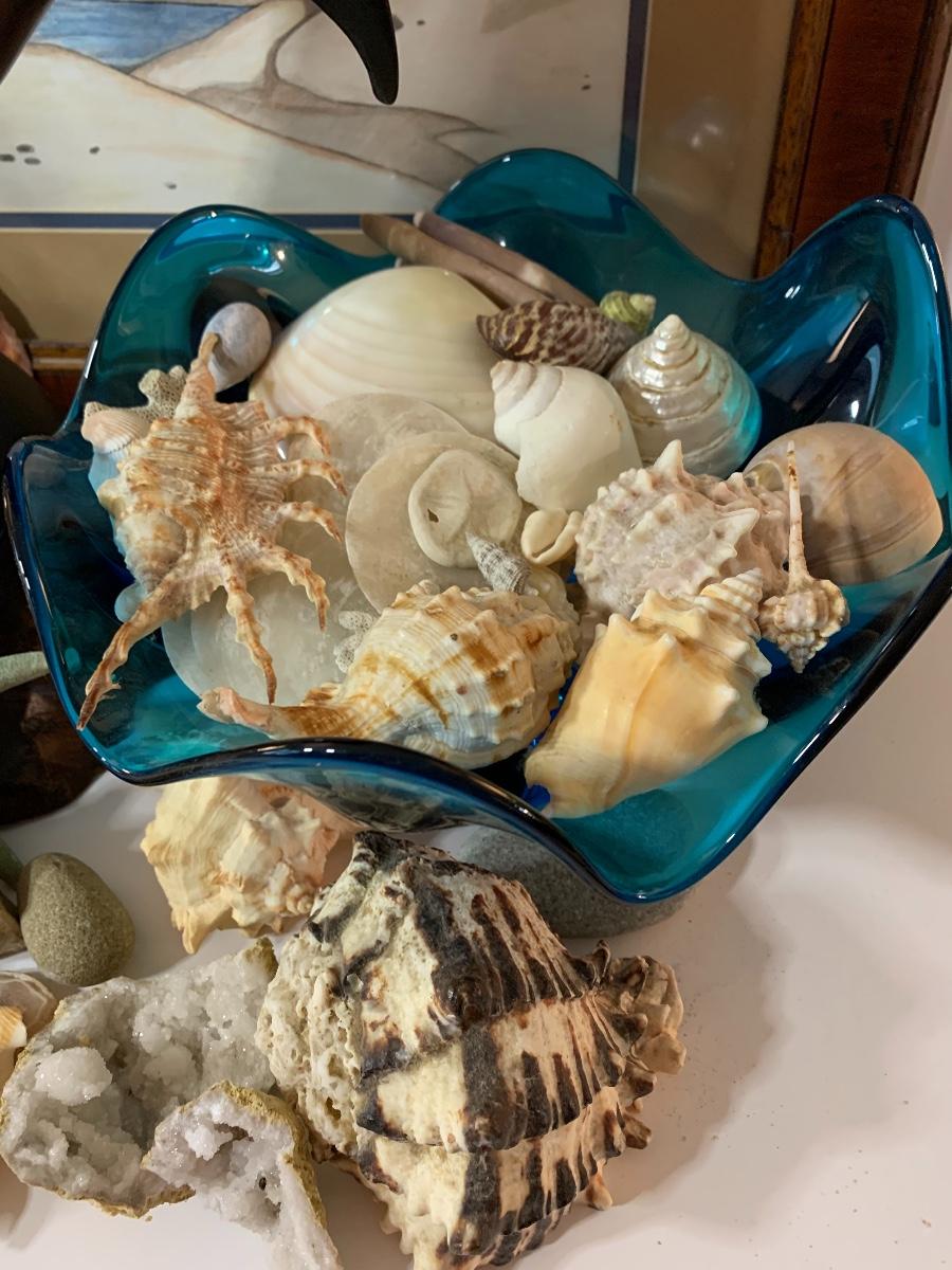 This lot has everything you need to make you feel like you are at the beach including the seashells, There is a large carved dolphin, signed print of birds on a beach done in colored pencils, a beautiful blue dish to display the seashells.