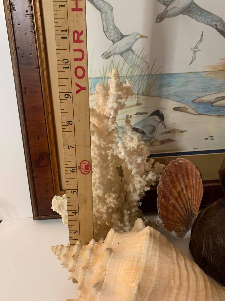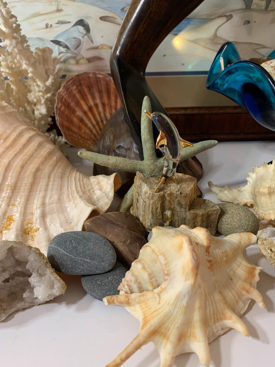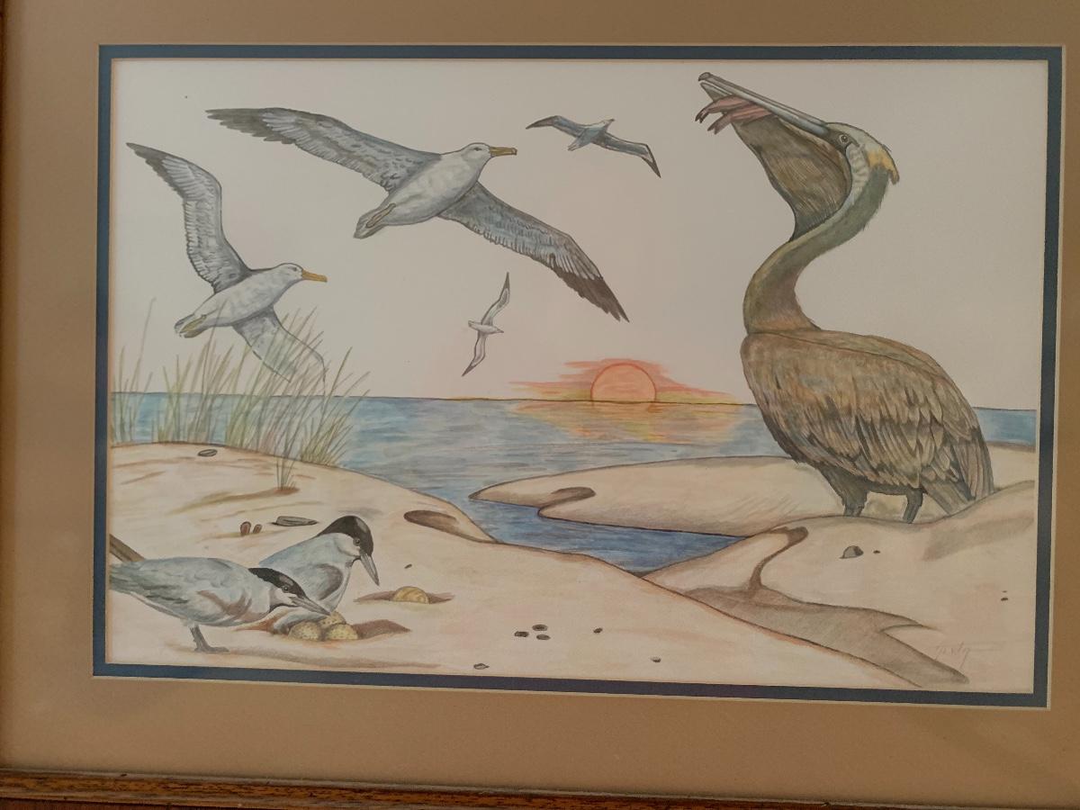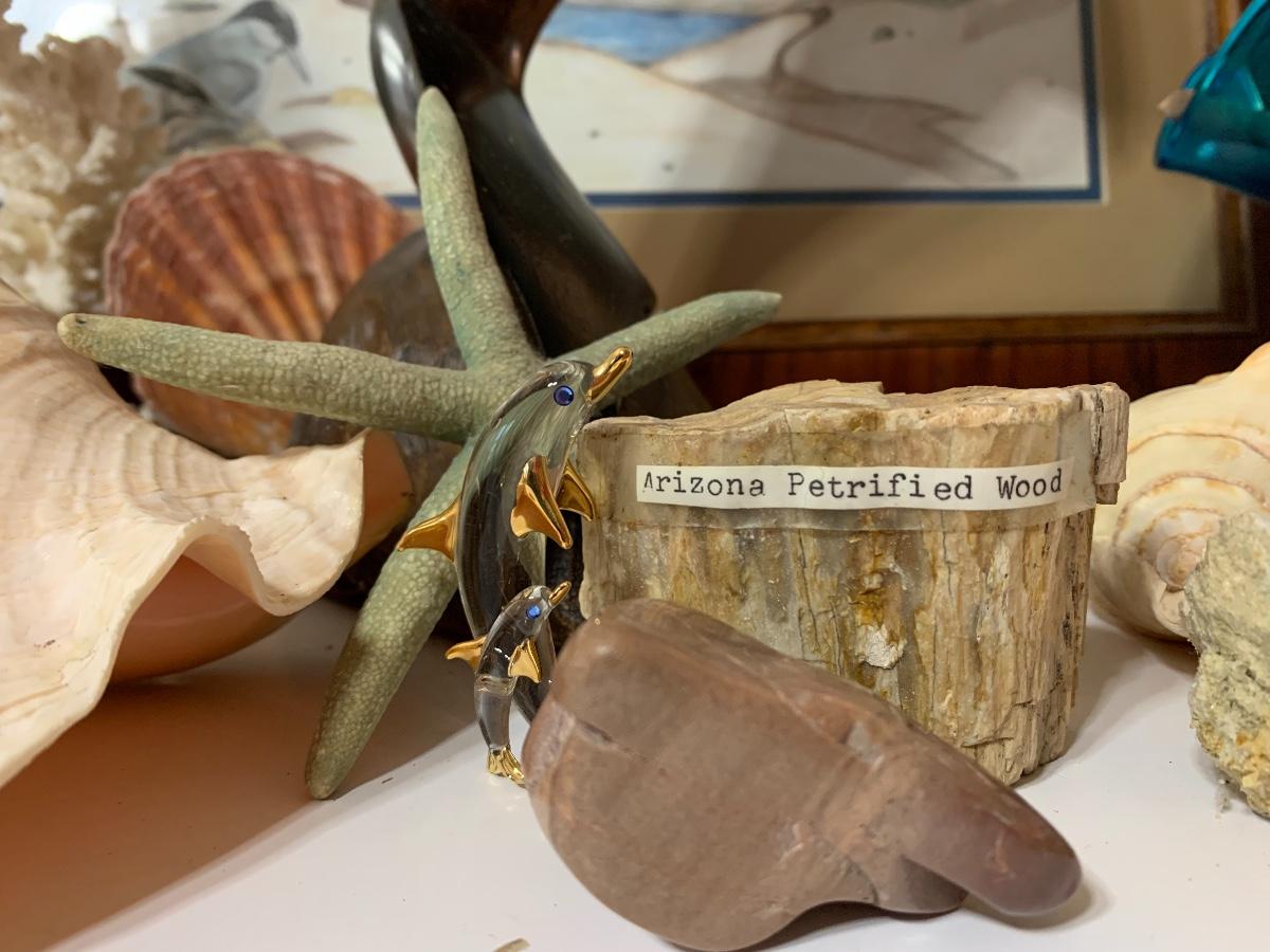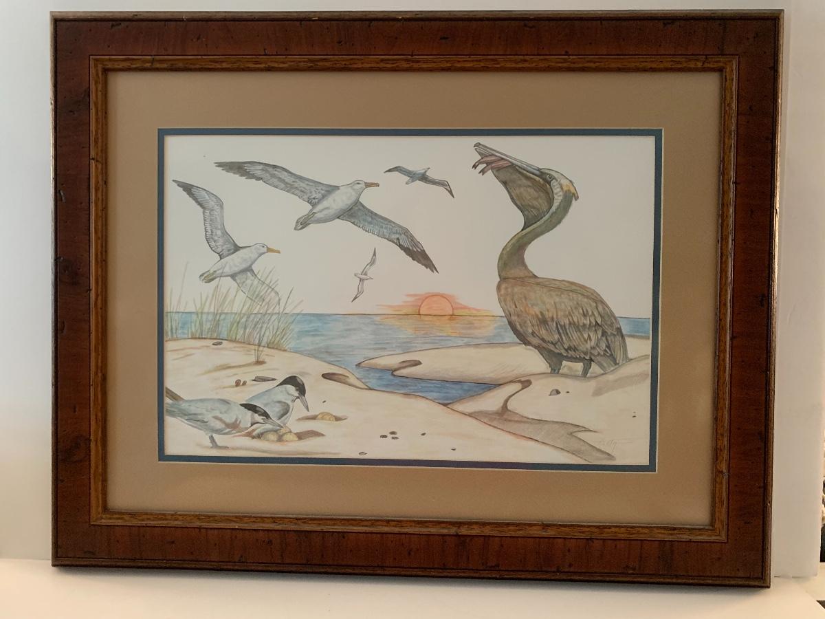 This lot has everything you need to make you feel like you are at the beach including the seashells, There is a large carved dolphin, signed print of birds on a beach done in colored pencils, a beautiful blue dish to display the seashells.