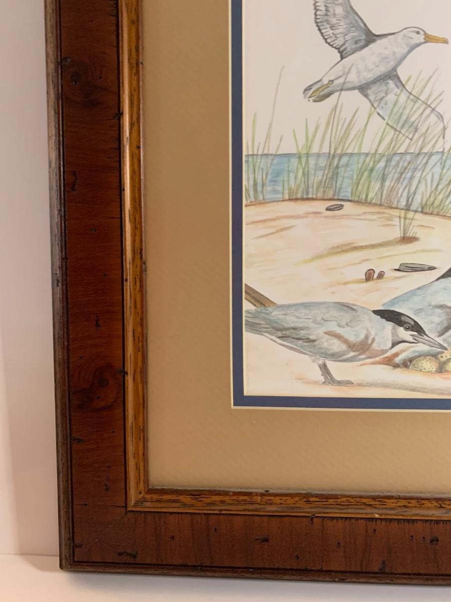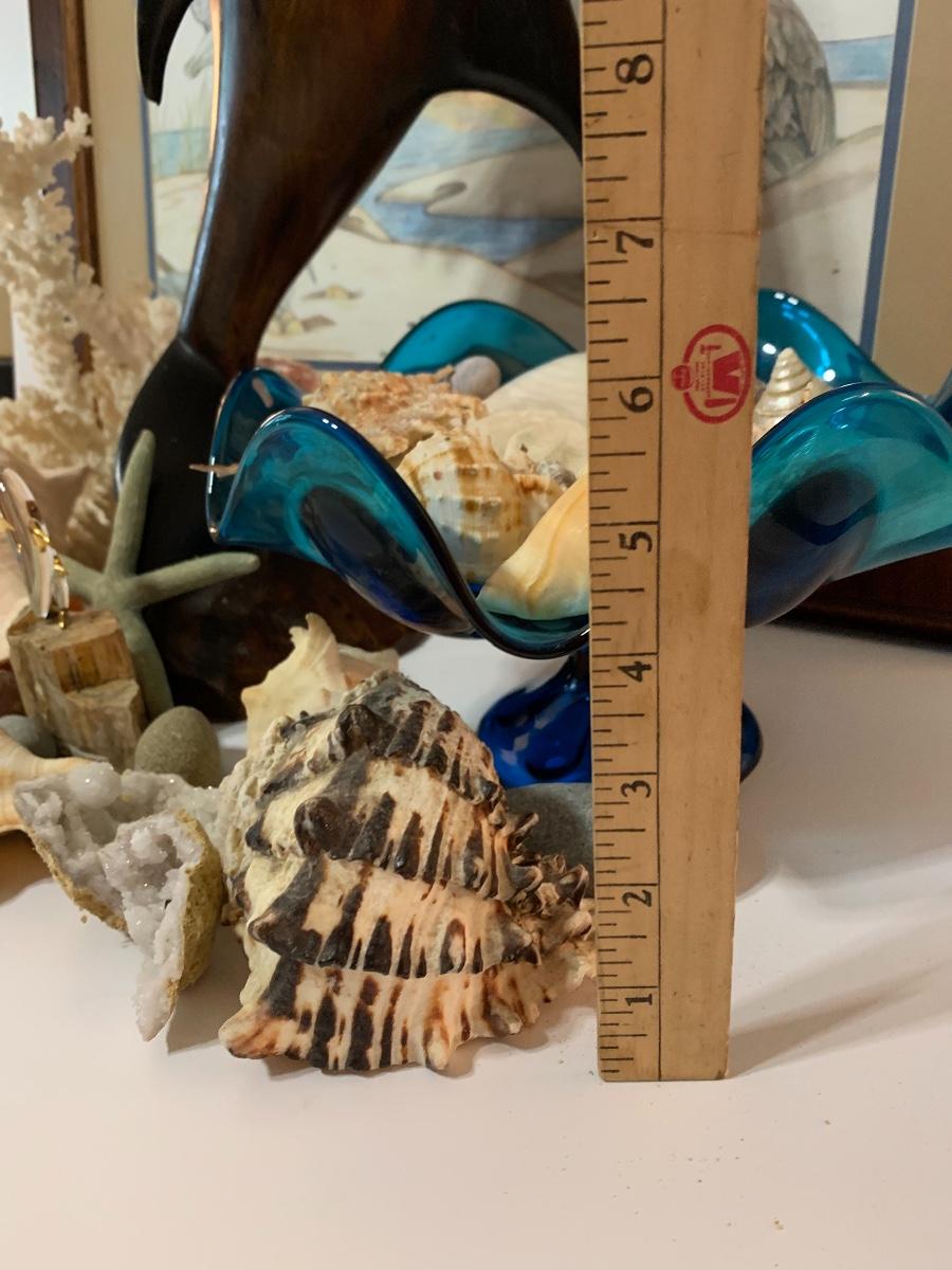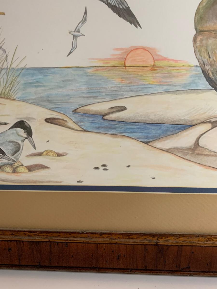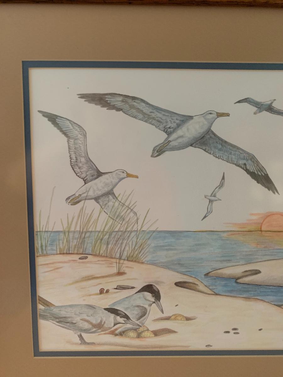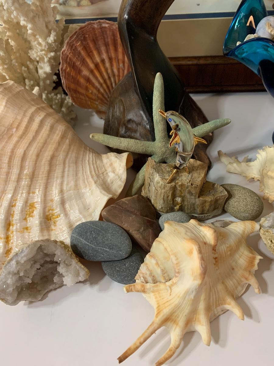 This lot has everything you need to make you feel like you are at the beach including the seashells, There is a large carved dolphin, signed print of birds on a beach done in colored pencils, a beautiful blue dish to display the seashells.