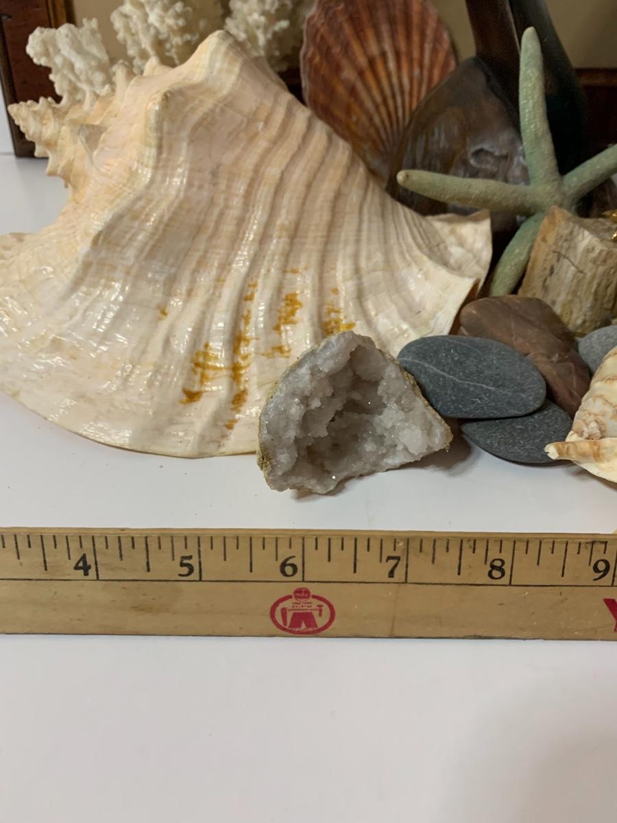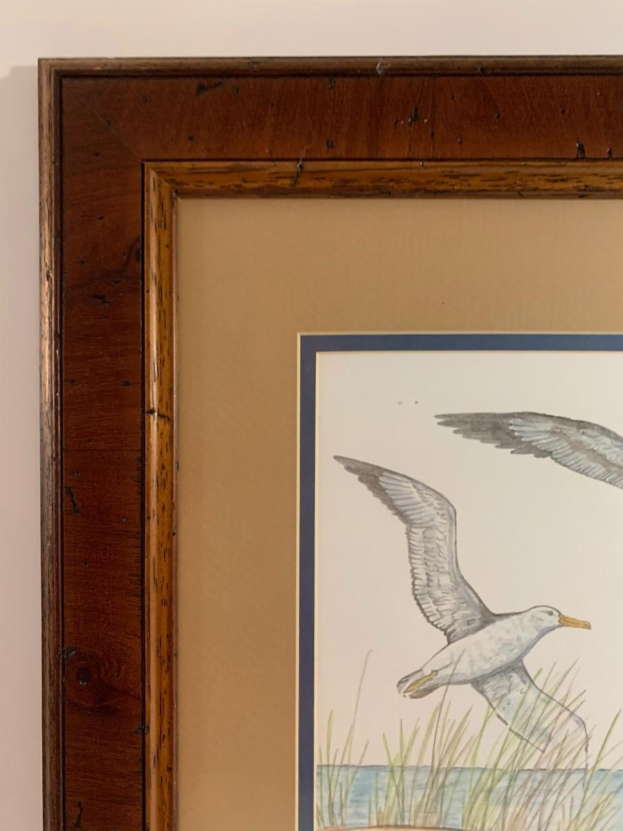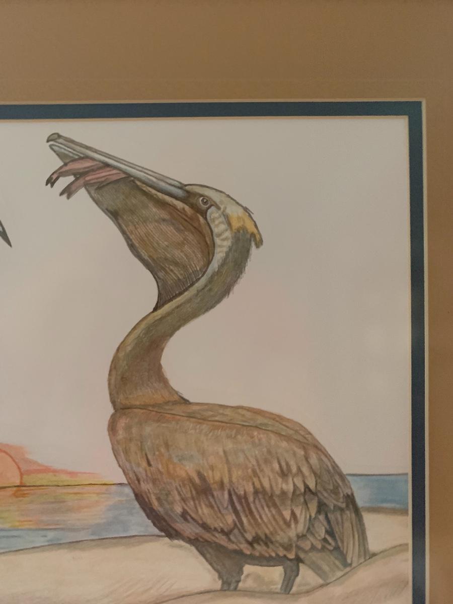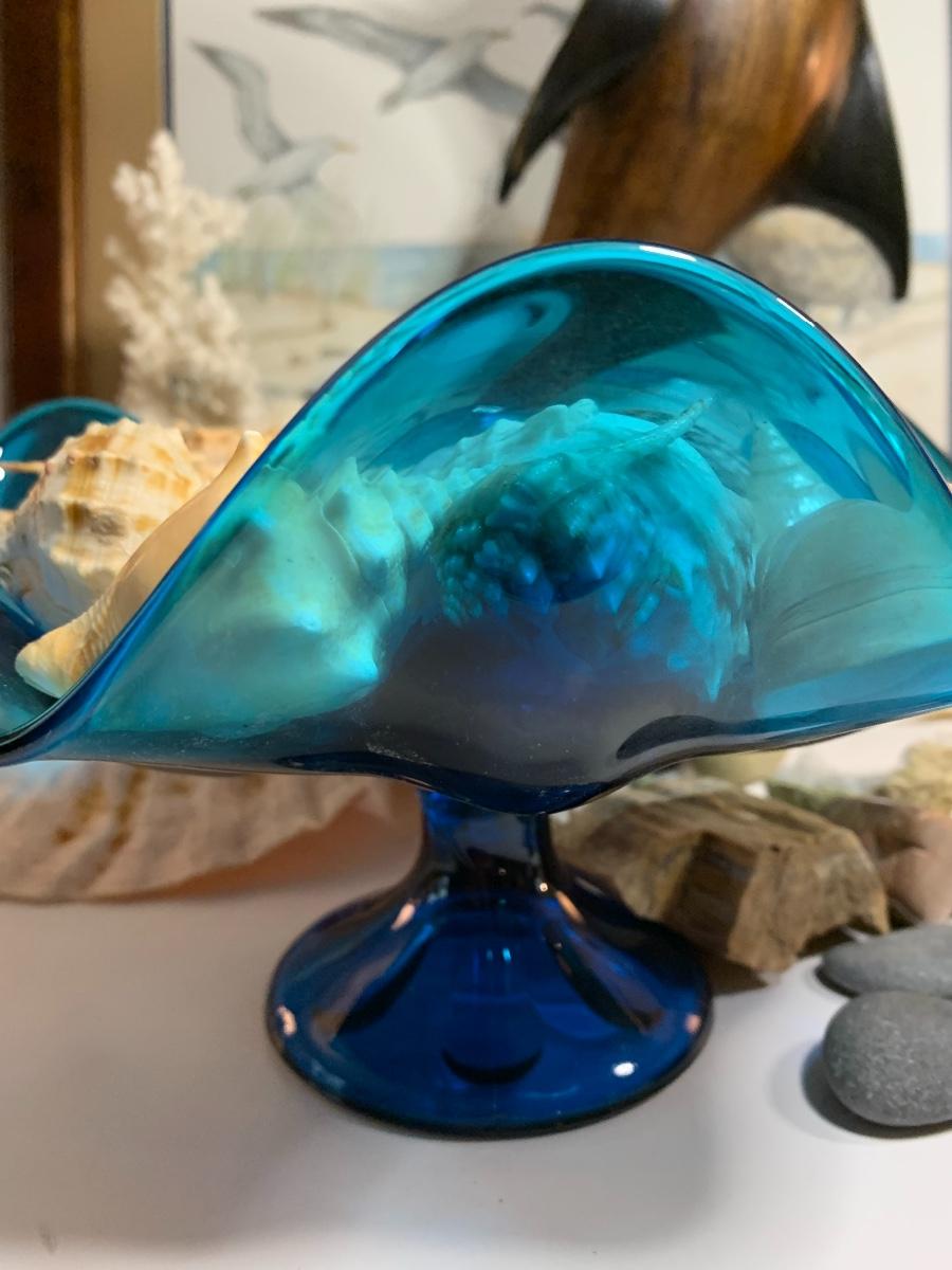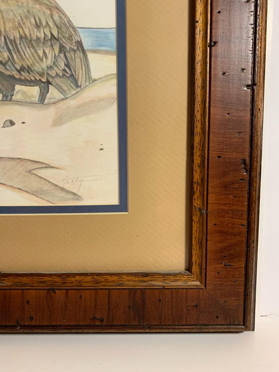 This lot has everything you need to make you feel like you are at the beach including the seashells, There is a large carved dolphin, signed print of birds on a beach done in colored pencils, a beautiful blue dish to display the seashells.