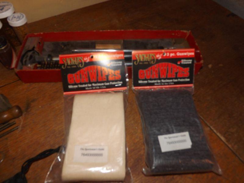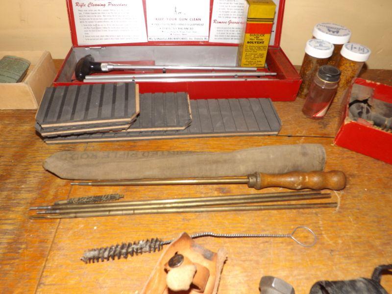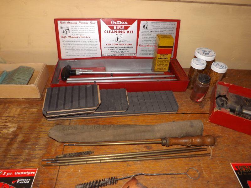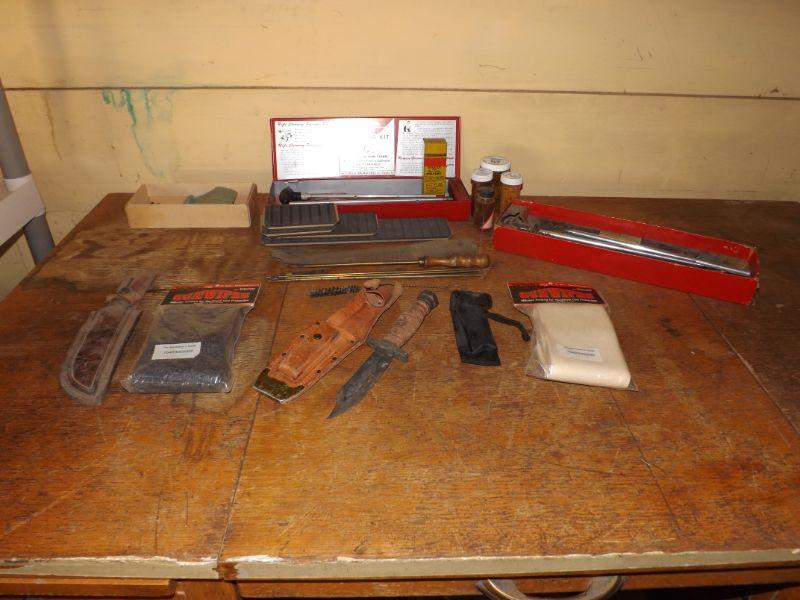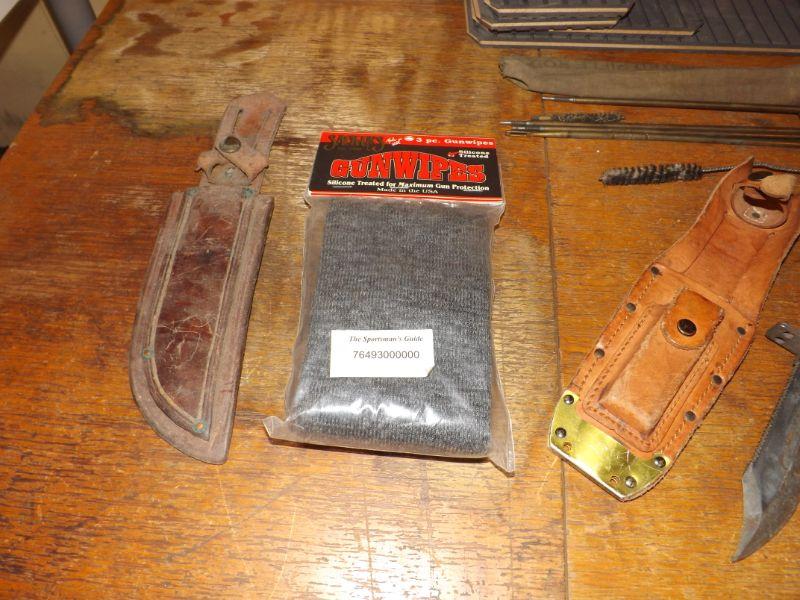 SEVERAL RIFLE CLEANING KITS, HUNTING KNIFE, GUNWIPES & MORE