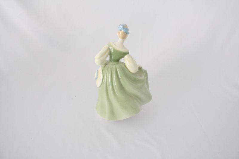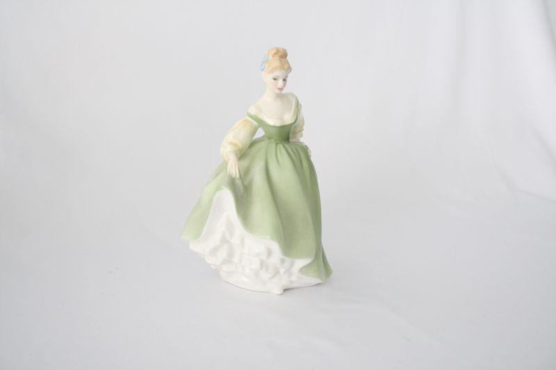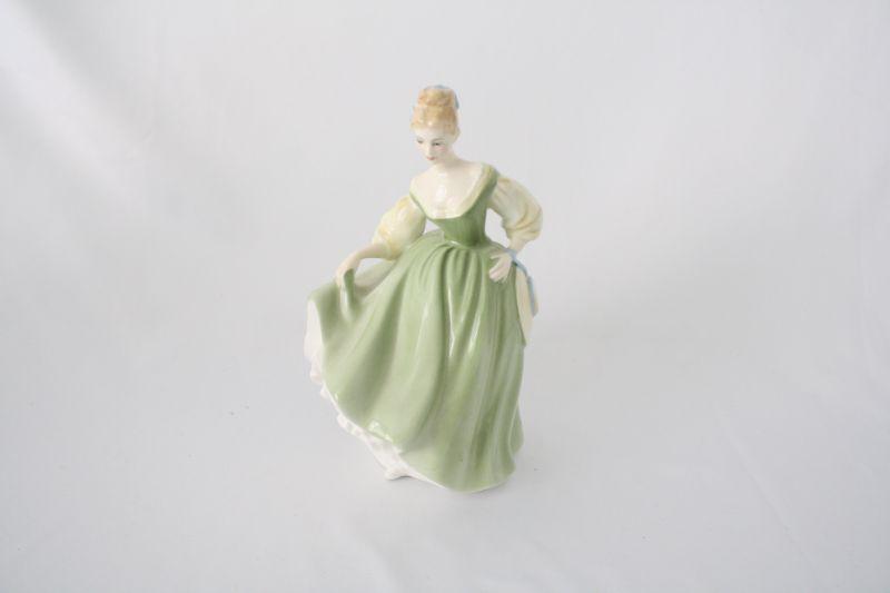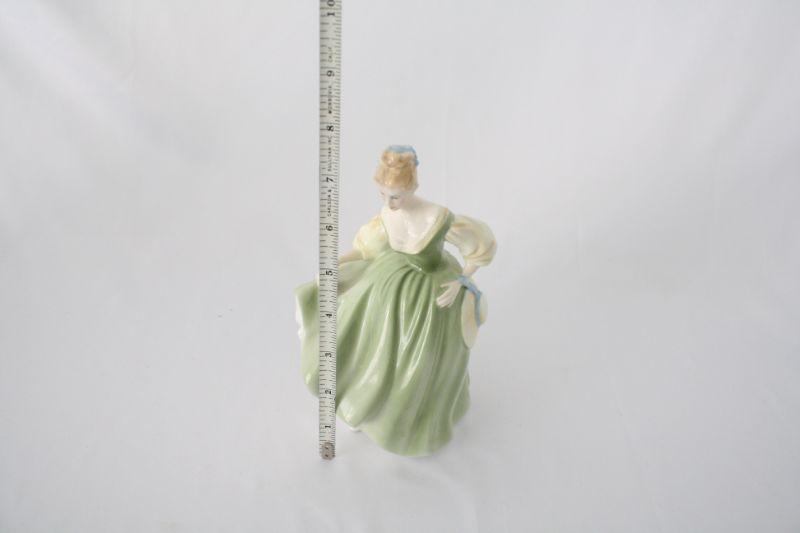 Royal Doulton 1962 Fair Lady Painted Bone China Figurine - This dainty and delicate now retired figurine was made in 1962 by Royal Doulton. The lady is wearing a green dress with white underlay. In excellent condition with no marks or chips. The figurine is 7.5" inches tall.