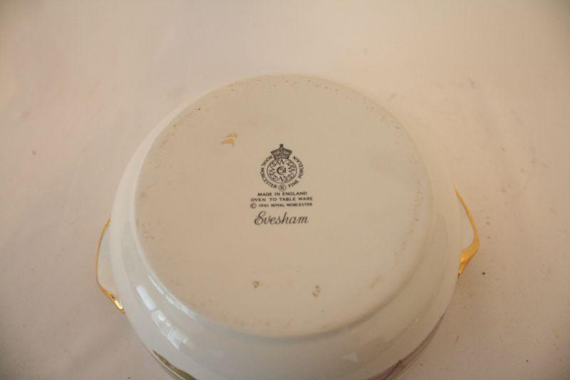 Royal Worcester English Porcelain Evesham Casserole Dish 1961 - This porcelain casserole dish made by Royal Worcester is stamped with their logo and "oven to tableware" "1961 Royal Worcester" and pattern "Evesham". The dish has gold accents and fruit and vegetables painted all over.