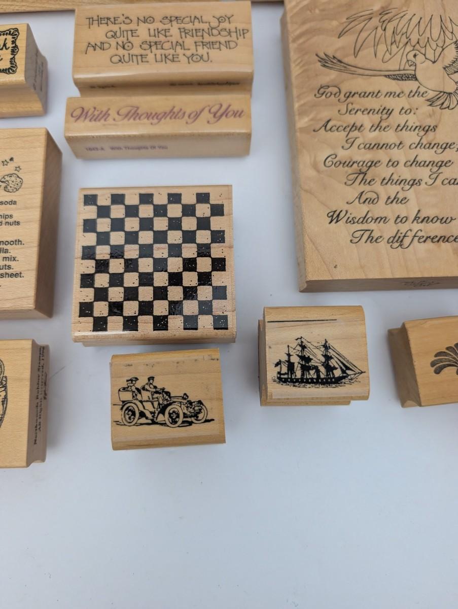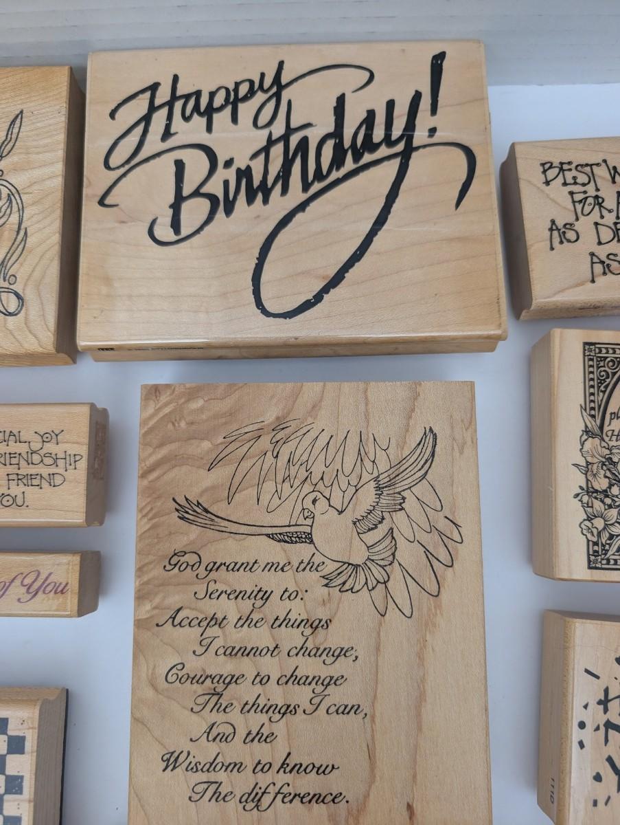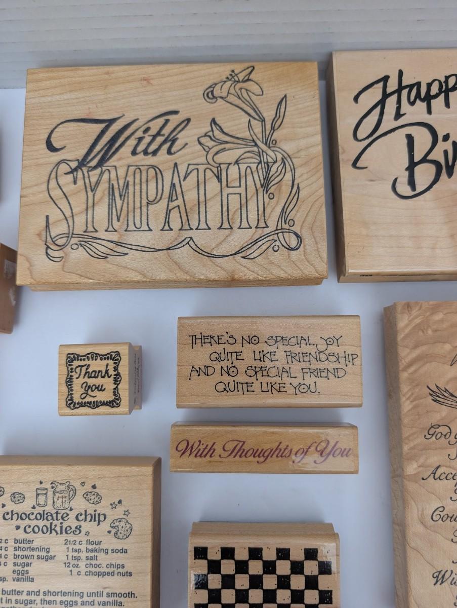 Assorted lot of wood-mounted rubber stamps featuring a variety of themes including sympathy, birthday, New Year, inspirational quotes, decorative designs, and novelty motifs like faces, checkerboard, fan, and even a chocolate chip cookie recipe. Great mixed set for card making, journaling, or scrapbooking.
