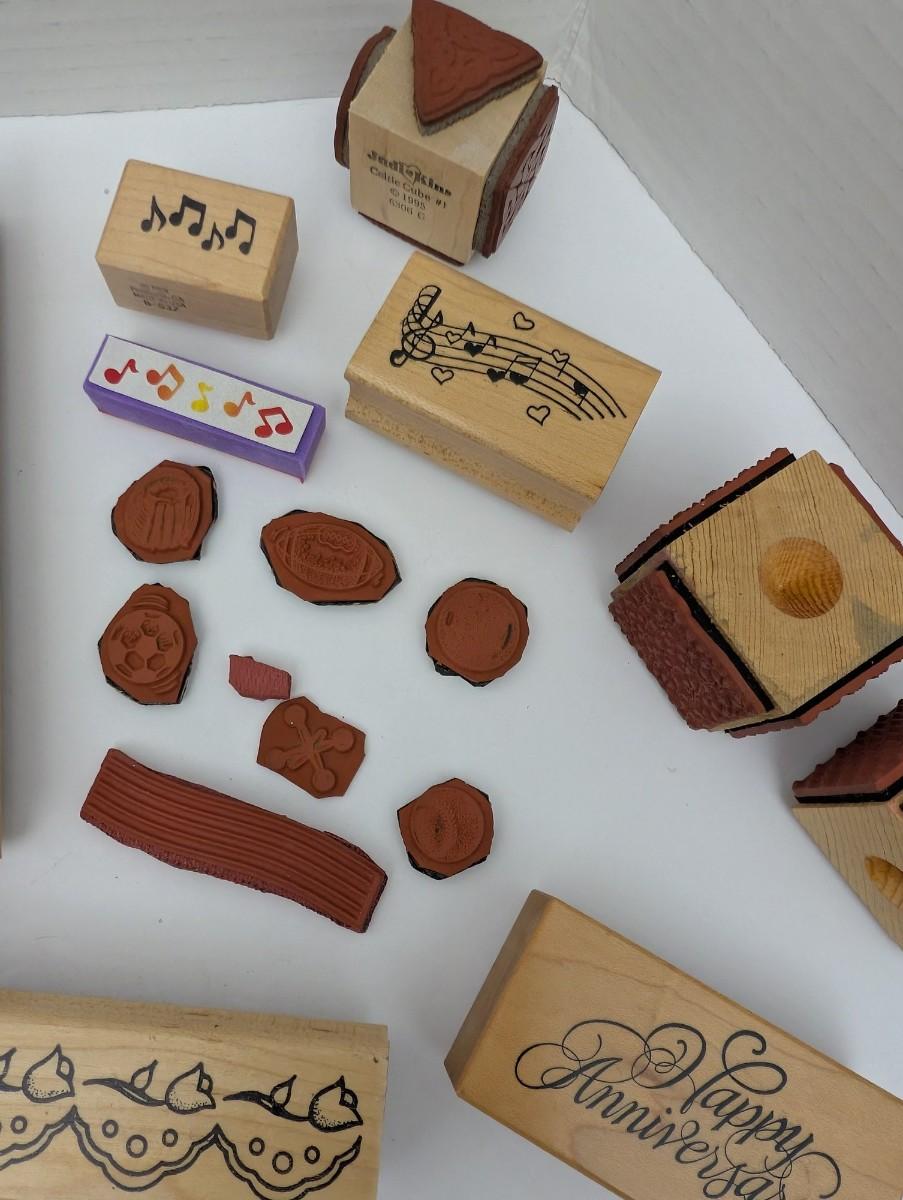 Collection of assorted wood-mounted rubber stamps featuring musical notes, treble clef, sheet music, floral and decorative borders, thank you and celebration motifs, birthday and anniversary greetings, and other crafting designs. Great mixed lot for scrapbooking, card making, and creative projects.