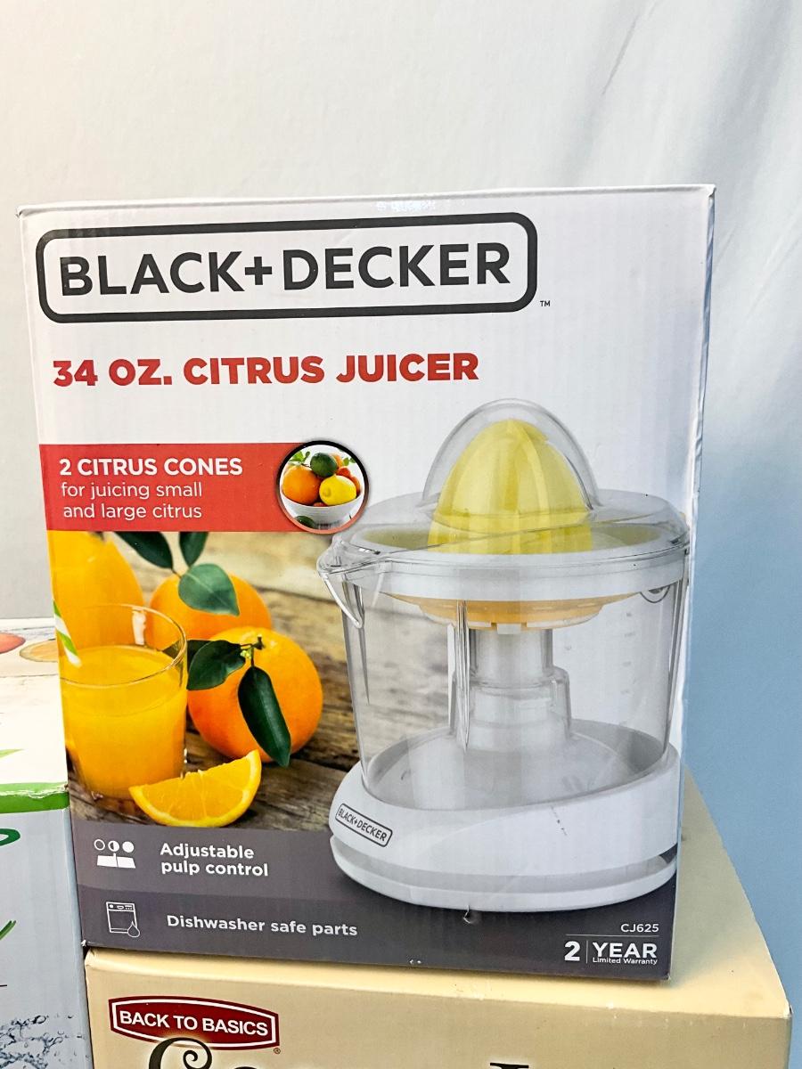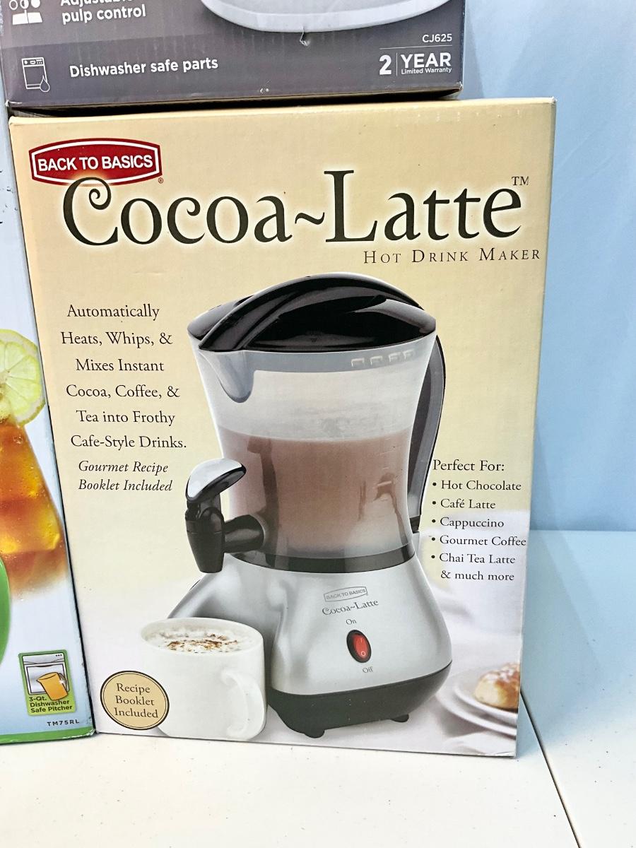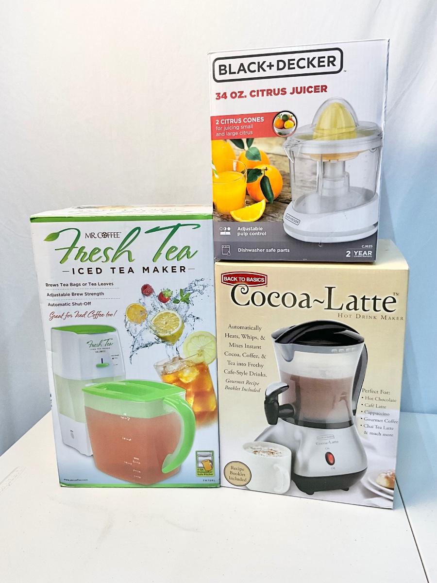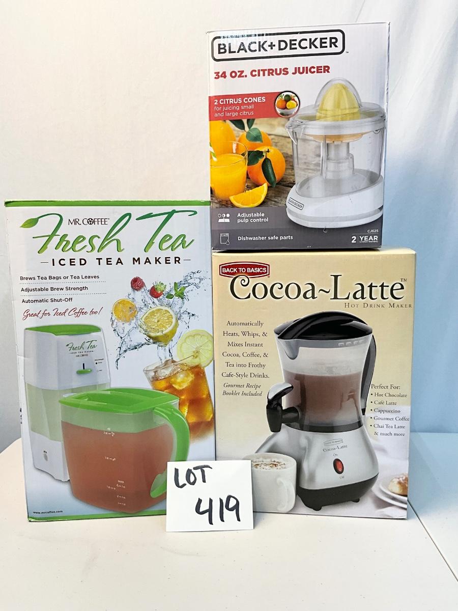 Lot S 419 NIB Mr. Coffee Fresh Tea, Iced Tea Maker /NIB Back to Basics Cocoa-Latte, Hot Drink Maker / Black&Decker 34oz Citrus Juicer